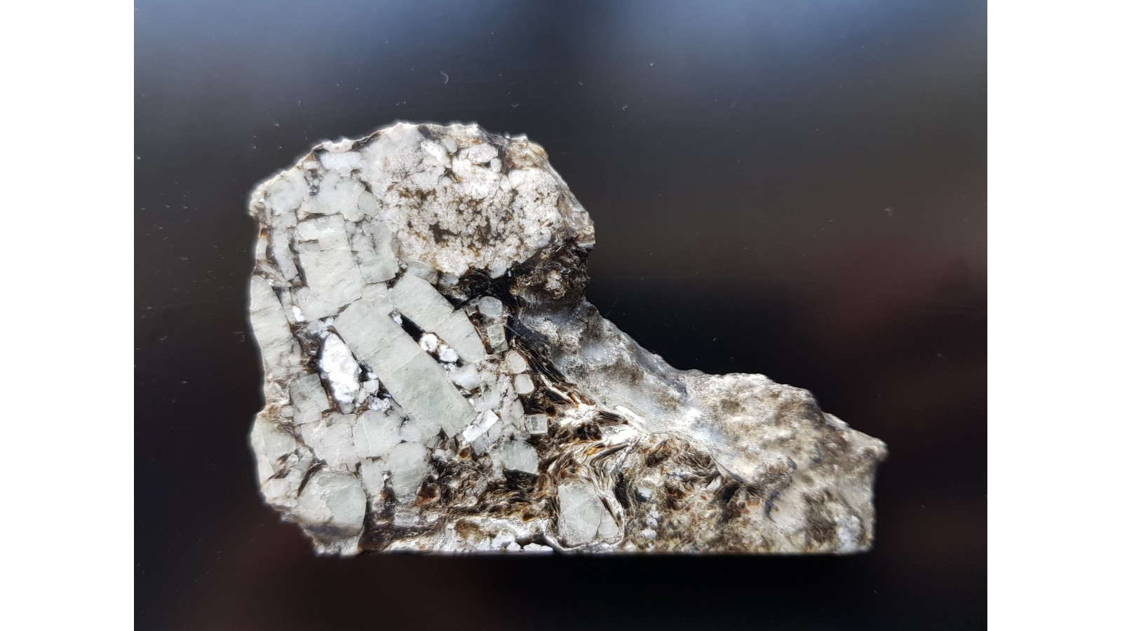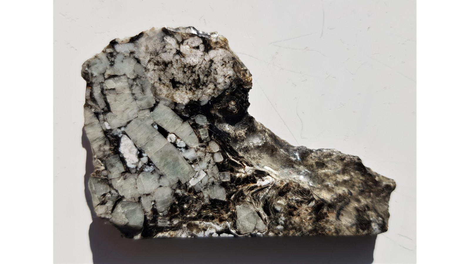 Kryształy berylu w pegmatycie desylifikowanym z kopalni magnezytu w Wirach k. Sobótki. Okaz polerowany dwustronnie. Kryształy w pegmatycie z dużą ilością flogopitu. Cała próbka przerośnięta berylami. Rzadkość mineralogiczna z polskich Sudetów. Bardzo estetyczny, kontrastowy okaz. Polecam.