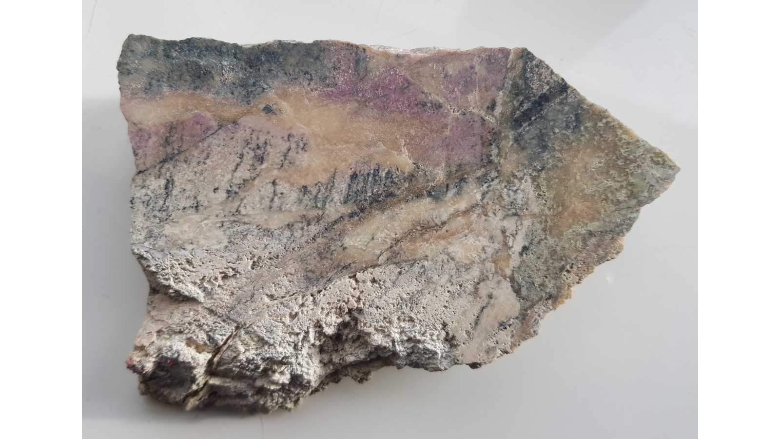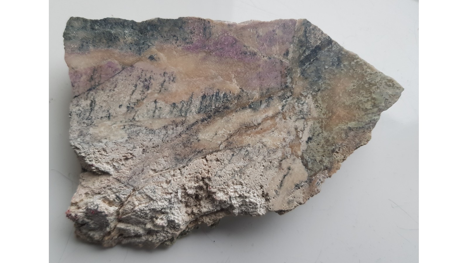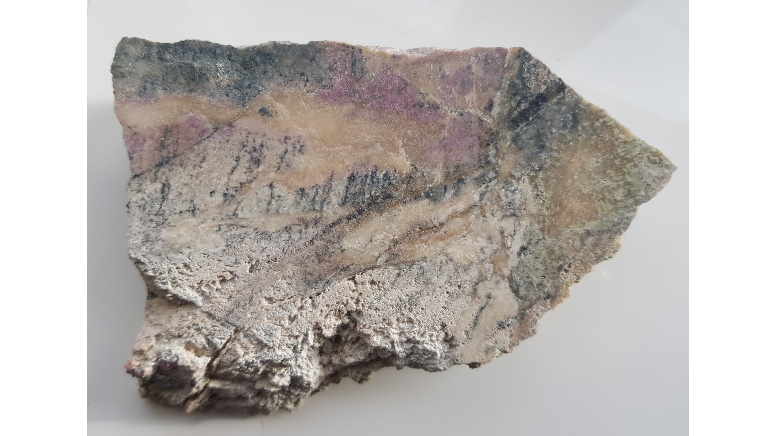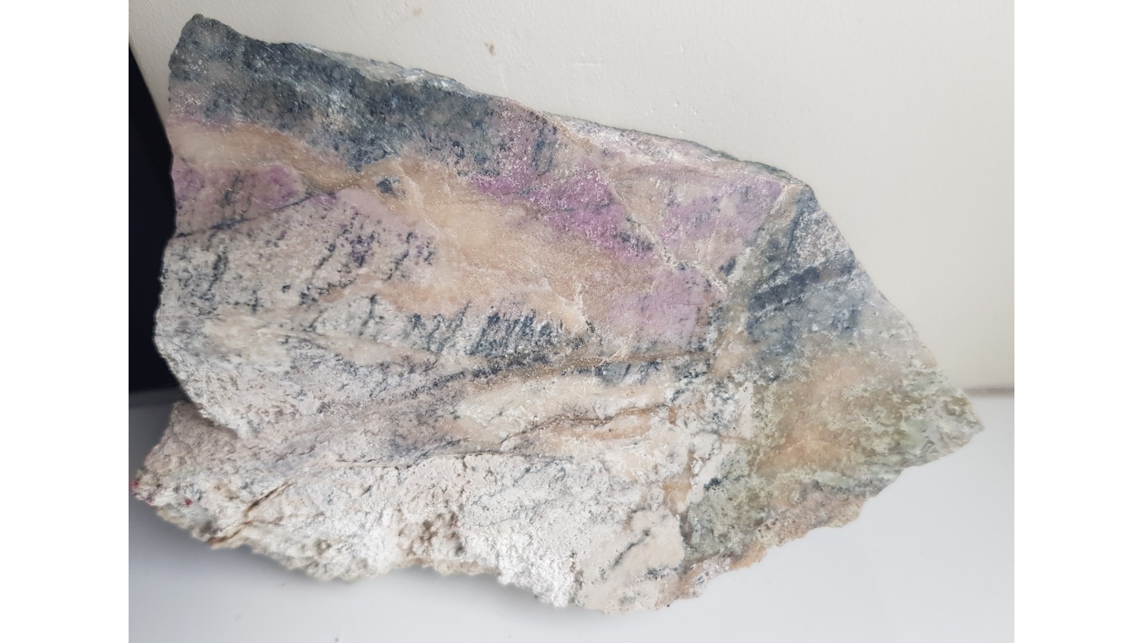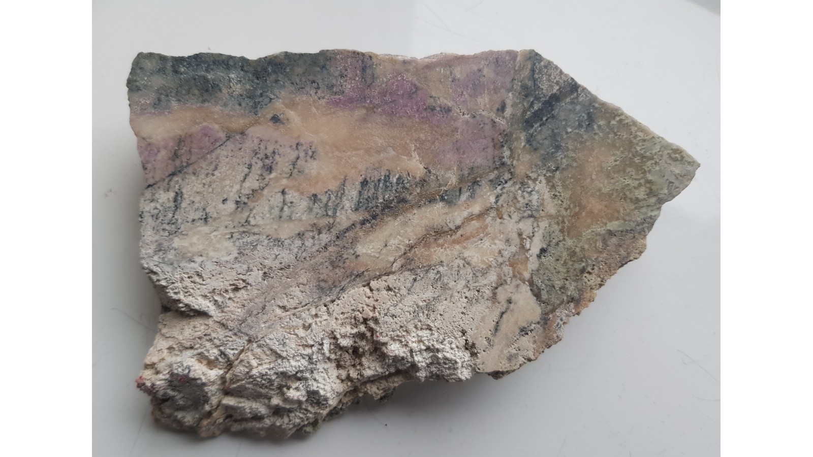 Okaz wyraziście zabarwionego rodingitu z Nasławic. Skała fioletowo-kremowo-zielona. Barwa jest pochodną obecności wezuwianu manganowego. Okaz polerowany jednostronnie, strona przeciwna po cięciu. Dosyć duży okaz. Polecam.