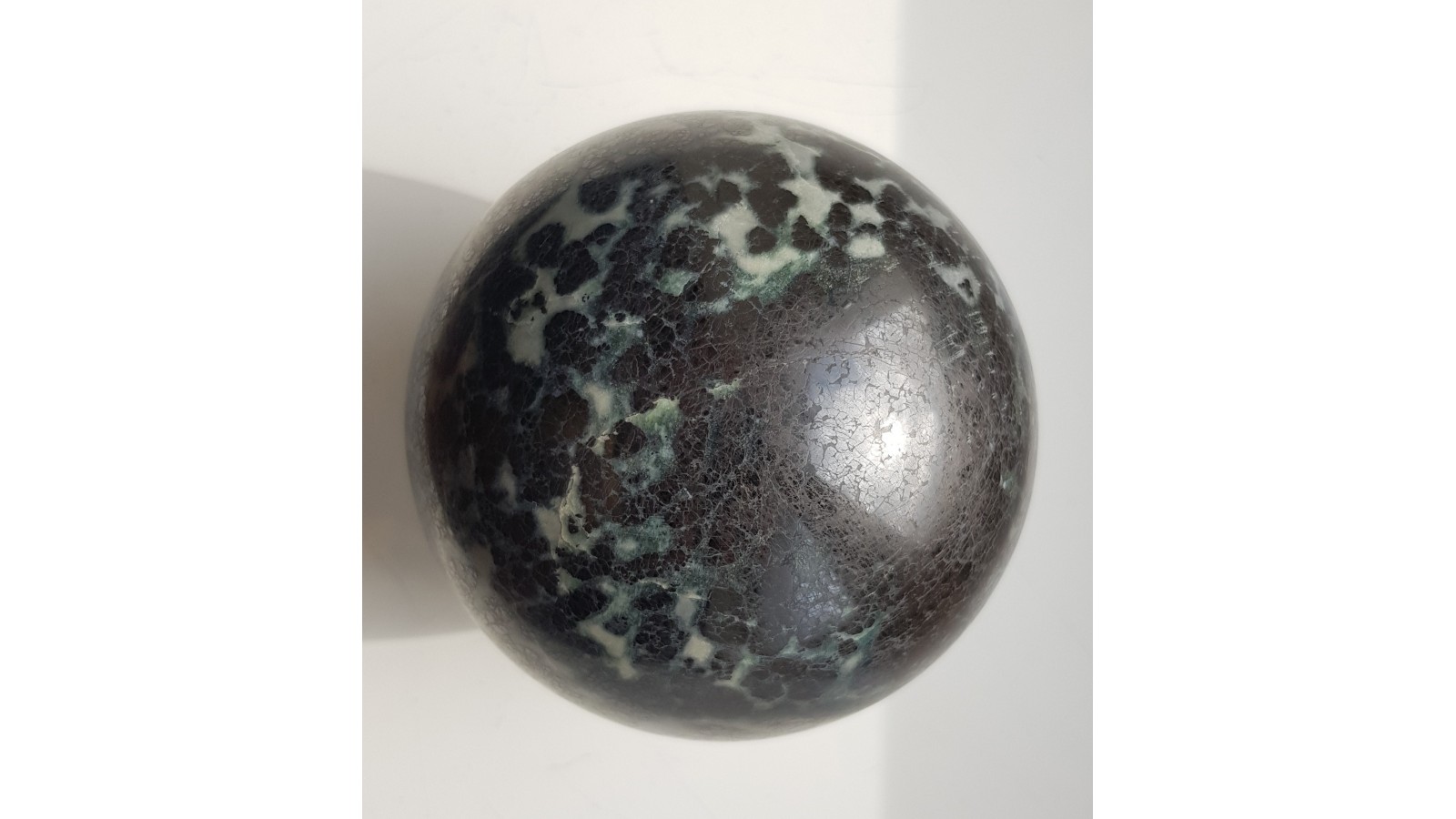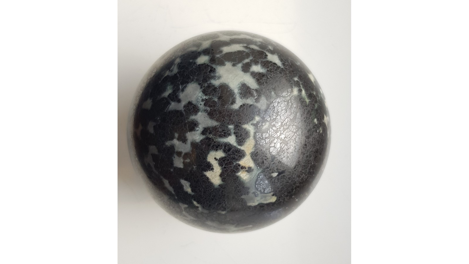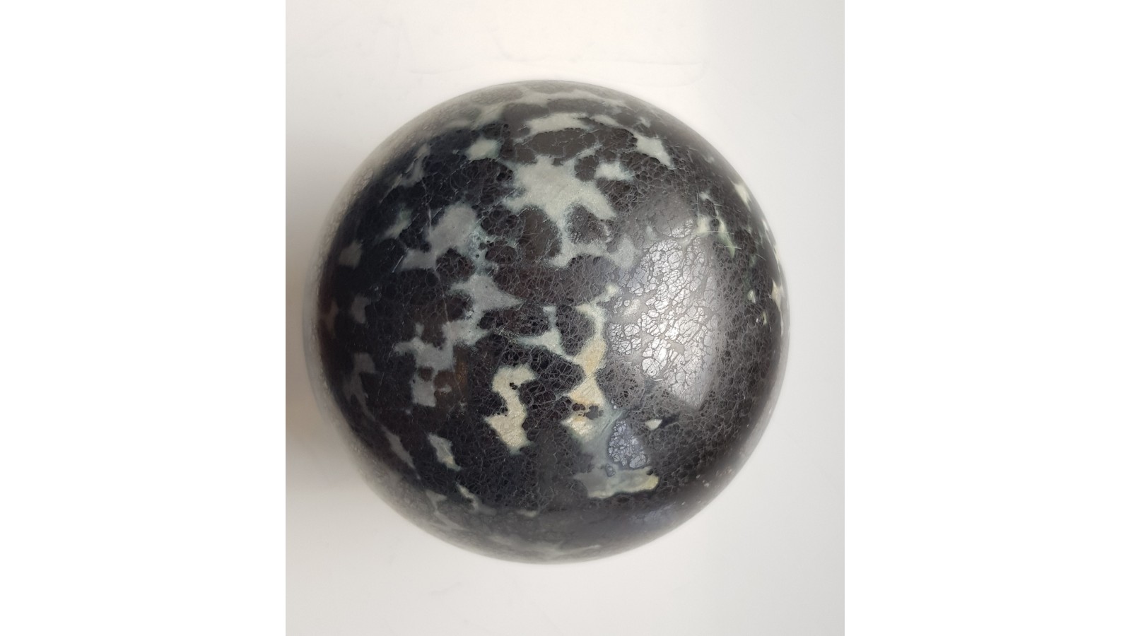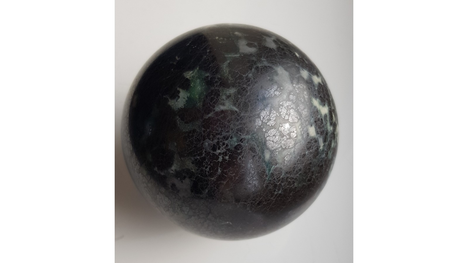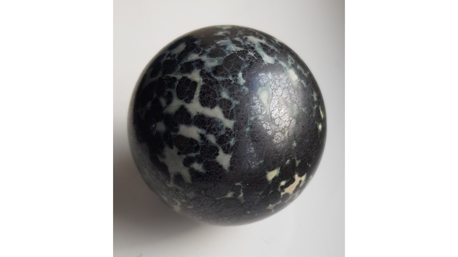 Kula z wyjątkowego materiału - rudy chromitowej z kopalni chromitu na górze Czernica k. Tąpadeł k. Sobótki. W chromitach widoczne strefy bardziej brązowawe, lepiej polerujące się i jednolite oraz bardziej "żelaziste", stalowe. Są to według danych dotyczących złoża pierwotne pikotyty (spinele z zawartością Mg), magnesiochromity bądź chromity glinowe oraz chromity i magnetyty, które są wtórne w stosunku do pikotytu. Piękny poler, świetny deseń, gdyż duże ziarna chromitu są niejako "zatopione" w jasnym serpentynie. Zdecydowanie w materiale przeważa chromit. Polecam.