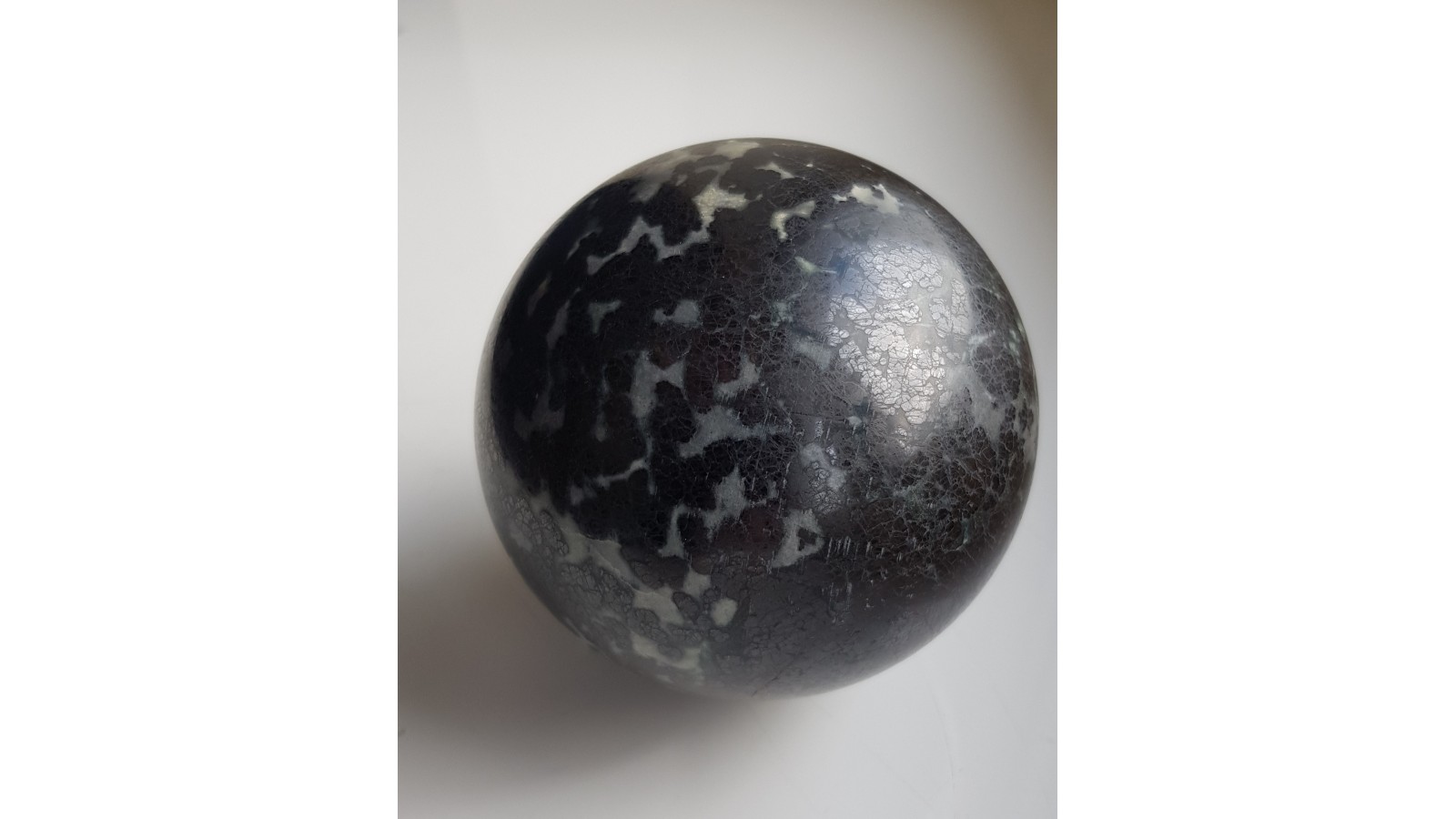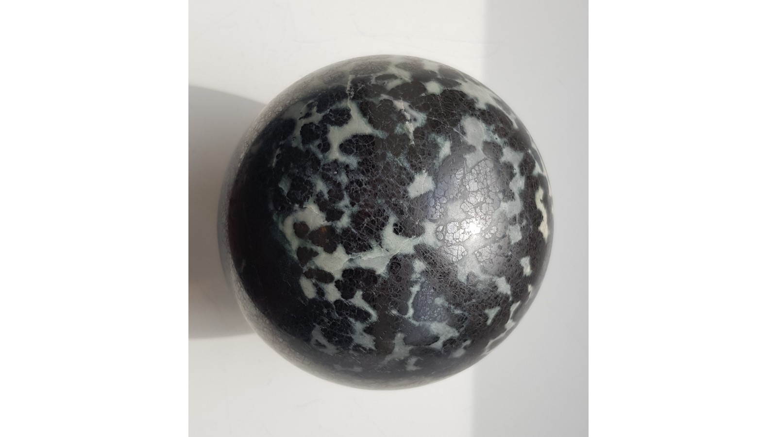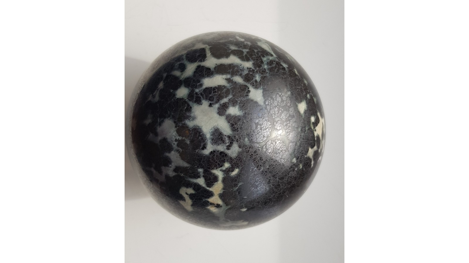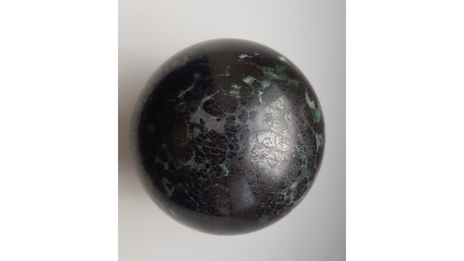Kula z wyjątkowego materiału - rudy chromitowej z kopalni chromitu na górze Czernica k. Tąpadeł k. Sobótki. W chromitach widoczne strefy bardziej brązowawe, lepiej polerujące się i jednolite oraz bardziej "żelaziste", stalowe. Są to według danych dotyczących złoża pierwotne pikotyty (spinele z zawartością Mg), magnesiochromity bądź chromity glinowe oraz chromity i magnetyty, które są wtórne w stosunku do pikotytu. Piękny poler, świetny deseń, gdyż duże ziarna chromitu są niejako "zatopione" w jasnym serpentynie. Zdecydowanie w materiale przeważa chromit. Polecam.