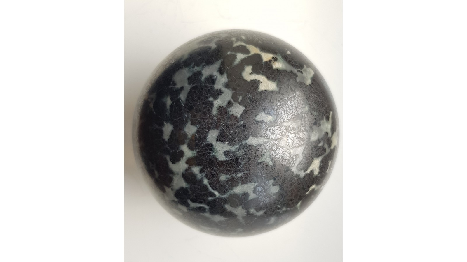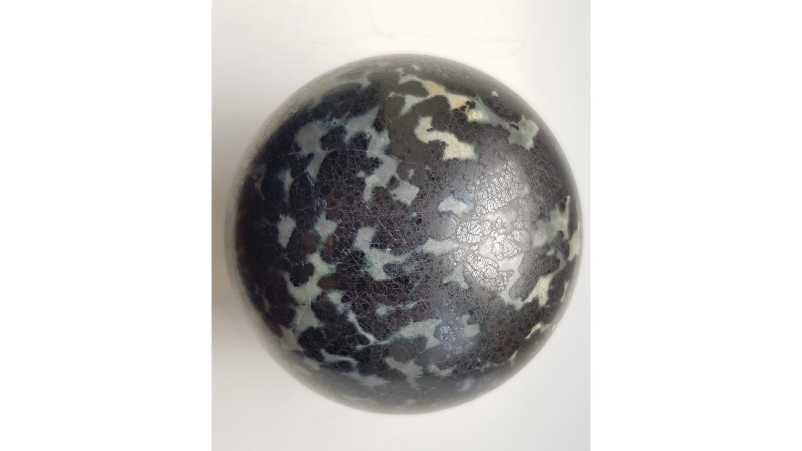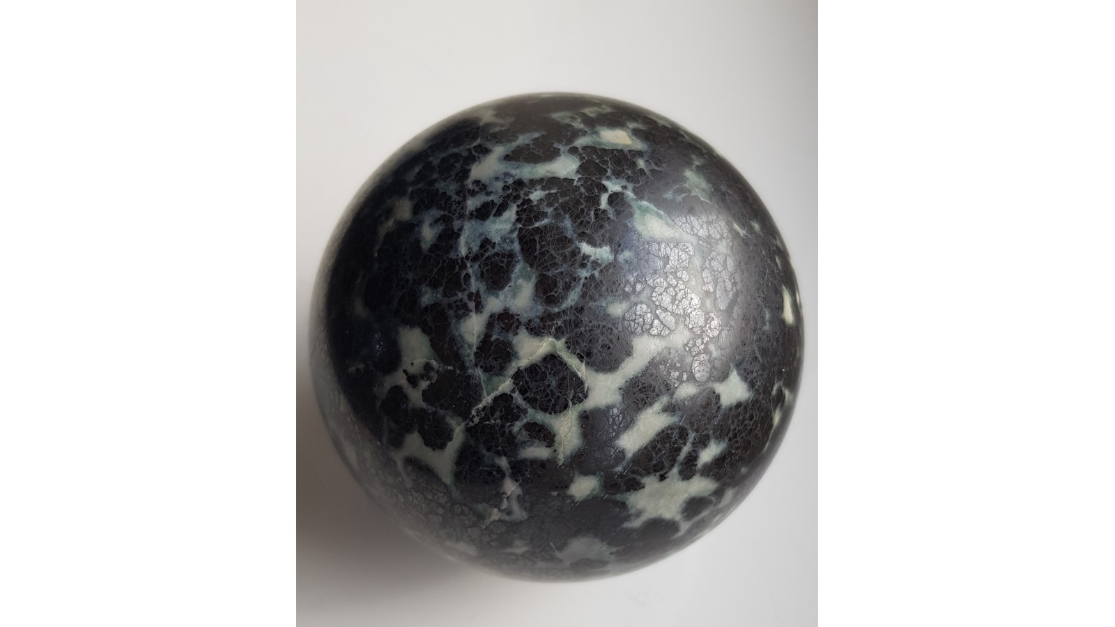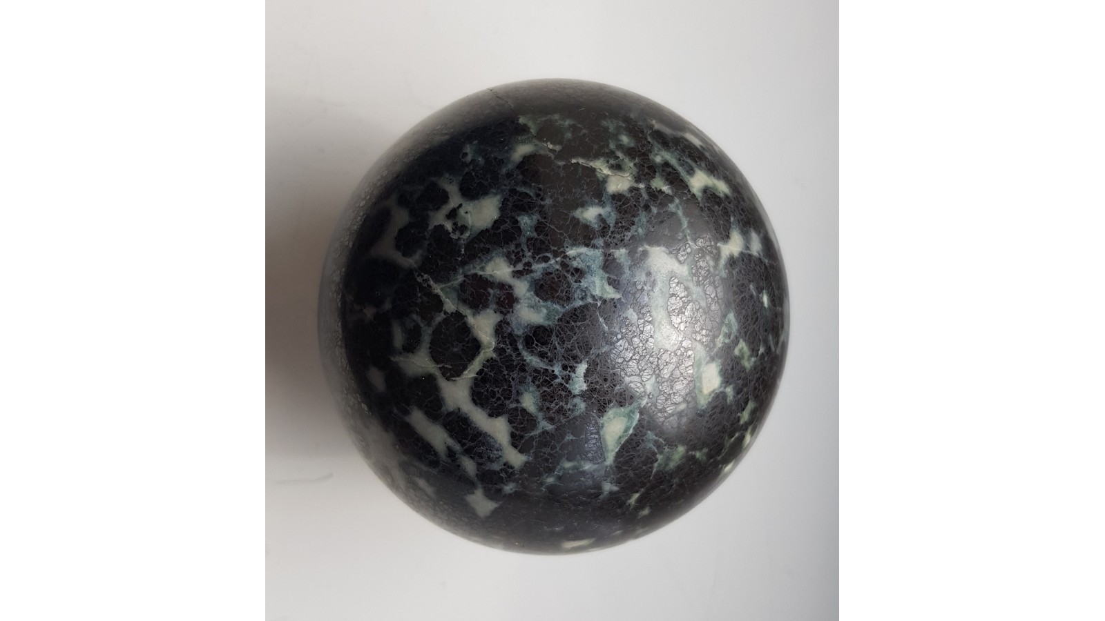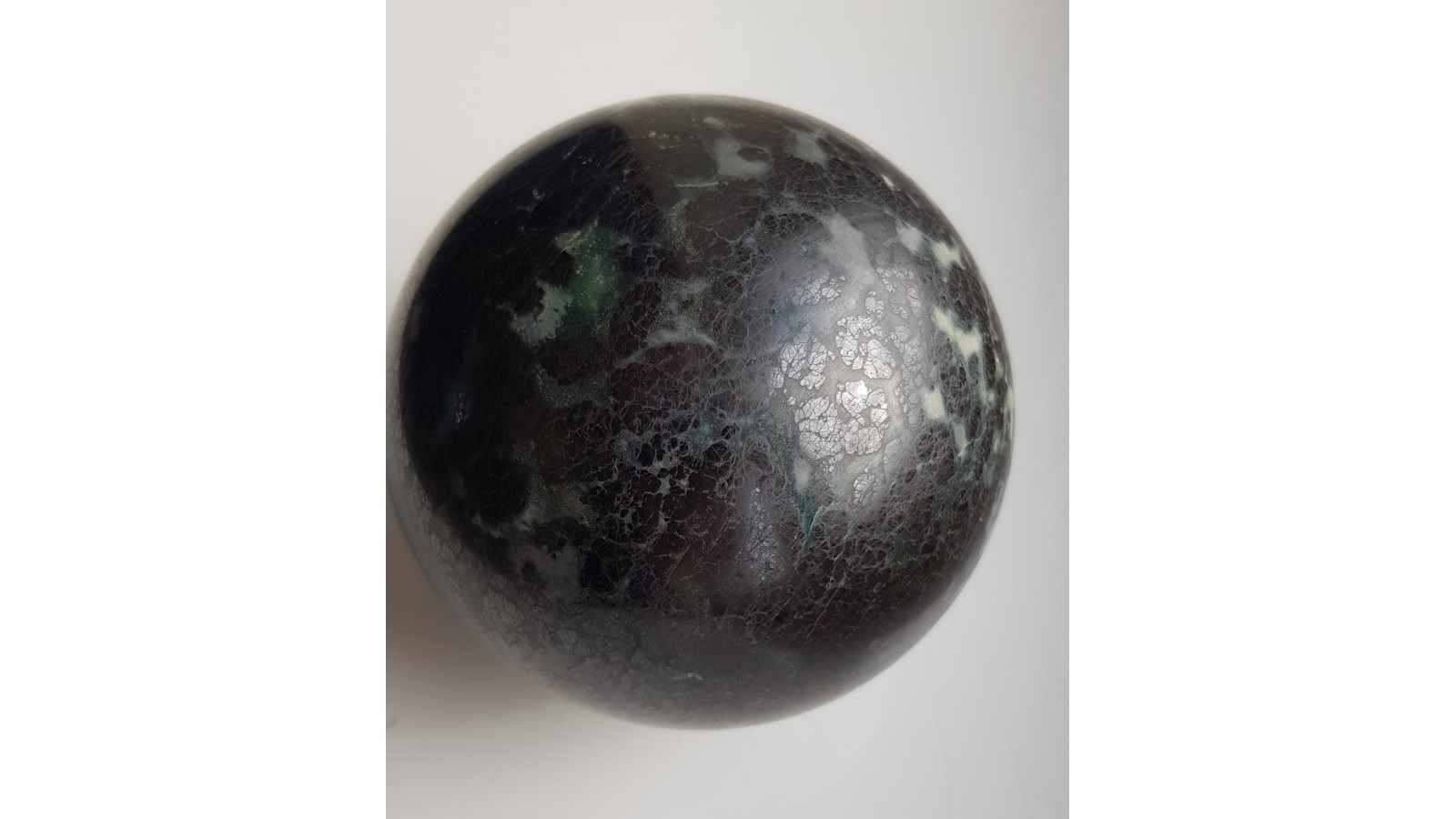 Kula z wyjątkowego materiału - rudy chromitowej z kopalni chromitu na górze Czernica k. Tąpadeł k. Sobótki. W chromitach widoczne strefy bardziej brązowawe, lepiej polerujące się i jednolite oraz bardziej "żelaziste", stalowe. Są to według danych dotyczących złoża pierwotne pikotyty (spinele z zawartością Mg), magnesiochromity bądź chromity glinowe oraz chromity i magnetyty, które są wtórne w stosunku do pikotytu. Piękny poler, świetny deseń, gdyż duże ziarna chromitu są niejako "zatopione" w jasnym serpentynie. Zdecydowanie w materiale przeważa chromit. Polecam.
