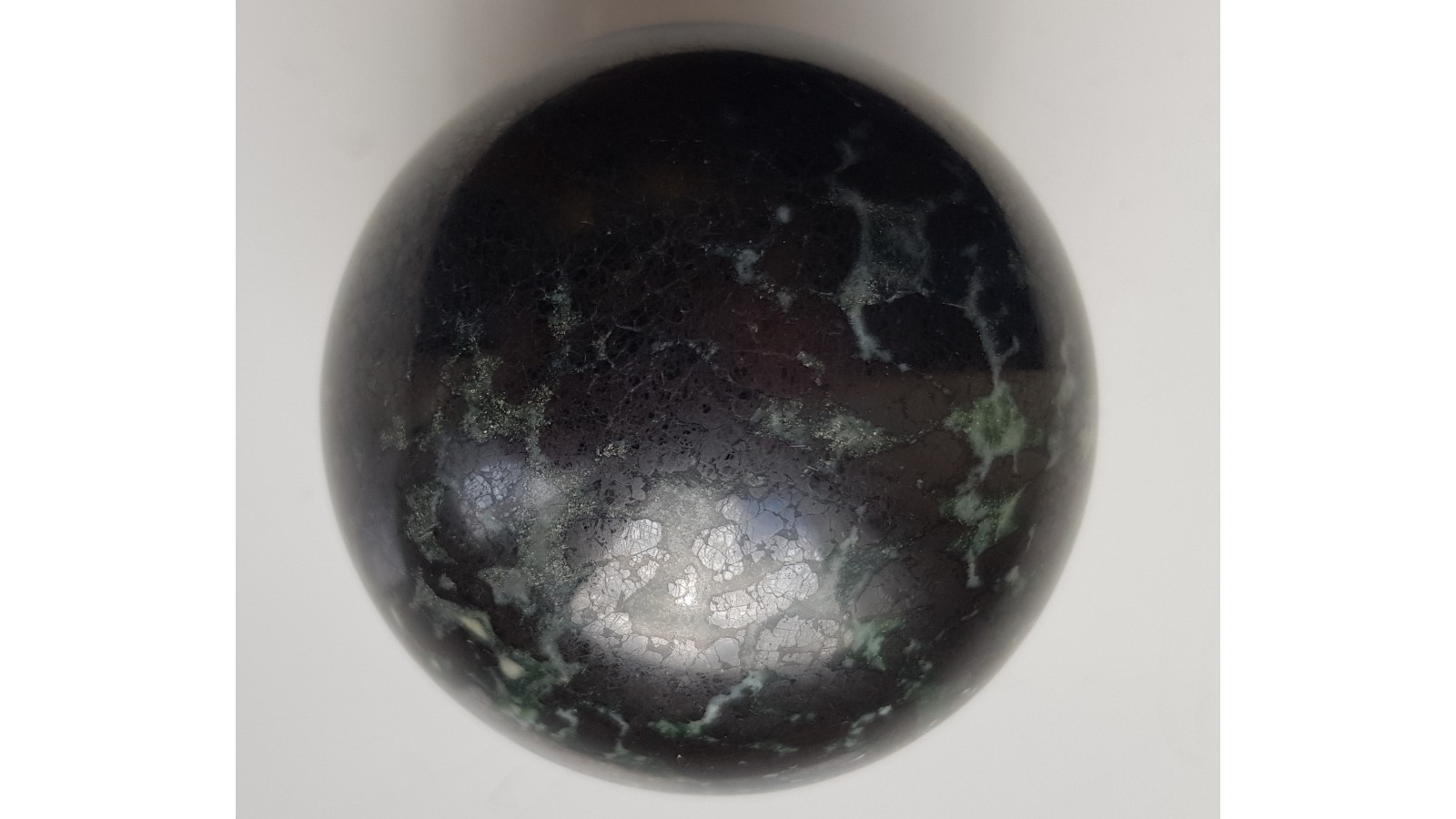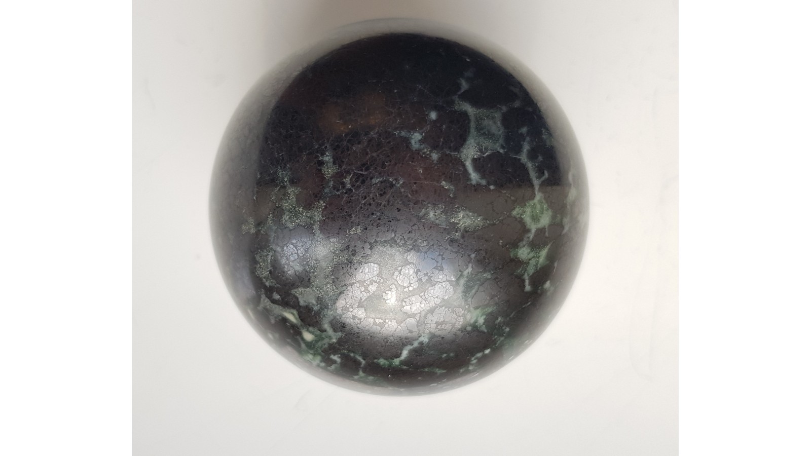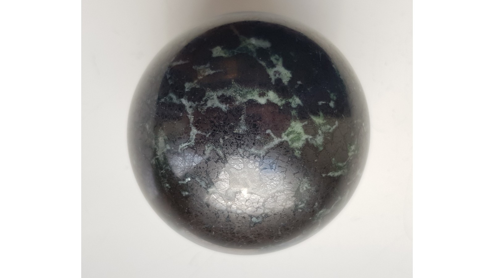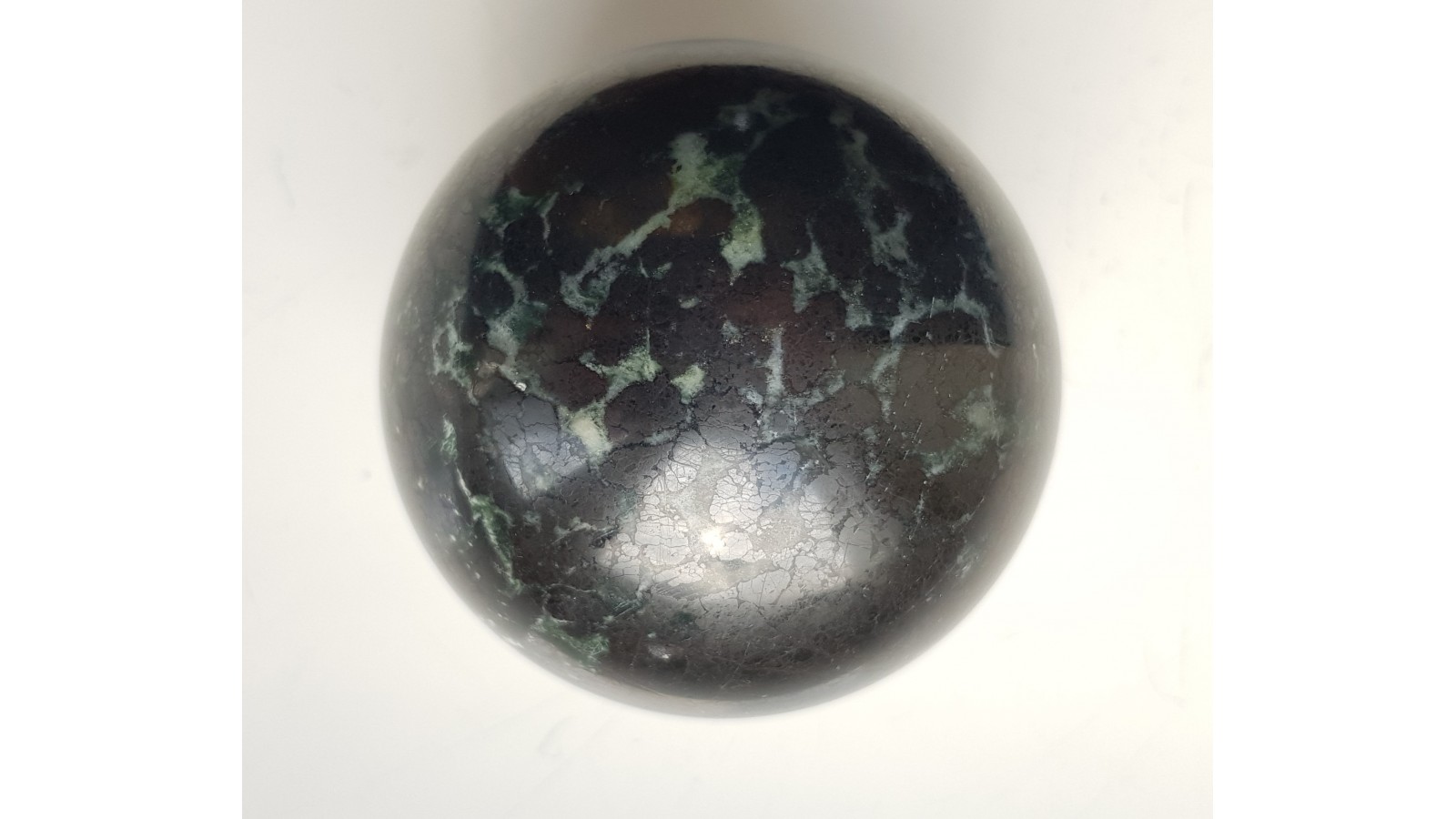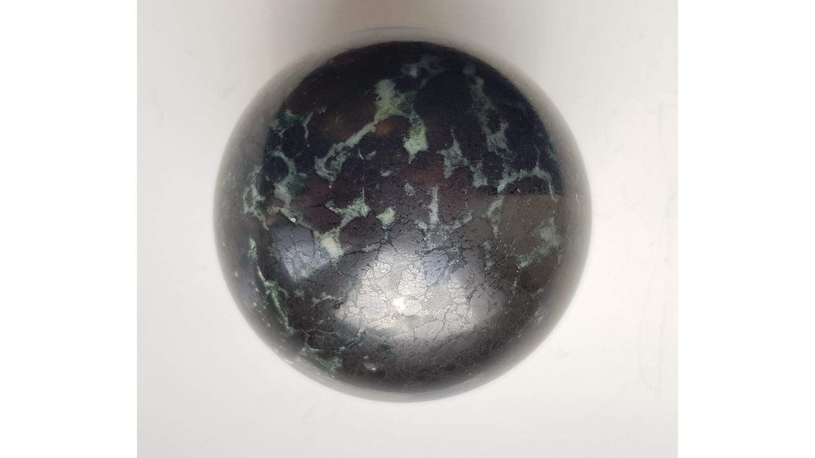Kula z wyjątkowego materiału - rudy chromitowej z kopalni chromitu na górze Czernica k. Tąpadeł k. Sobótki. W chromitach widoczne strefy bardziej brązowawe, lepiej polerujące się i jednolite oraz bardziej "żelaziste", stalowe. Są to według danych dotyczących złoża pierwotne pikotyty (spinele z zawartością Mg), magnesiochromity bądź chromity glinowe oraz chromity i magnetyty, które są wtórne w stosunku do pikotytu. Piękny poler, świetny deseń, gdyż duże ziarna chromitu są niejako "zatopione" w jasnym serpentynie. Zdecydowanie w materiale przeważa chromit. Polecam.