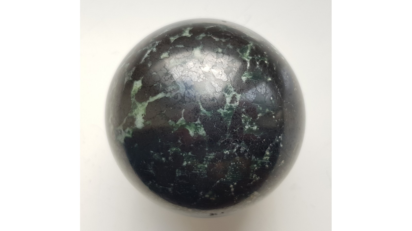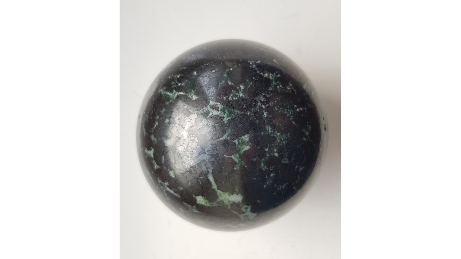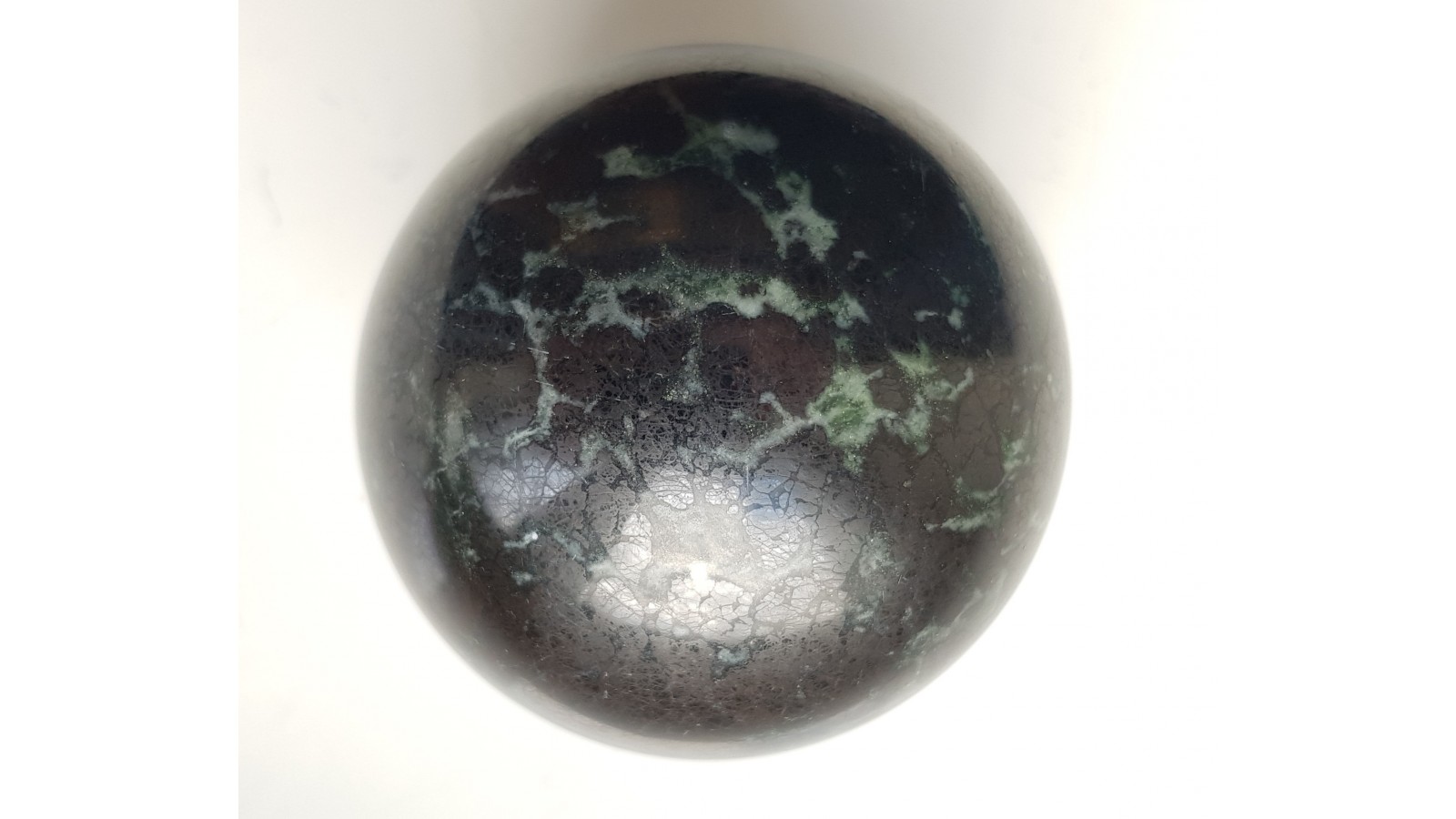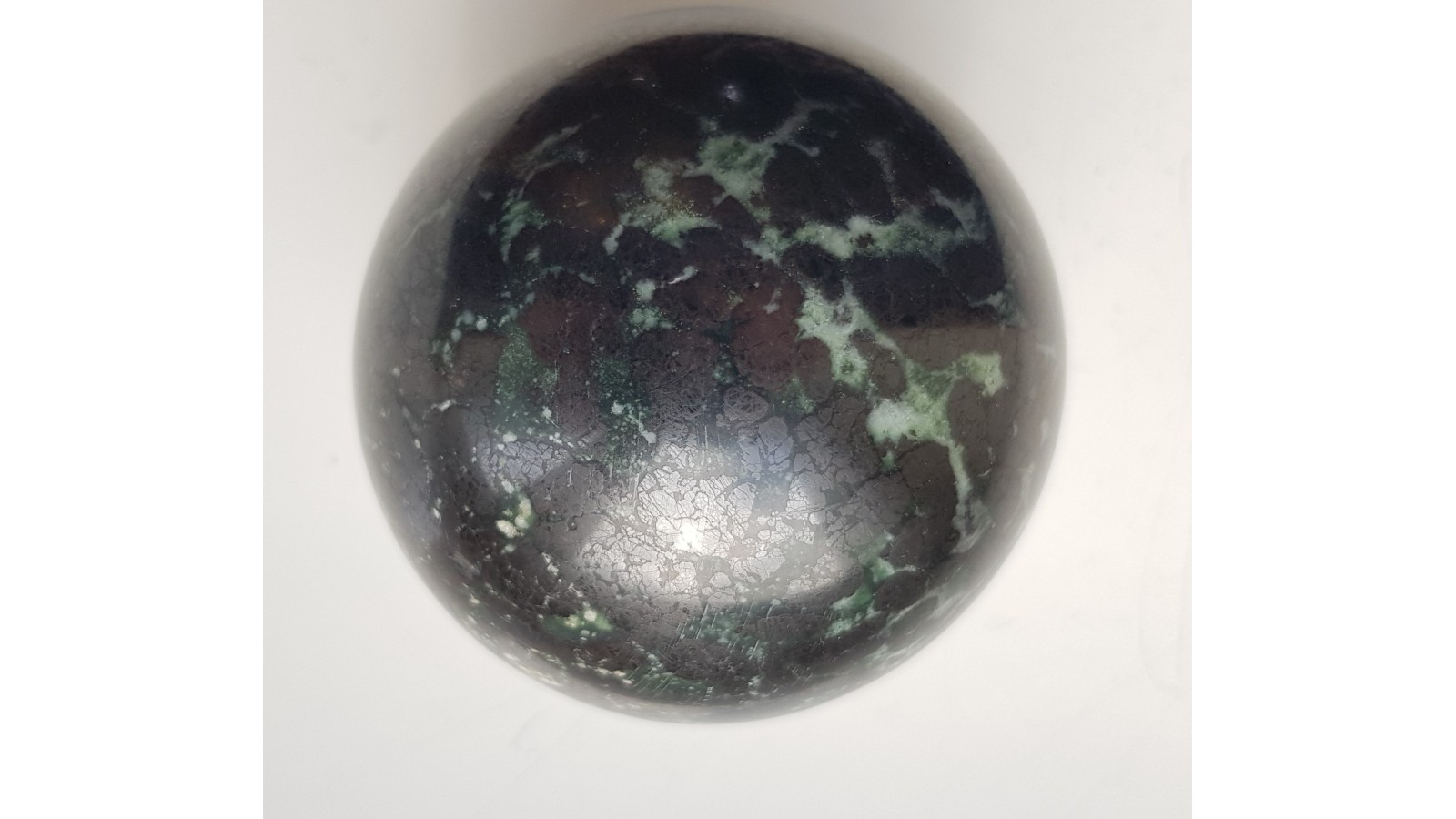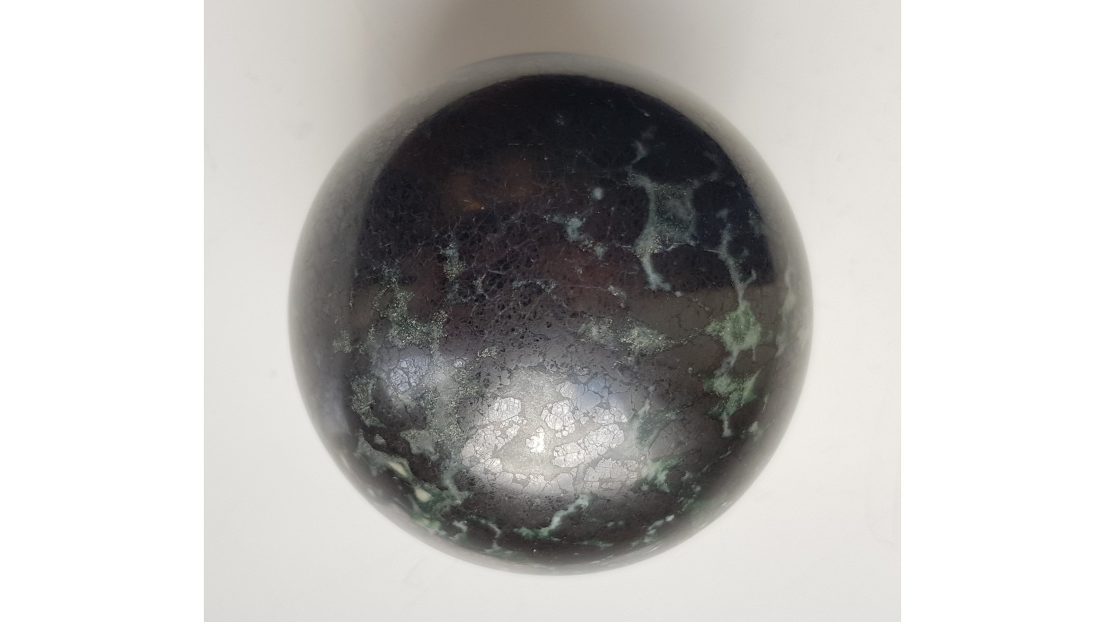 Kula z wyjątkowego materiału - rudy chromitowej z kopalni chromitu na górze Czernica k. Tąpadeł k. Sobótki. W chromitach widoczne strefy bardziej brązowawe, lepiej polerujące się i jednolite oraz bardziej "żelaziste", stalowe. Są to według danych dotyczących złoża pierwotne pikotyty (spinele z zawartością Mg), magnesiochromity bądź chromity glinowe oraz chromity i magnetyty, które są wtórne w stosunku do pikotytu. Piękny poler, świetny deseń, gdyż duże ziarna chromitu są niejako "zatopione" w jasnym serpentynie. Zdecydowanie w materiale przeważa chromit. Polecam.
