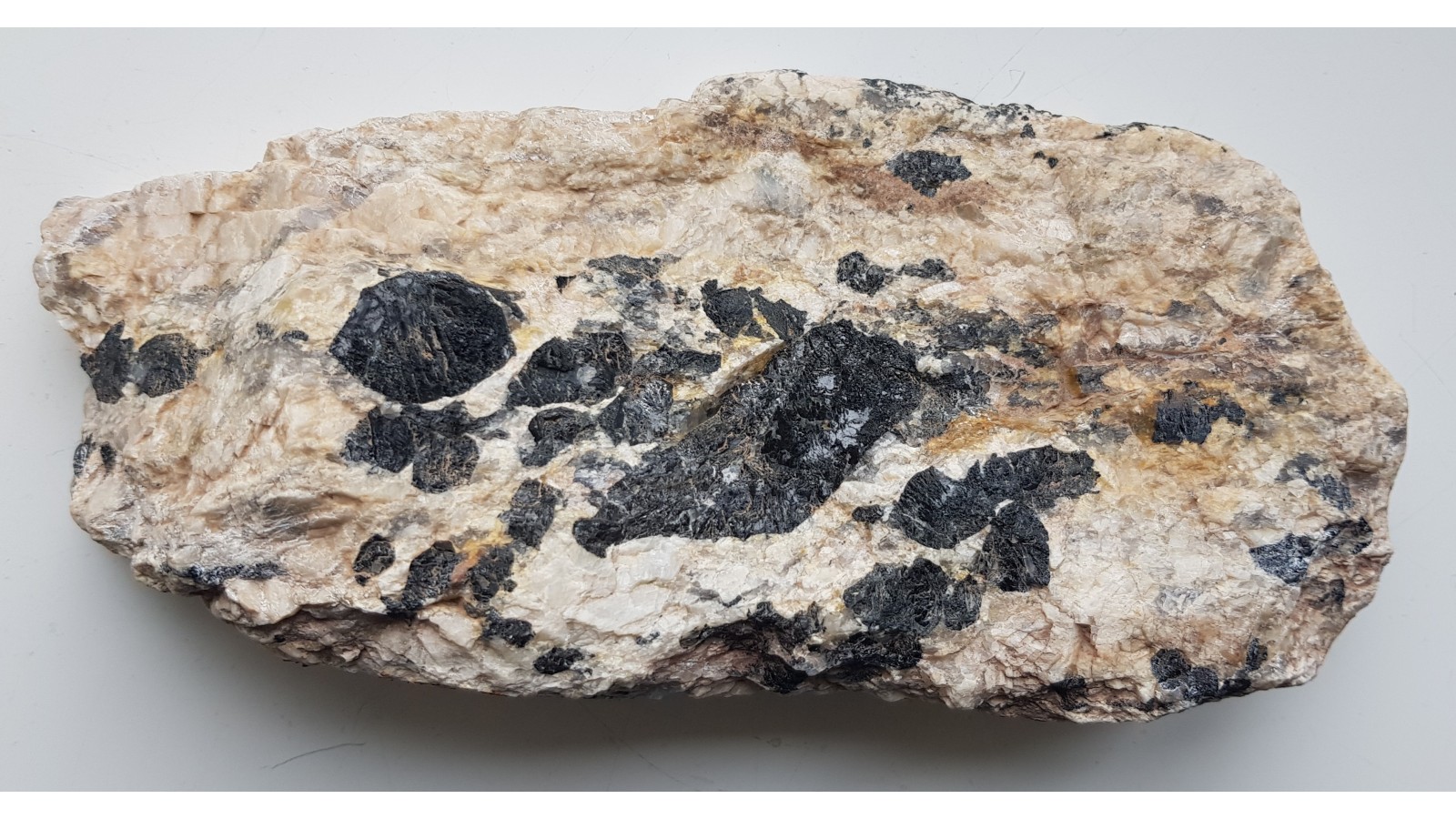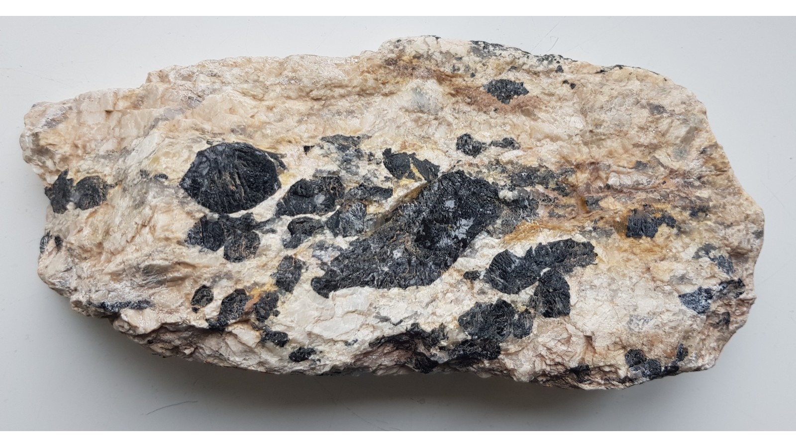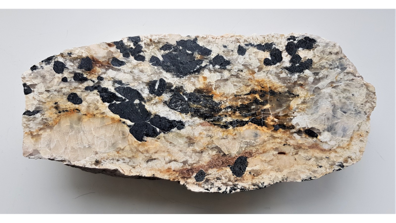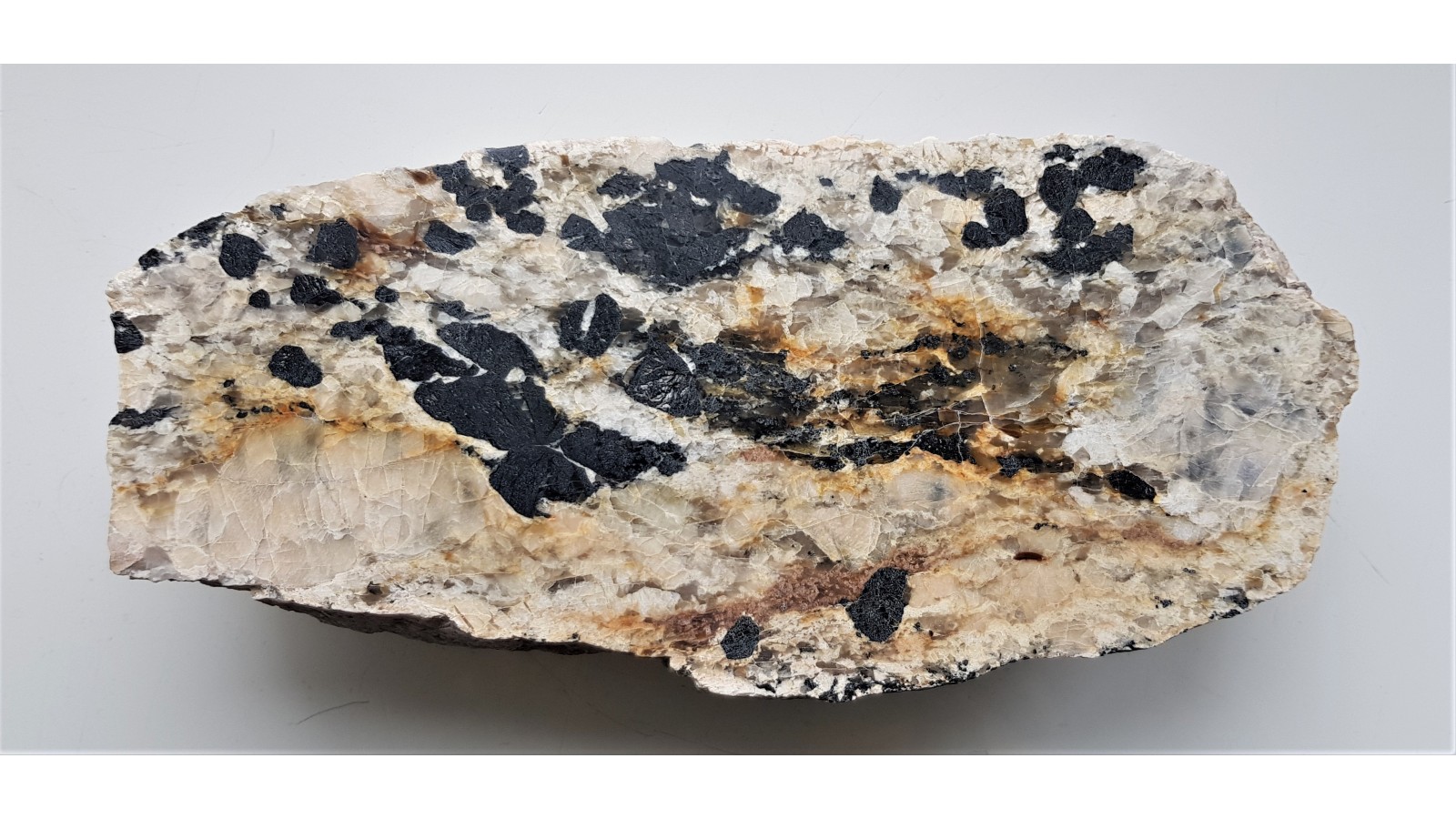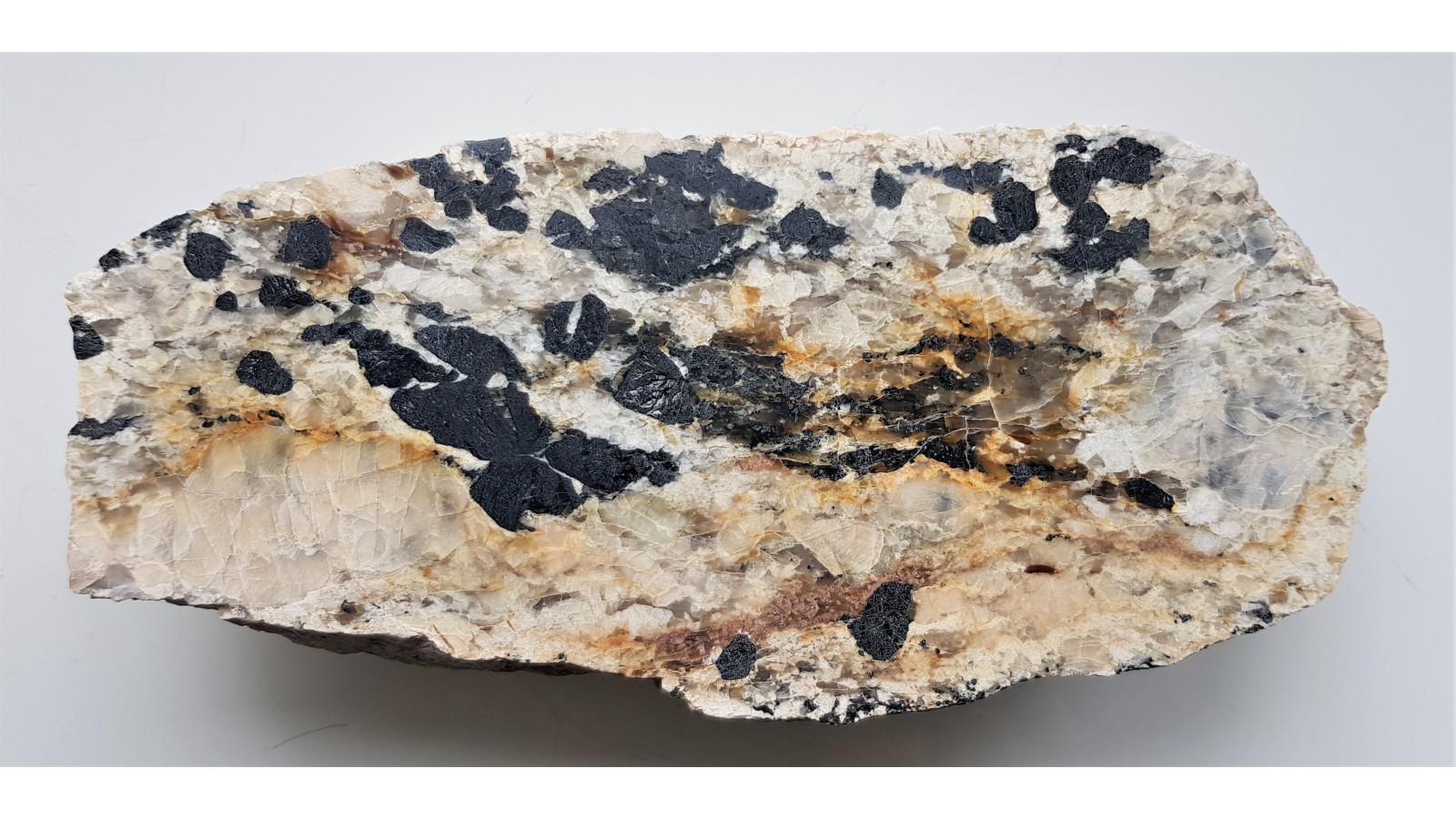 Duży, polerowany okaz jasnego pegmatytu z wielkimi kryształami czarnego turmalinu. Okaz znaleziony w Nowej Rudzie w materiale luźnym. Turmaliny, świeże, szkliste, nie rozsypujące się i nie zwietrzałe. Obszar alimentacyjny to prawdopodobnie blok gnejsowy Gór Sowich. Na zgładzie widoczne także duże kryształy lekko różoweych skaleni. Idealny poler. Strona przeciwna naturalna, widoczne duże kryształy turmalinów. Polecam.