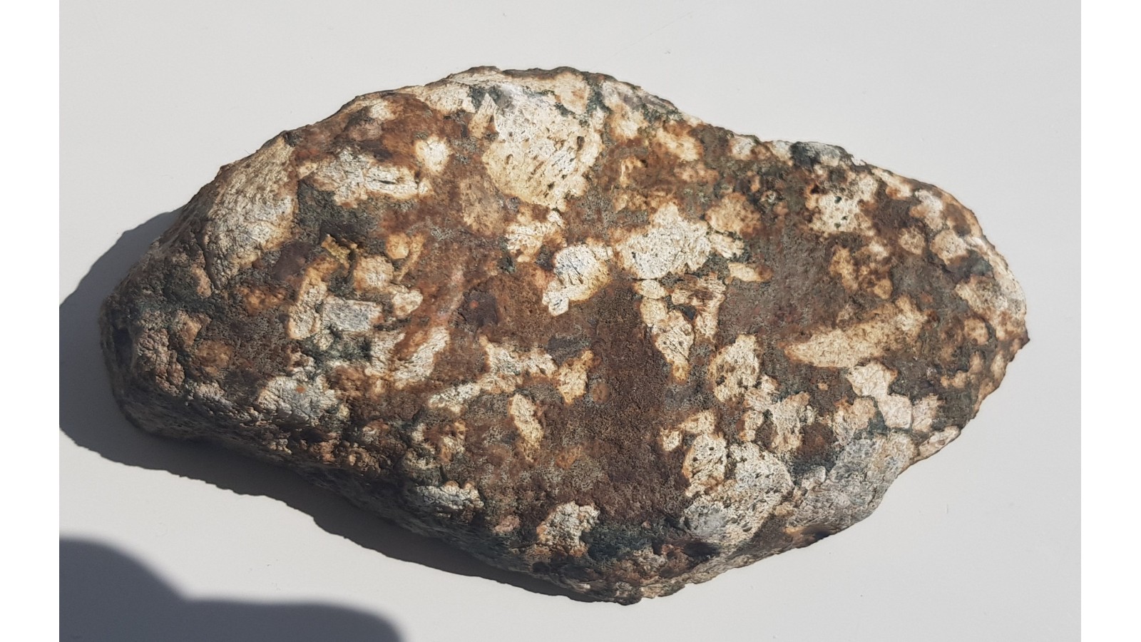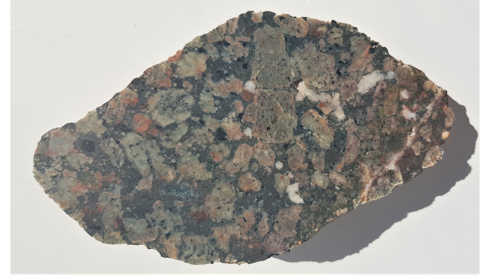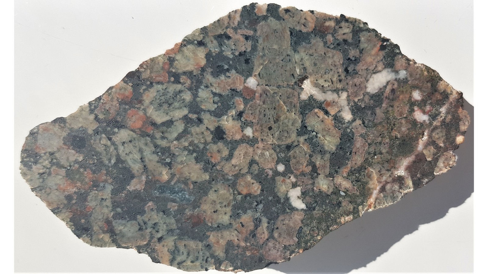 Wyjątkowy okaz porfirowatego diabazu z dużymi fenokryształami skaleni. Skalenie barwne wskutek oddziaływania hydrotermy. Miejscami widoczne tekstury migdałowcowe. Eratyk, okolice Nowego Miasteczka, lubuskie. Okaz polerowany, strona przeciwna naturalna - kora wietrzeniowa. Skała wykazuje duże podobieństwo do tzw. diabazów-Öje (Öje-Diabas). Piękny, niespękany okaz. Polecam.