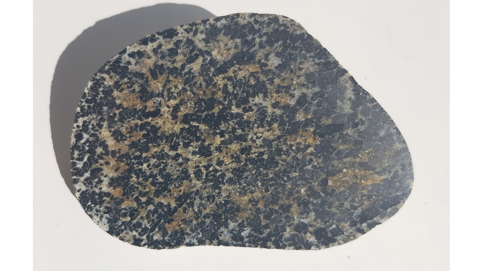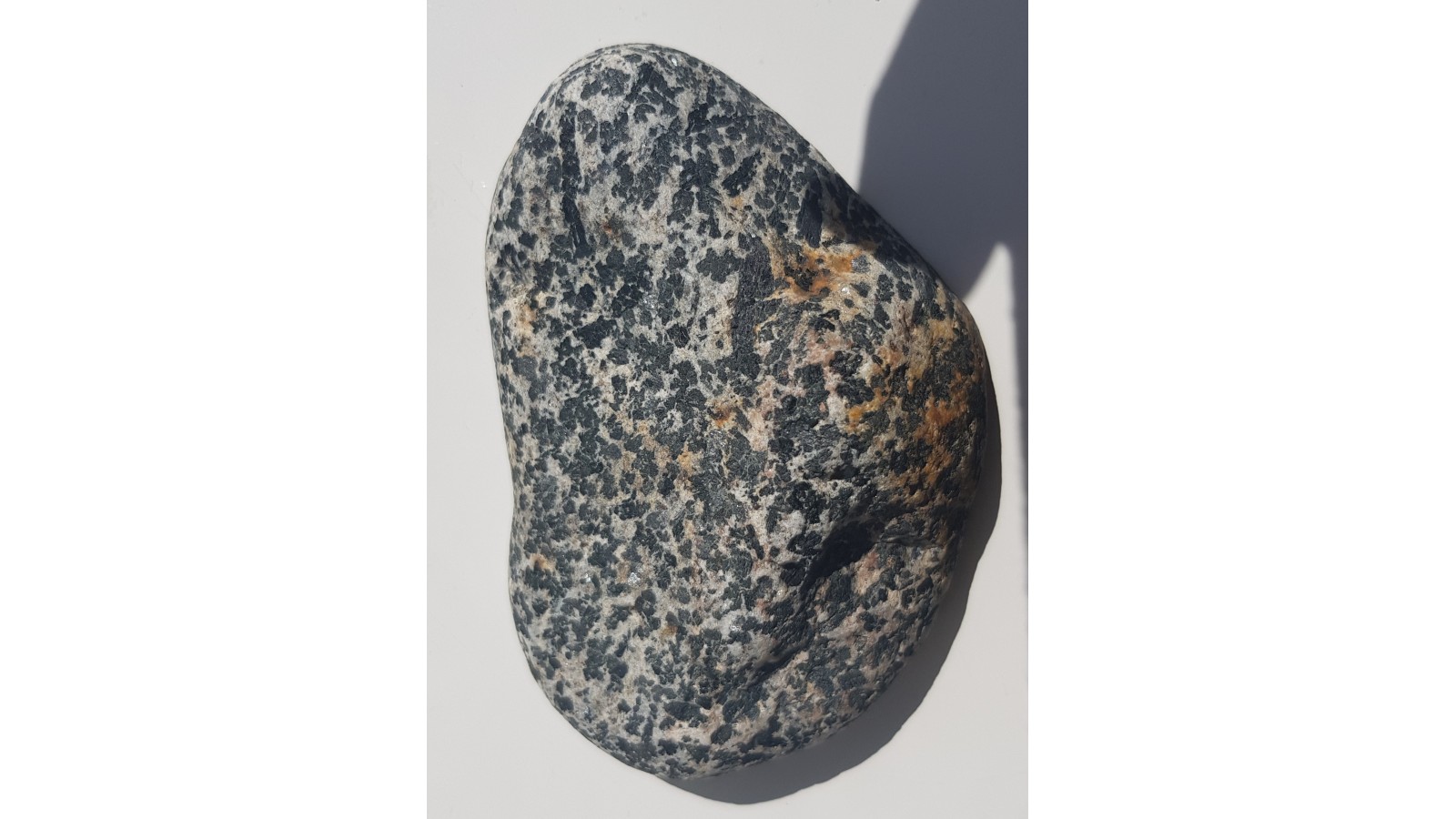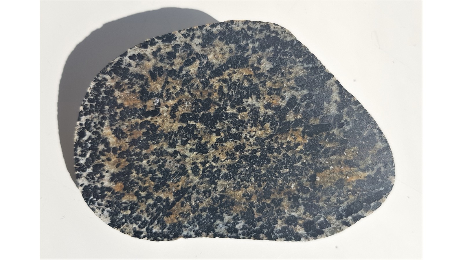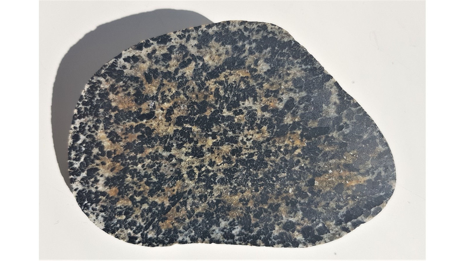 Skała z licznymi porfiroblastami hornblendy. Na stronie zewnętrznej widoczne wydłużone osobniki tego minerału. Na zgładzie oprócz minerałów jasnych i hornblendy widoczne liczne kryształki tytanitu oraz minerały rudne. Okaz polerowany jednostronnie. Strona przeciwna naturalna - otoczak. Eratyk z Międzyzdrojów. Polecam.