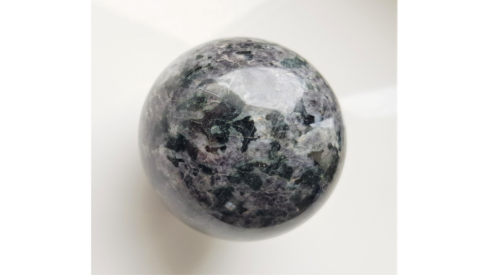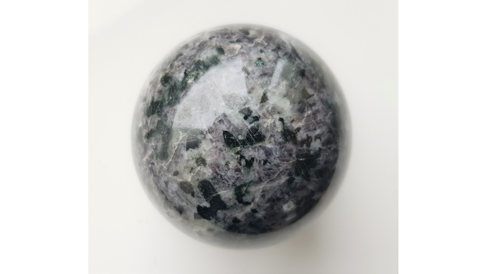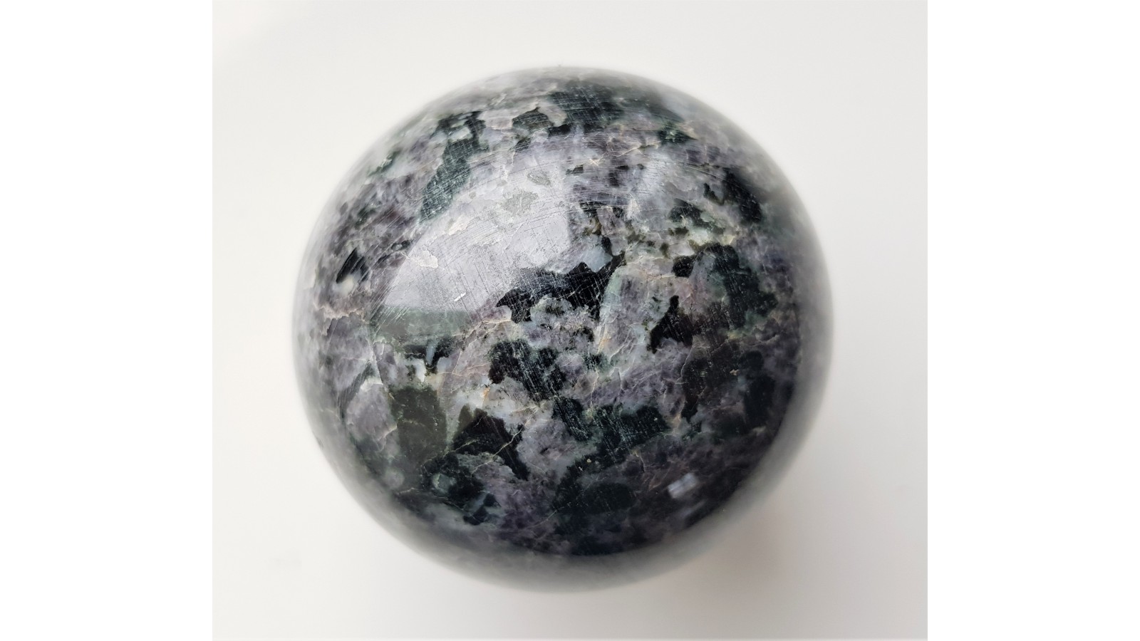 Piękna kula, bez spękań ze skały typu anortozytu, leukogabra. Na szarym, plagioklazowym tle widoczne intensywnie zielone obszary amfibolowe. Idealny poler, bardzo estetyczna. Eratyk z województwa lubuskiego z Kalska. Polecam.