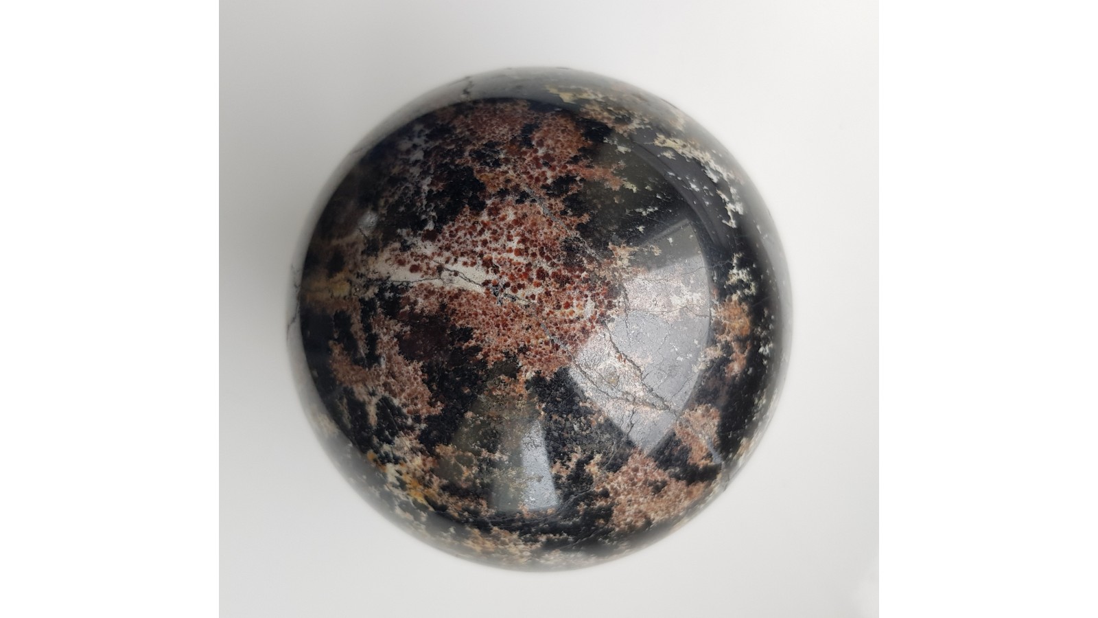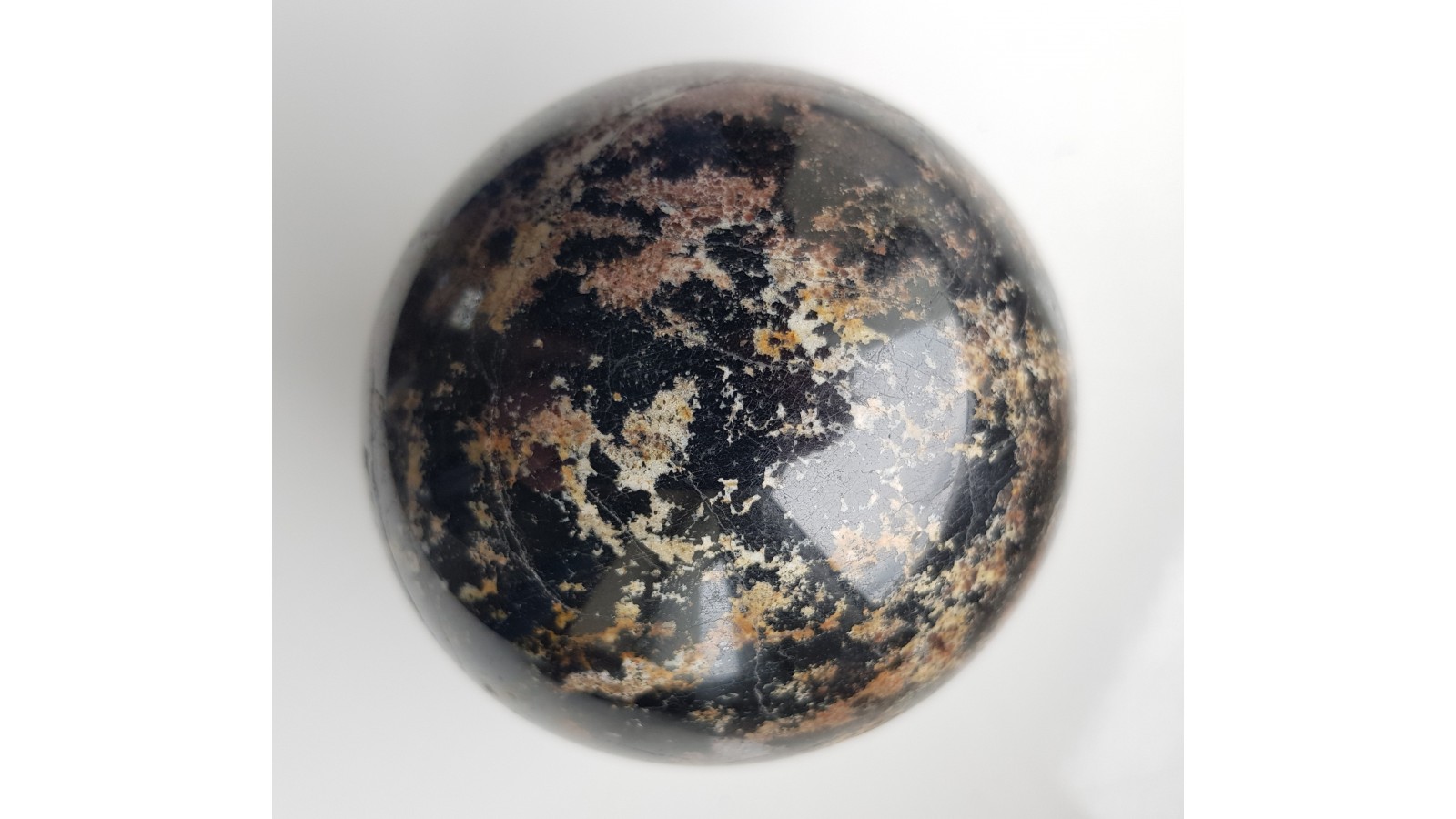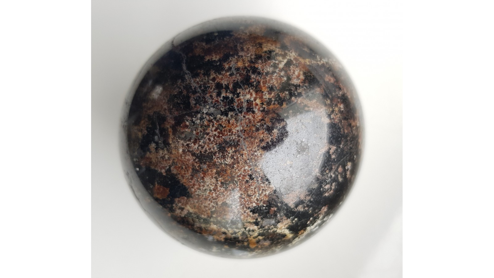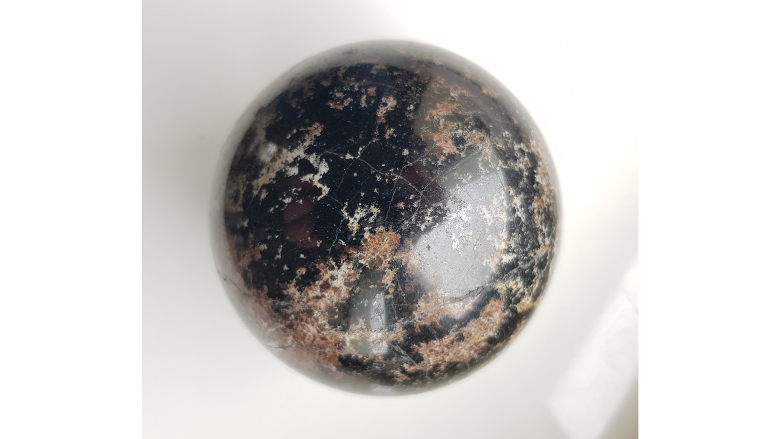 Kula z wyjątkowego materiału - granatowego amfibolitu/ciemnego granulitu z bloku sowiogórskiego. Na powierzchni widoczne wielkie, czarne blasty hornblendy i drobne czerwone granaty. Piękny poler. Polecam.
