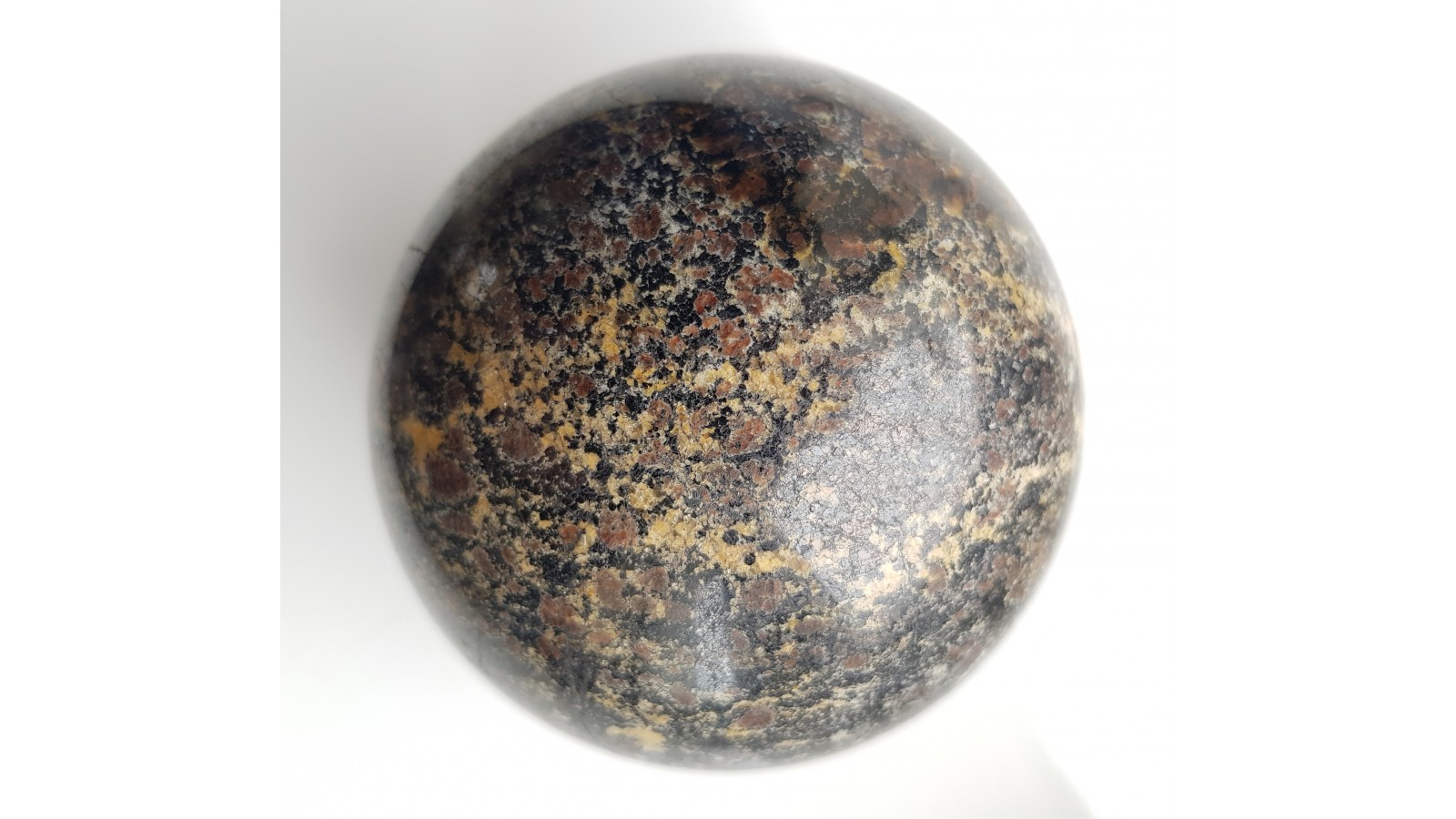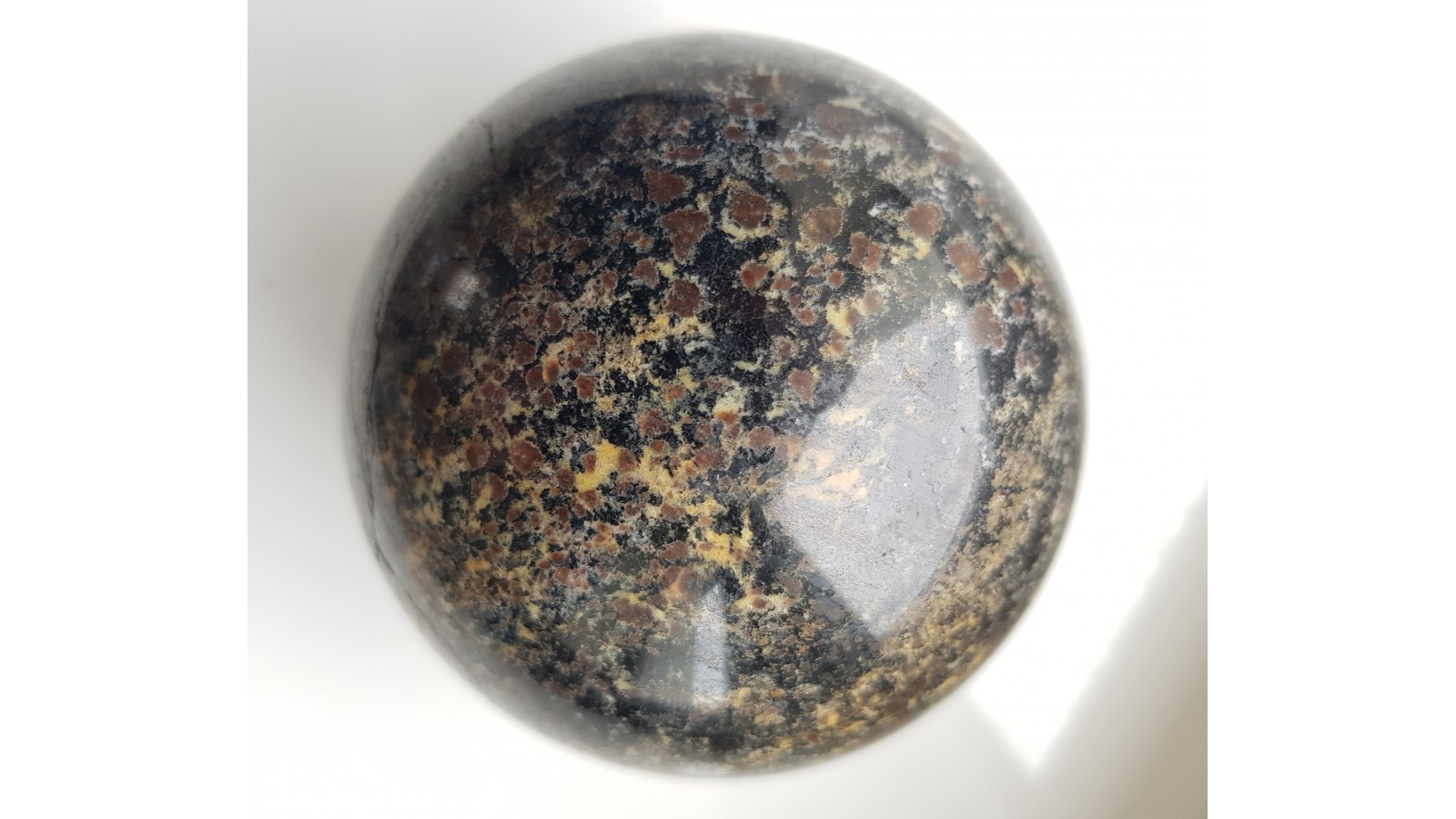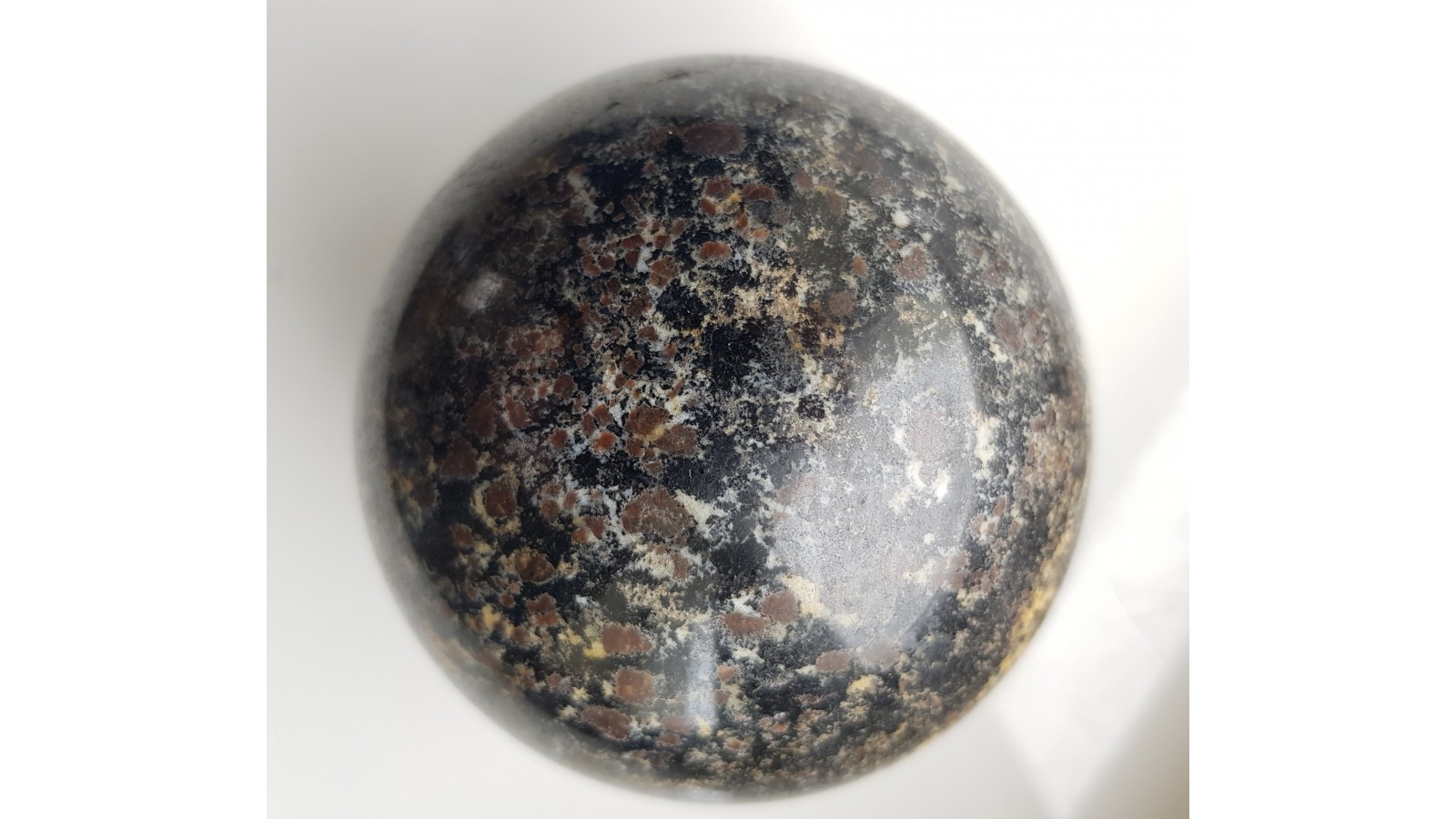 Kula z wyjątkowego materiału - granatowego amfibolitu/ciemnego granulitu z bloku sowiogórskiego. Na powierzchni widoczne bardzo liczne, duże blasty czerwonych granatów oraz czarna hornblenda. Piękny poler. Polecam.