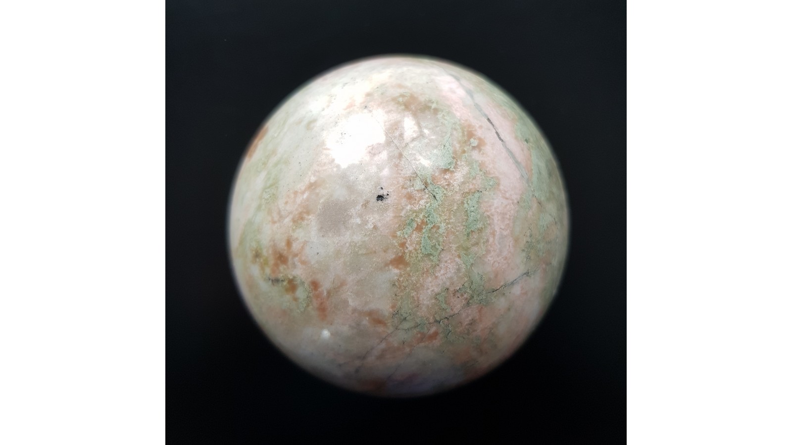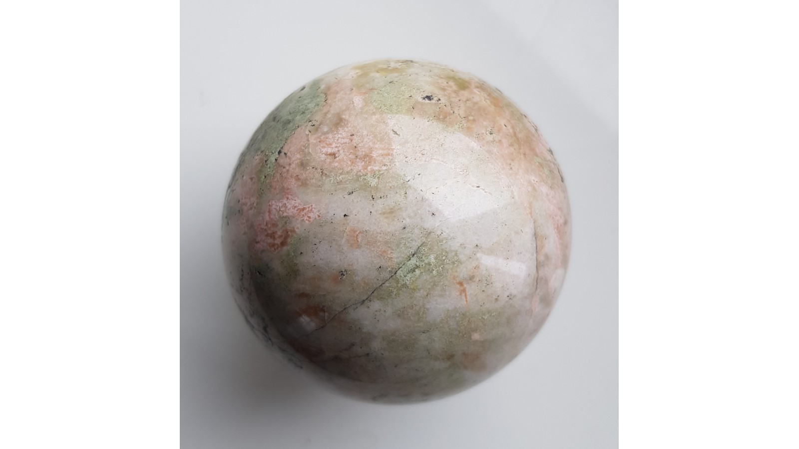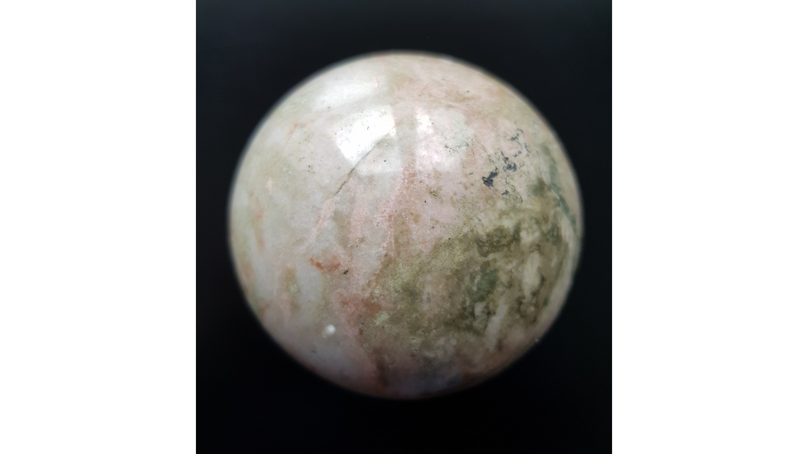 Kula z rodingitu z nieznanej szerzej lokalizacji w obrębie amfibolitów w okolicy Sobótki k. Wrocławia. Wygląd porcelanowy z różowymi strefami. Piękny poler. Polecam.