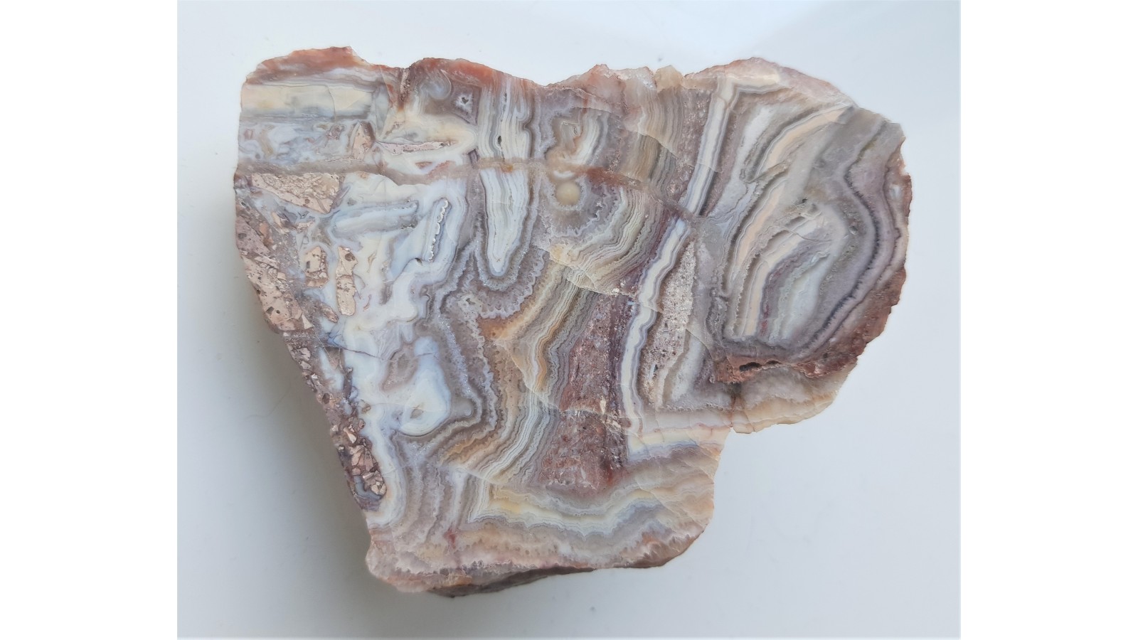 Piękny i wyrazisty agat z Sokoli k. Bolkowa. Okaz o zabarwieniu kontrastowym. Barwy kremowe, białe, szarawe, fragmenty skały otaczającej, ciekawy deseń. Poler z jednej strony, strona przeciwna naturalna. Polecam.