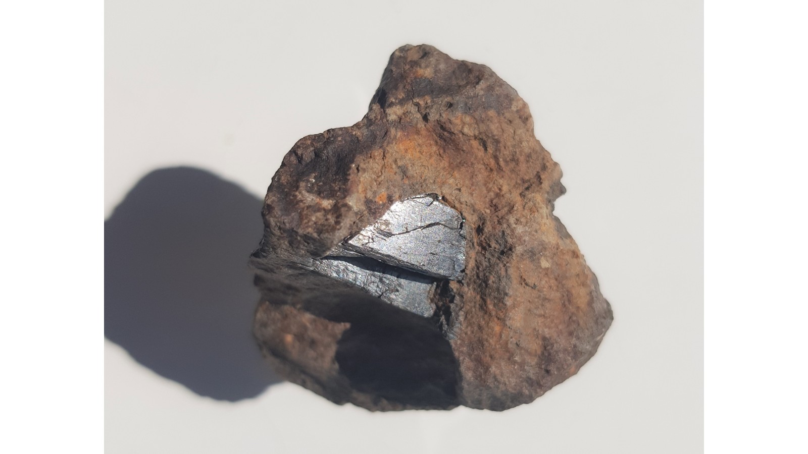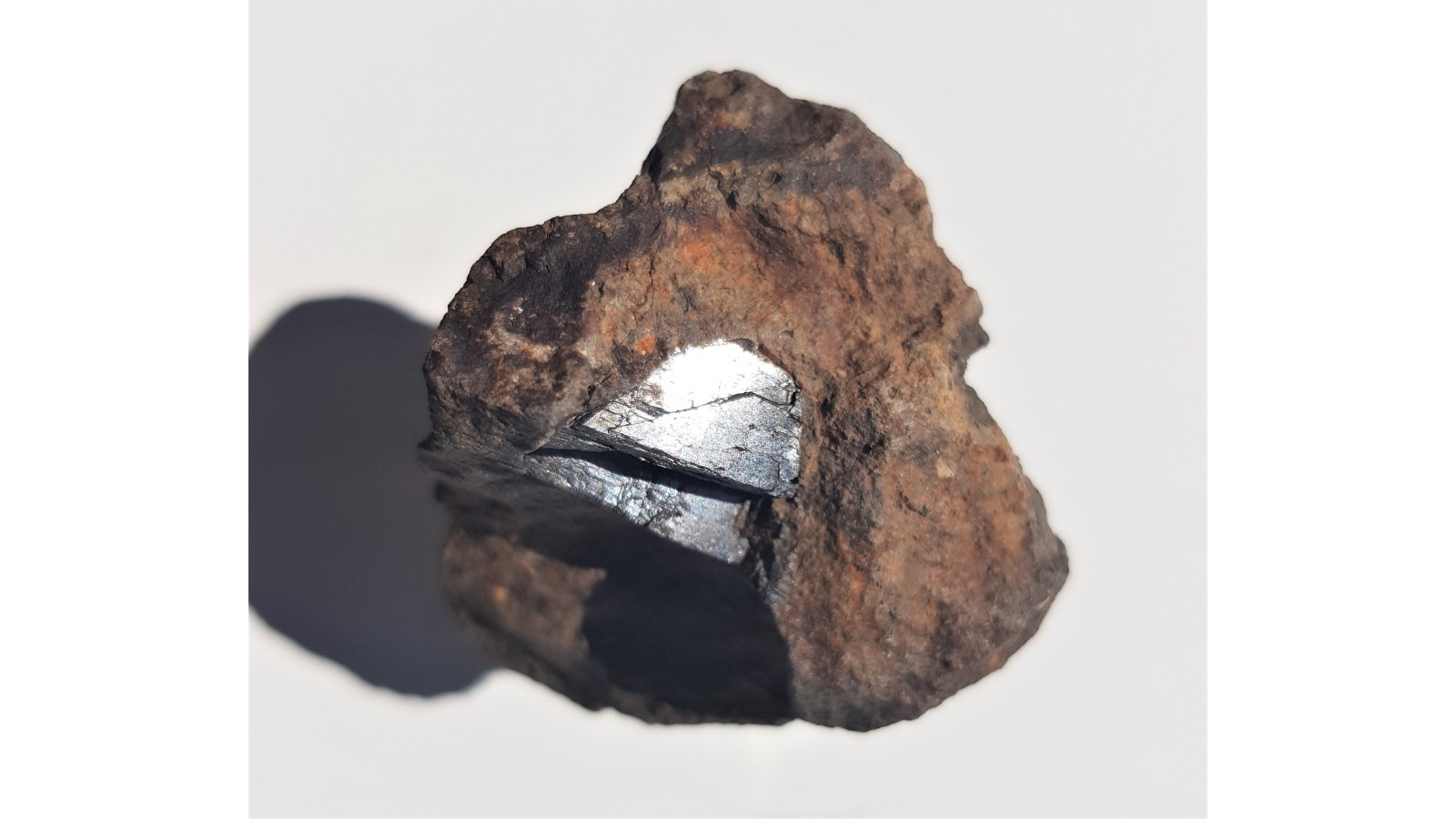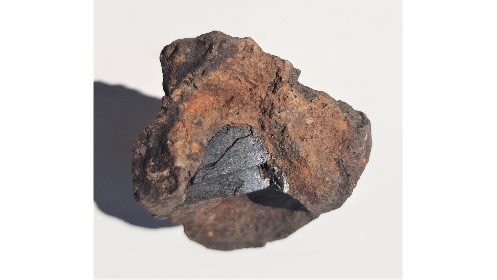 Duży kryształ czarnego augitu w bazalcie z Róóżanej k. Złotoryi. Widoczne powierzchnie łupliwości silnie odbijające światło. Augit nie jest spękany, to co może być widoczne jako pęknięcie jest strefą pomiędzy dwoma płaszczyznami łupliwości. Piękny i ciekawy okaz. Takiej wielkości augit jest rzadkością w Sudetach. Polecam.