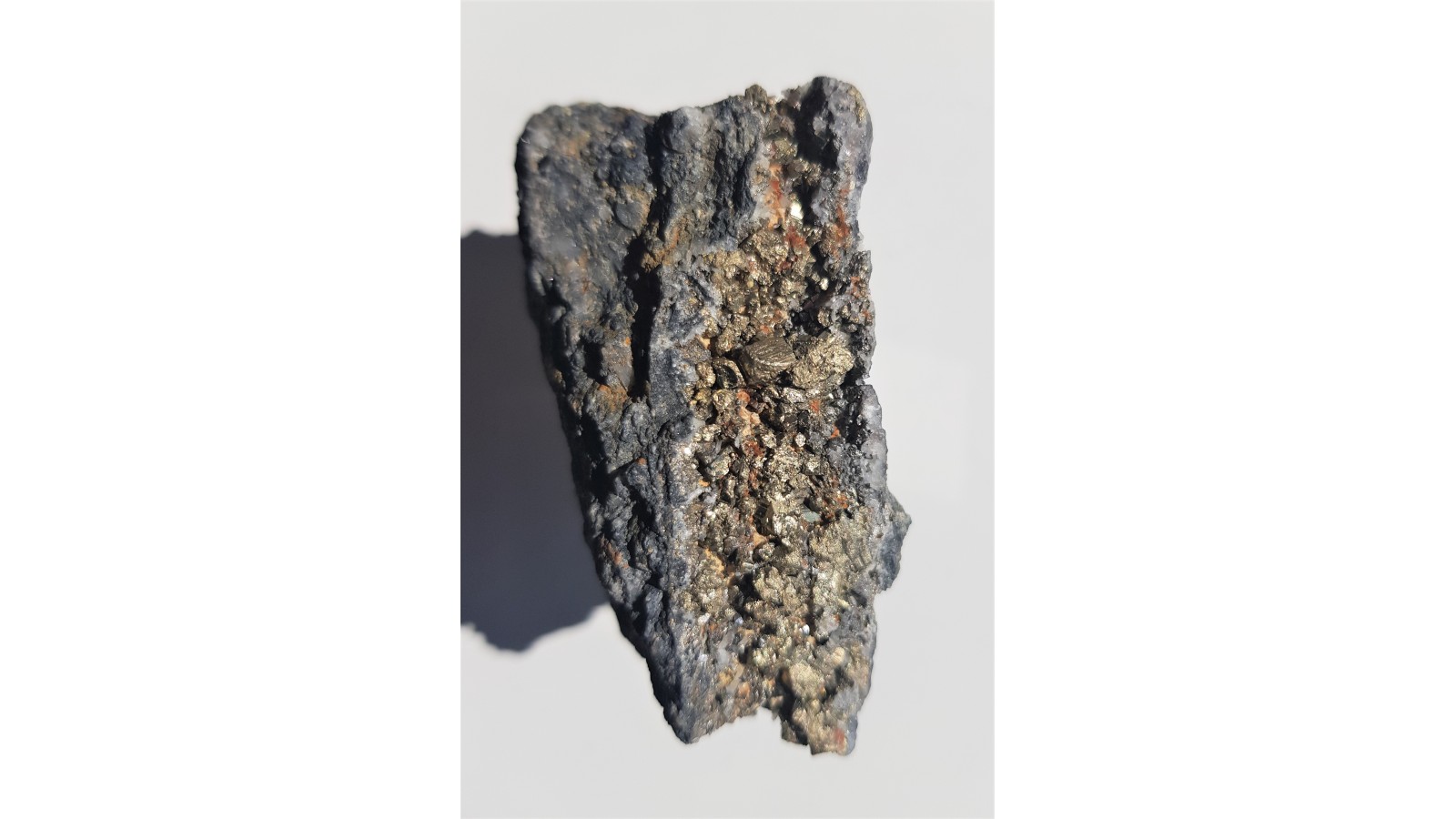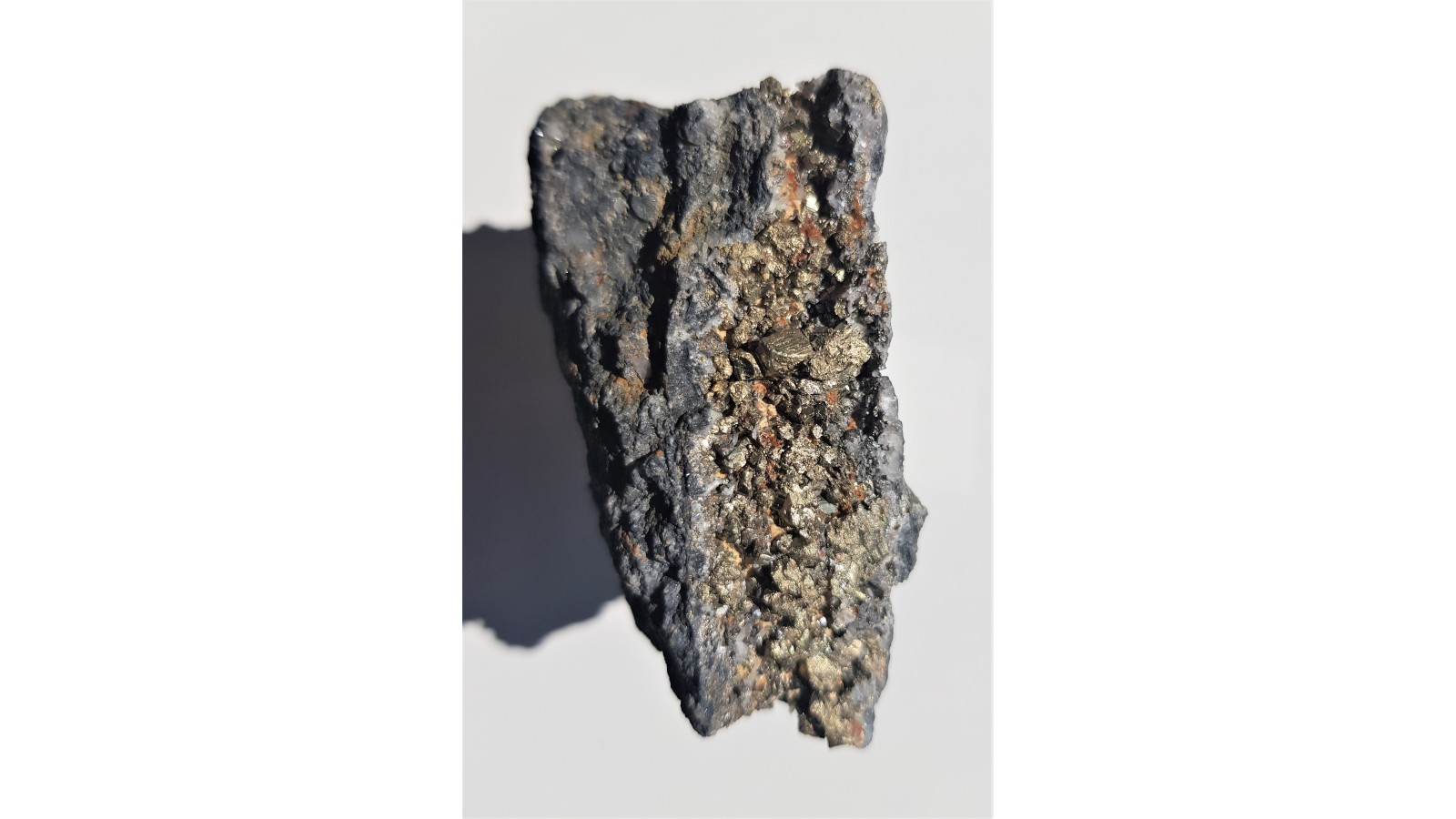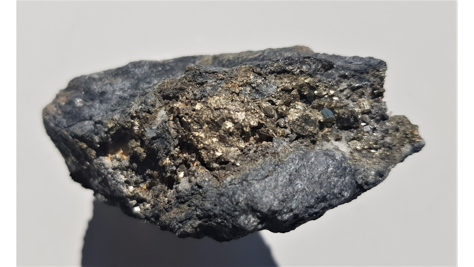 Żyła rudna z łupkach radzimowickich z licznymi, prawidłowo wykształconymi, różnej wielkości kryształami pirytu. Piryt świeży, nie zwietrzały, pięknie odbija światło i jest połyskliwy. Okaz prezentuje się bardzo dobrze z obydwu stron. Wyjątkowy okaz rudny, szczotka. Polecam.