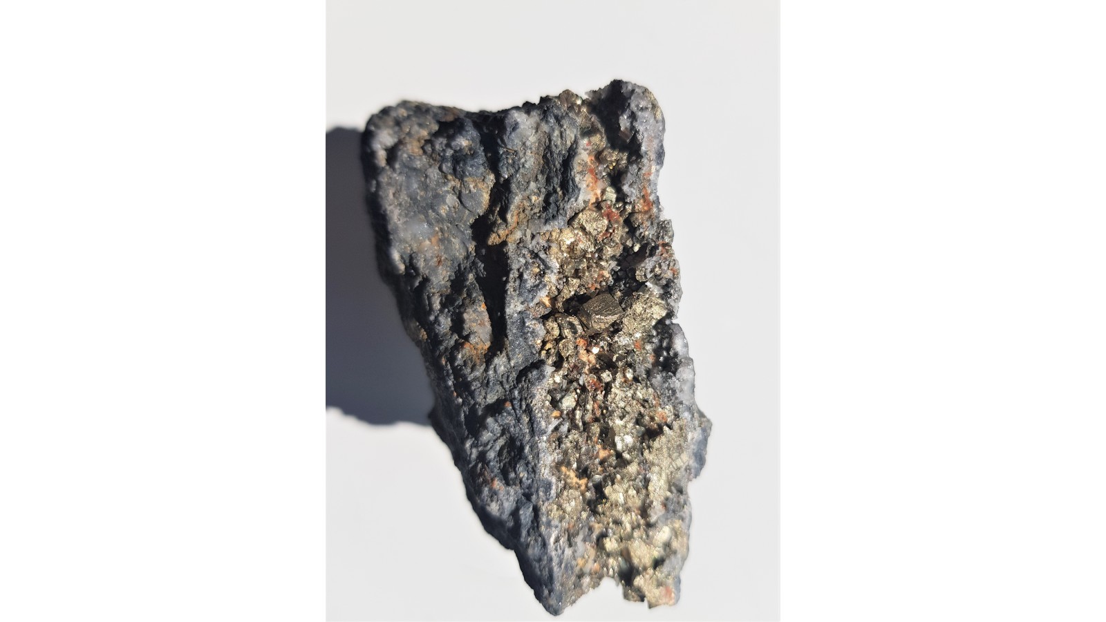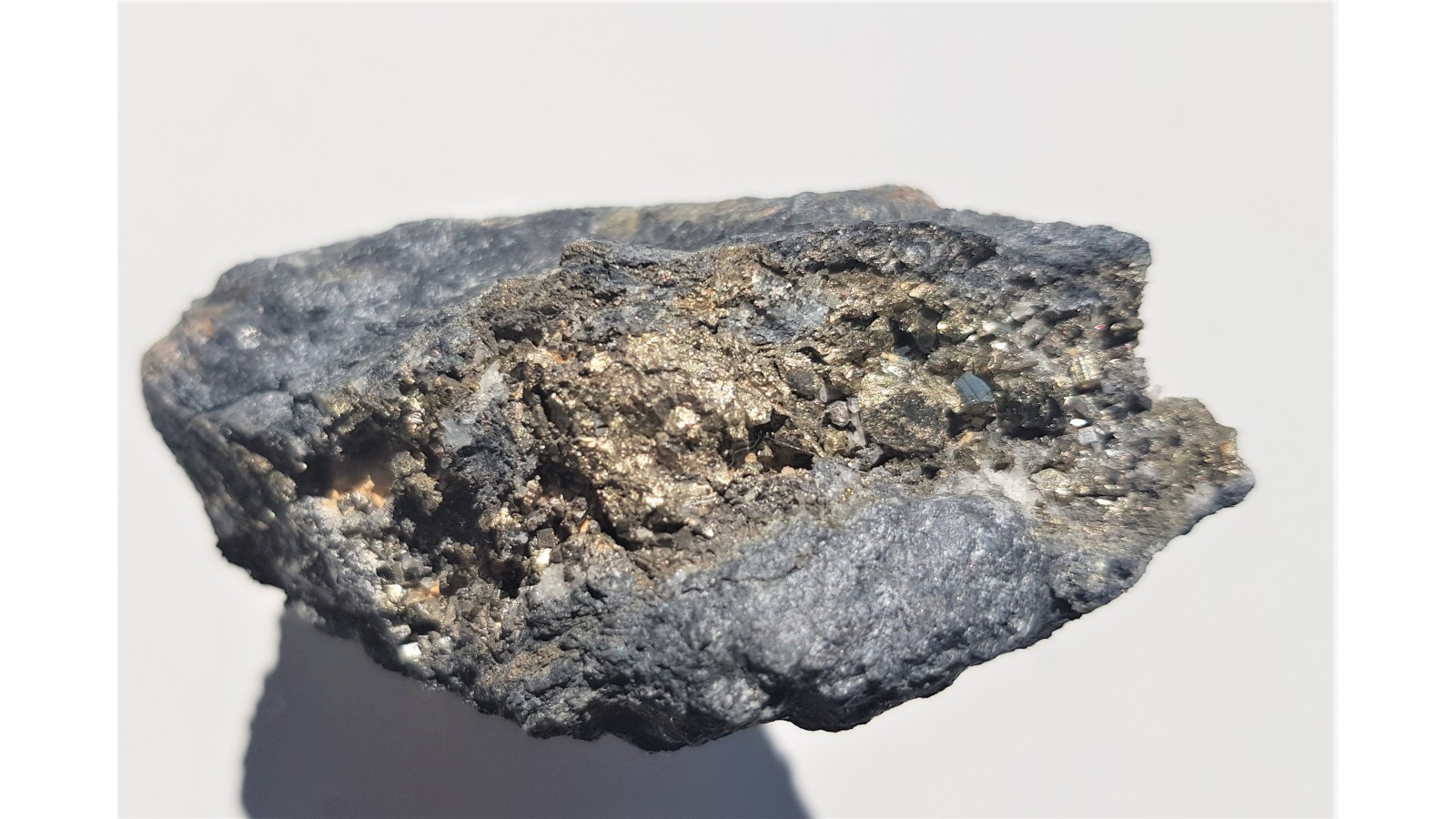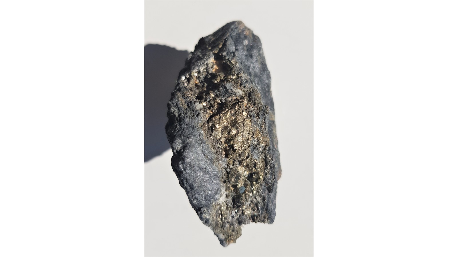 Żyła rudna z łupkach radzimowickich z licznymi, prawidłowo wykształconymi, różnej wielkości kryształami pirytu. Piryt świeży, nie zwietrzały, pięknie odbija światło i jest połyskliwy. Okaz prezentuje się bardzo dobrze z obydwu stron. Wyjątkowy okaz rudny, szczotka. Polecam.