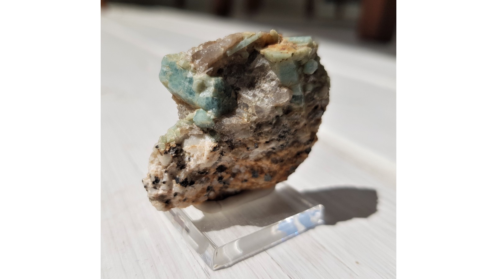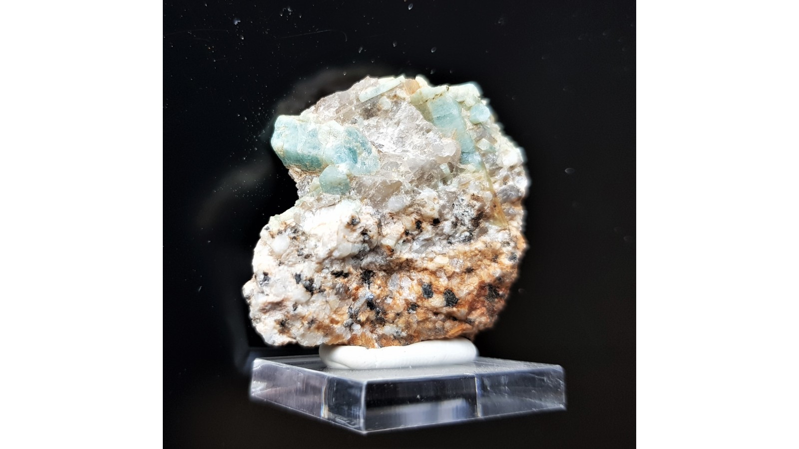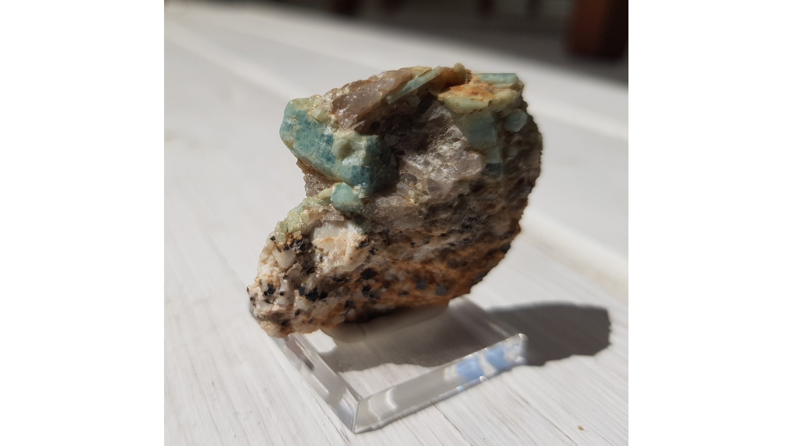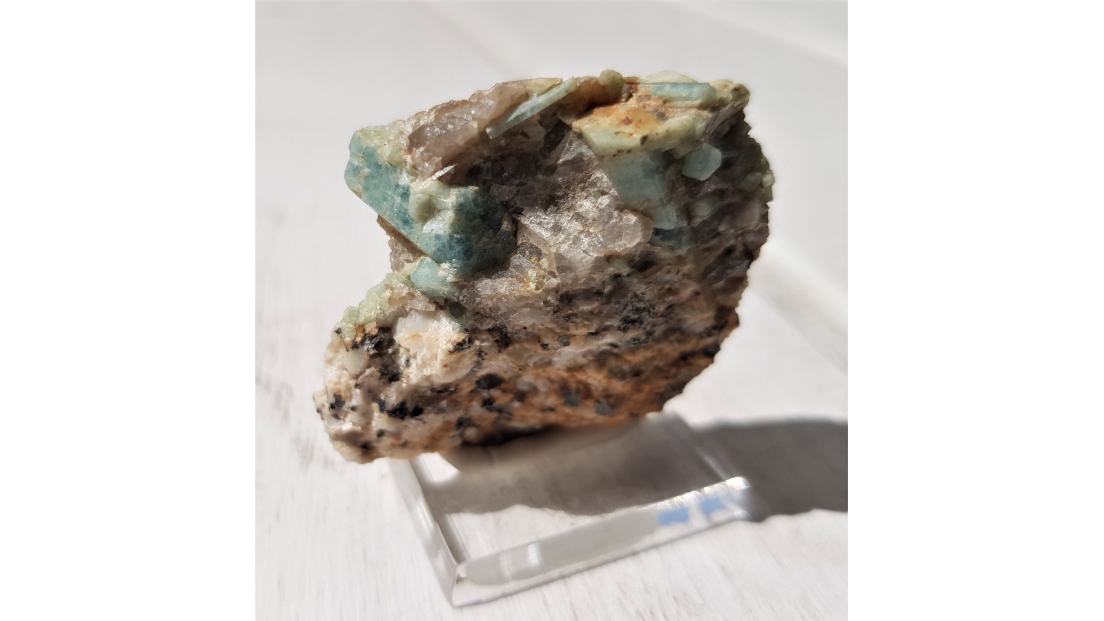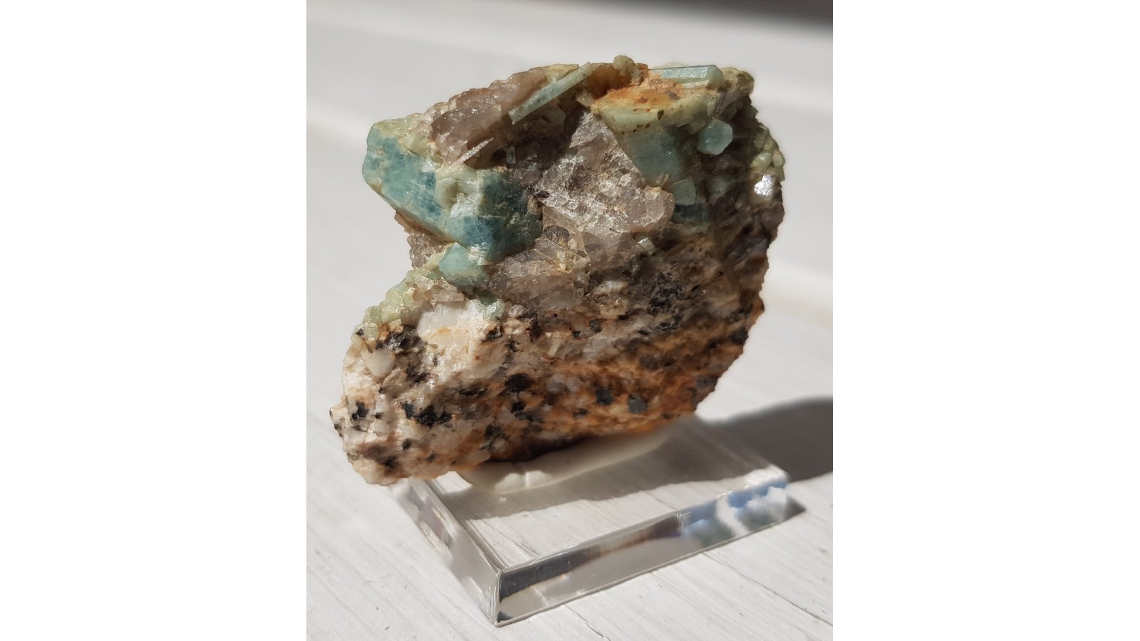 Kryształy akwamarynu (błękitny beryl) w pegmatycie z okolic Szklarskiej Poręby. Ścianki krysztów z połyskiem. Dobre, nieuszkodzone kryształy. Bardzo dobry kolor. Rzadkość mineralogiczna, okazy rzadko oferowane na rynku. Lokalizacja wyeksploatowana. Polecam.