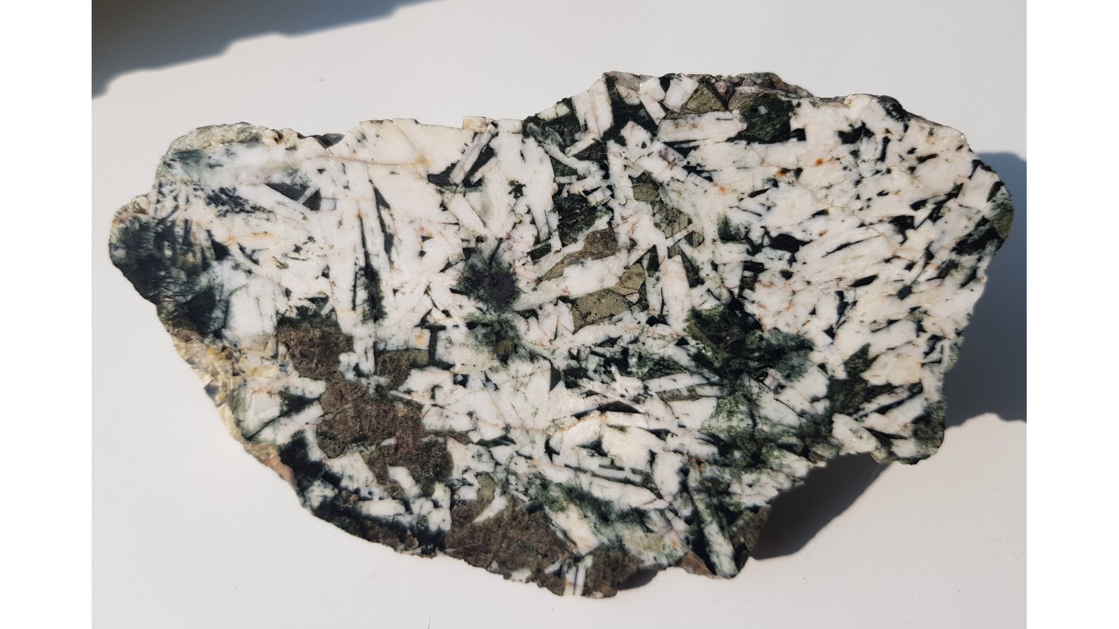 Ozdobne gabro z Nowej Rudy o wyrazistej, ofitowej strukturze. Na przekroju i powierzchni widoczne doskonale jasne kryształy plagiolazów i brązowe pirokseny. Piękny poler. Solidny, niespękany okaz. Strona przeciwna naturalna, nie cięta. Polecam.
