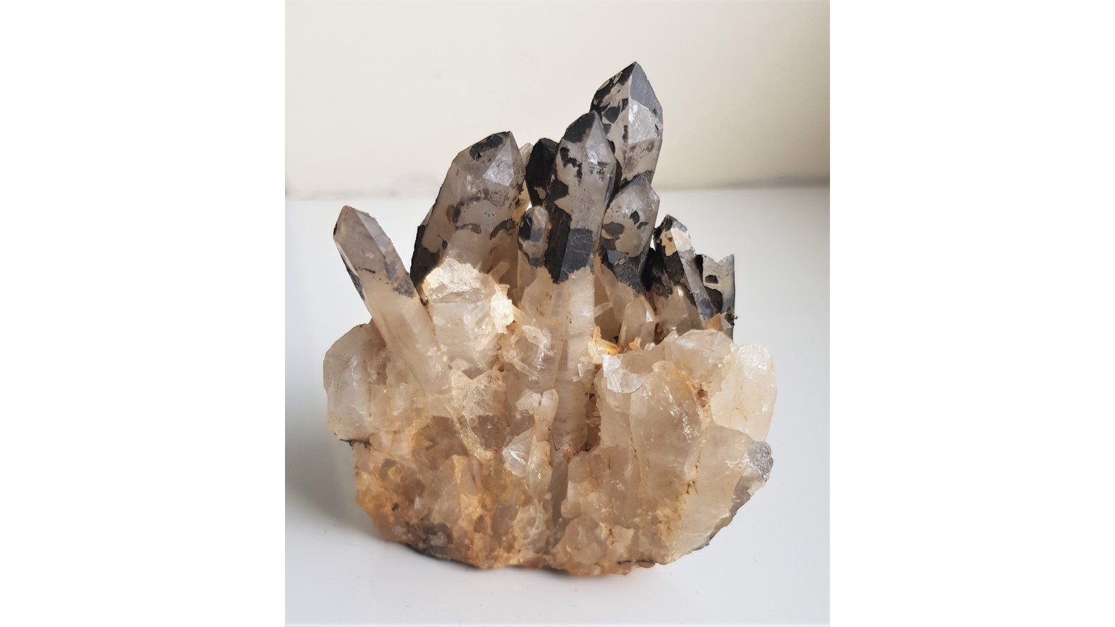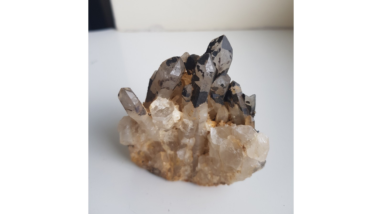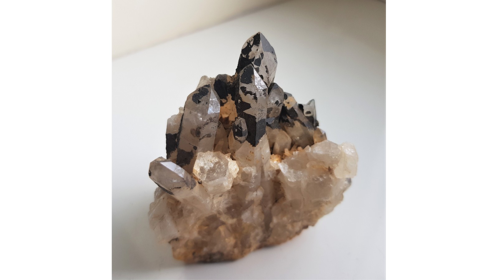 Nieuszkodzona szczotka kwarcowa z żyły kwarcowej w granitach południowej części Opolszczyzny należących do intruzji Strzelin-Żulowa. Kryształy całe, nieuszkodzone, częsciowo pokryte czarnymi nalotami, minerałami żelaza. Polecam.
