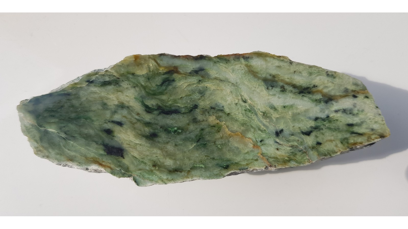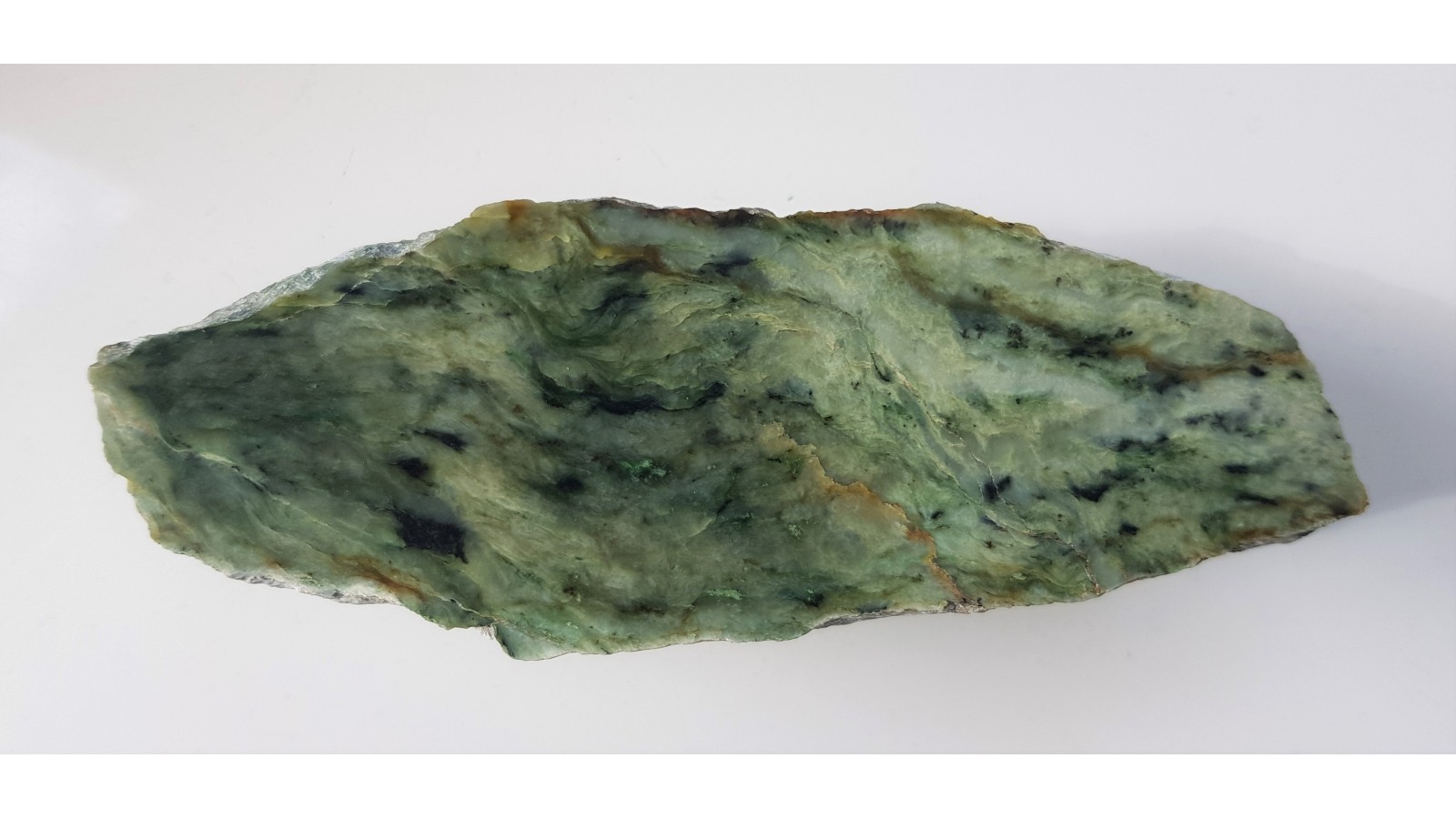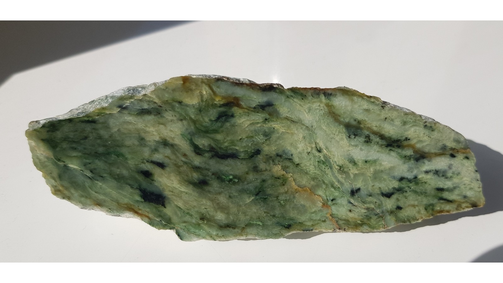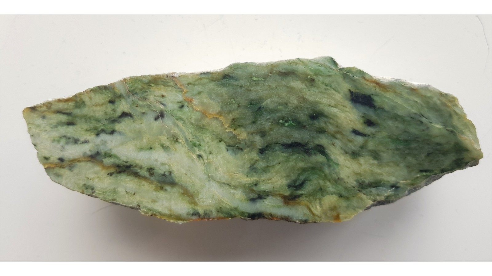 Polerowany okaz nefrytu z Jordanowa Śląskiego. Strona przeciwna naturalna, bez cięcia. Okaz nie jest ciemny, ma zróżnicowaną, dosyć jasną barwę i sporą przejrzystość, jak na nefryt z Jordanowa. Bardzo zróżnicowany deseń. Ciekawy, interesująca faktura. Bardzo dobry kamień. Polecam.