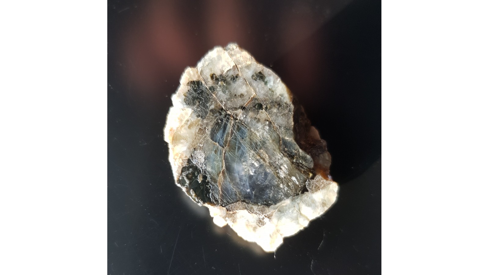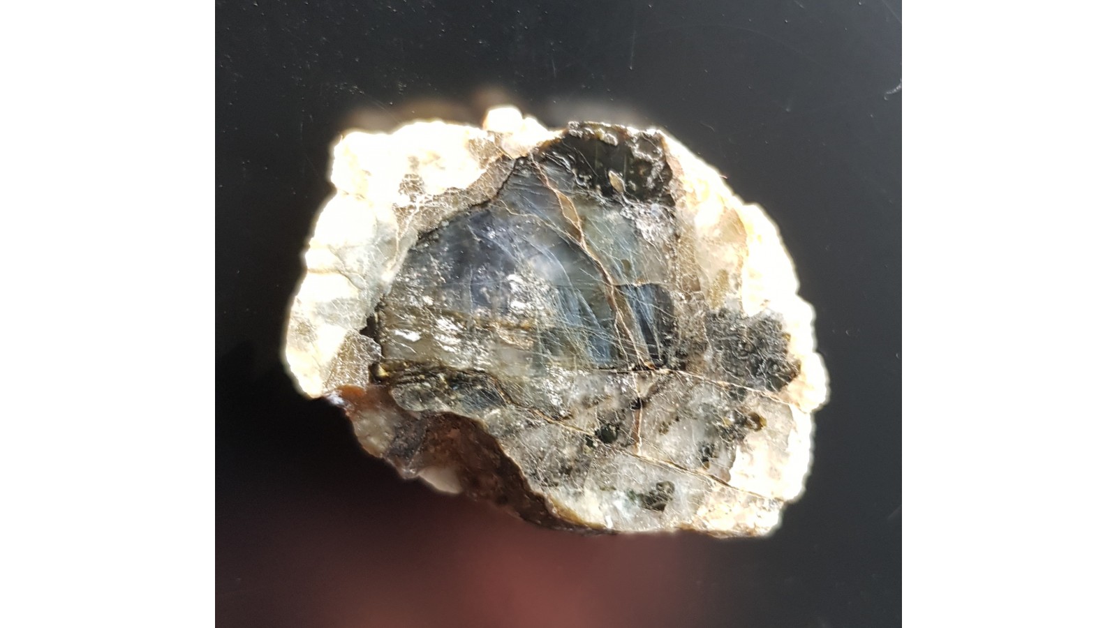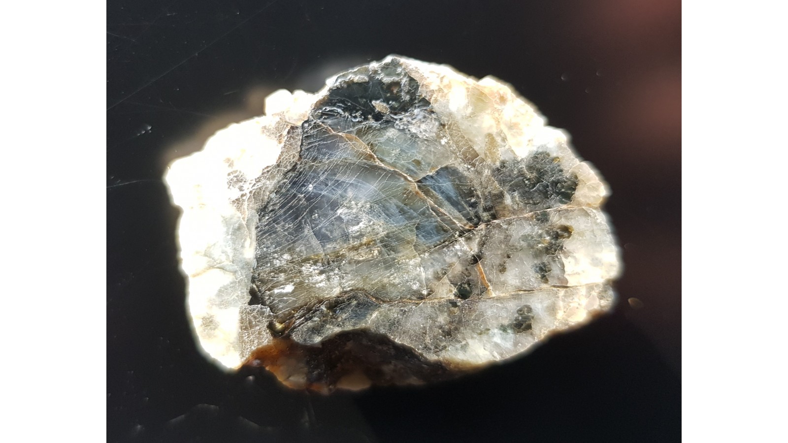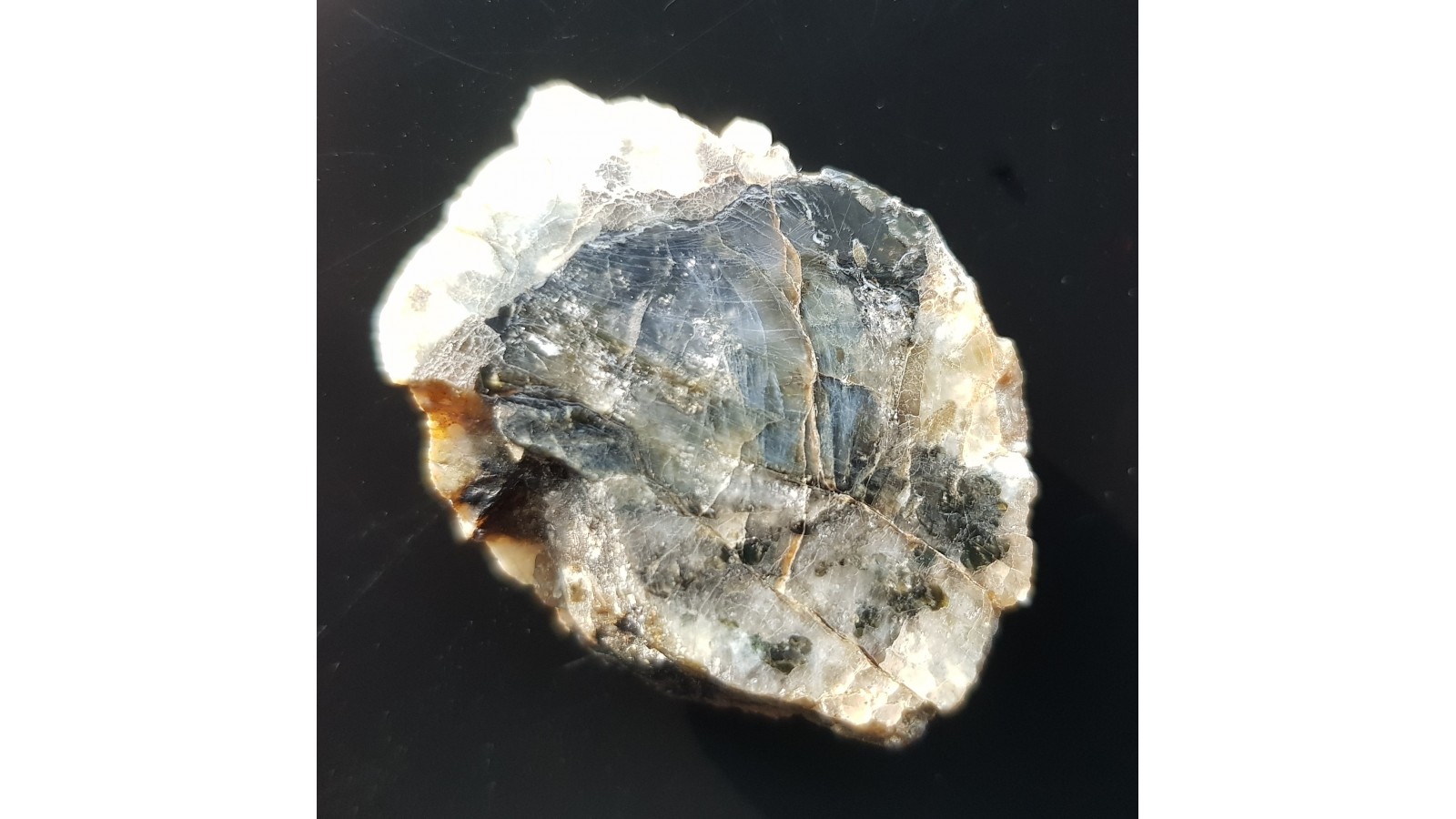 Kryształ przeświecającego, wyraźnie niebieskiego kordierytu wrośnięty w pegmatyt. Okaz z Zagórza Śląskiego. Okaz polerowany, strona odwrotna naturalna, niepolerowana. Aktualnie historyczny unikat. Polecam.