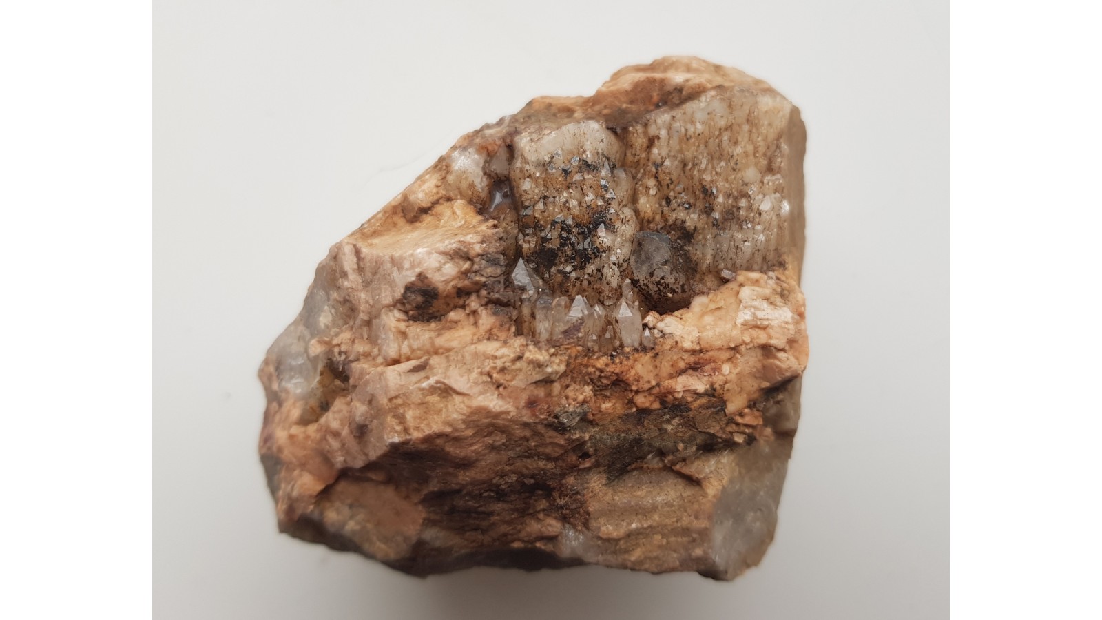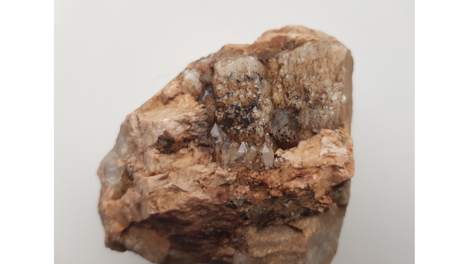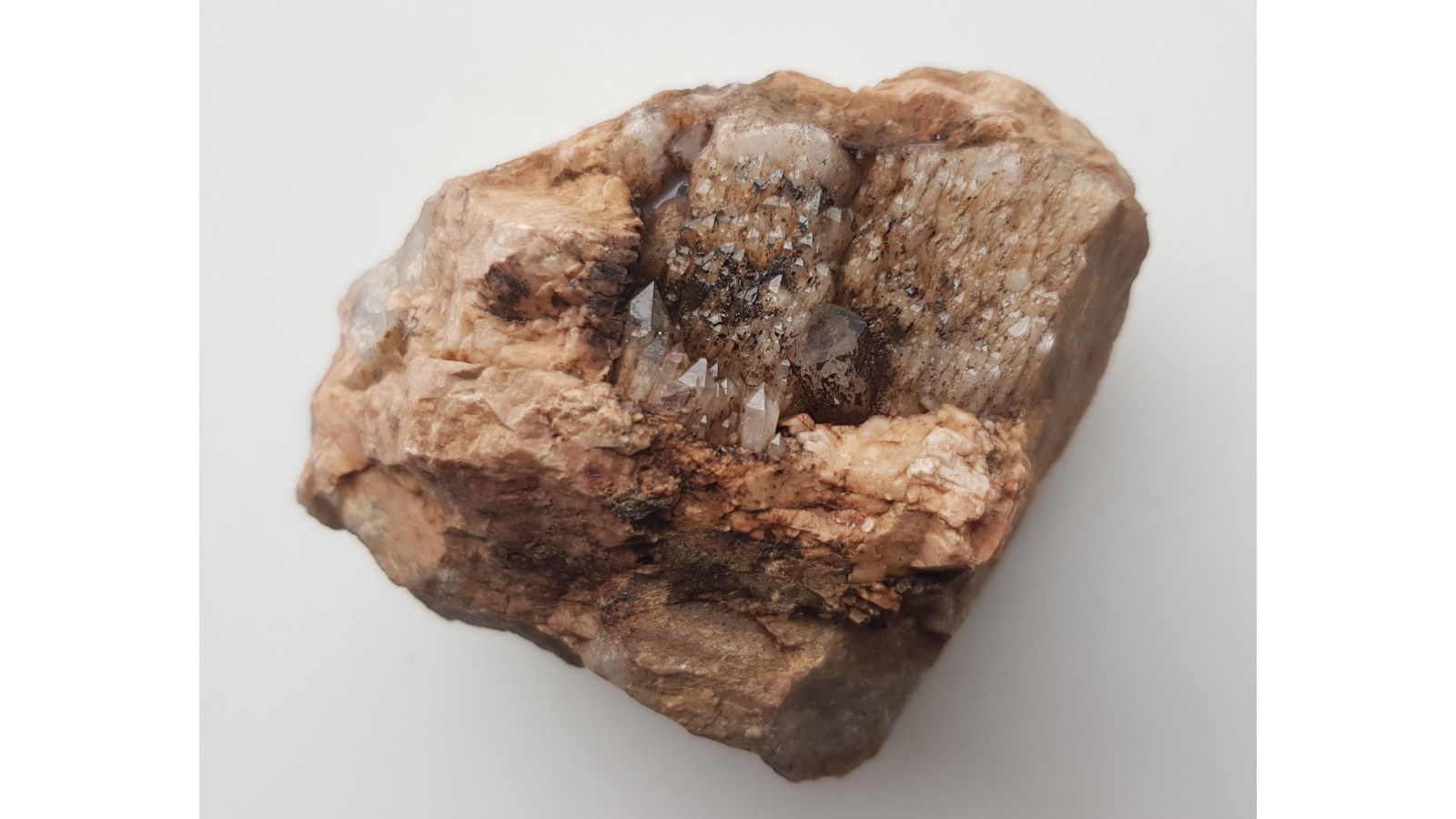 Estetyczna, całkowicie nieuszkodzona szczotka skaleniowo-kwarcowa z pegmatytów okolic Jeleniej Góry. Drobne kryształy kwarcu narastają w sposób uporządkowany na wyrazistych kryształach skaleni potasowych. Polecam.