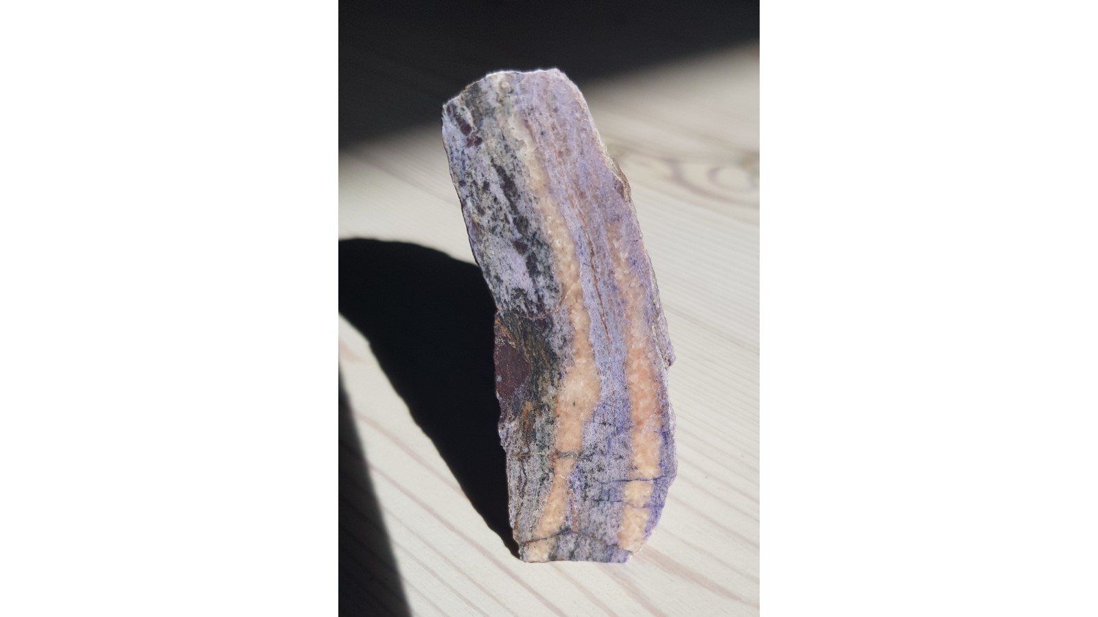 Skała o wyrazistej teksturze planarnej, łupkowej, masywna, intensywnie impregnowana fioletowym fluorytem. Niezwykła skała o wyglądzie słabszej jakości czaroitu. Poler jednostronny, strona przeciwna naturalna, bez cięcia. Okaz z Kletna. Polecam.