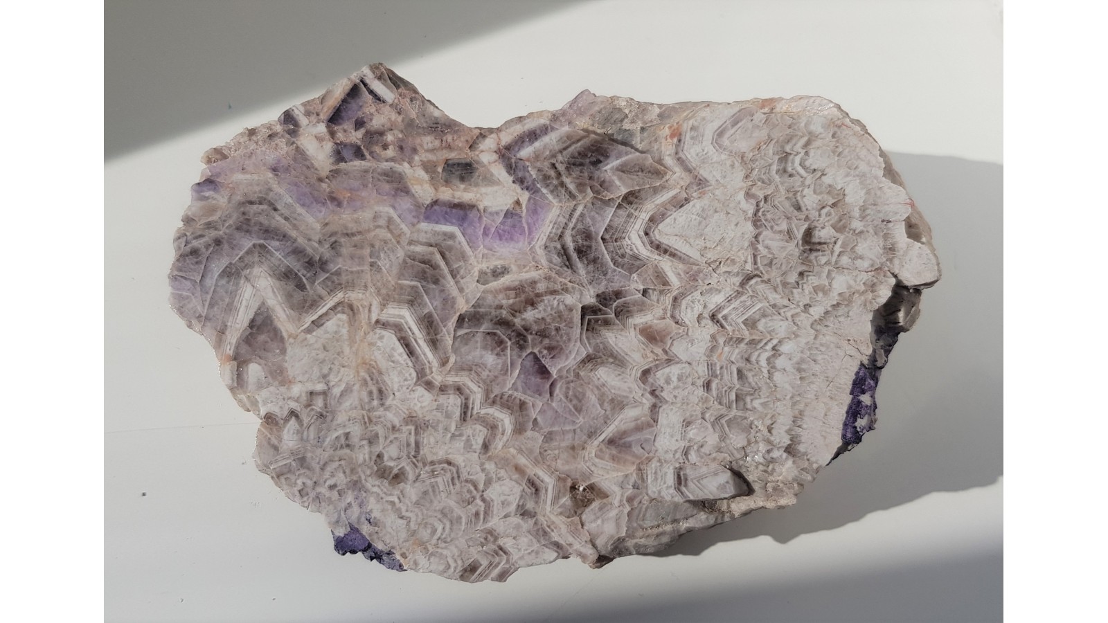 Przekrój przez żyłę kwarcowo-ametystową z Kletna. Bardzo dekoracyjny, szeronowy deseń żyły, w której część przekroju to kwarc, także dymny a część to ametyst. Bardzo estetyczny okaz polerowany z jednej strona. Strona przeciwna naturalna. Polecam.