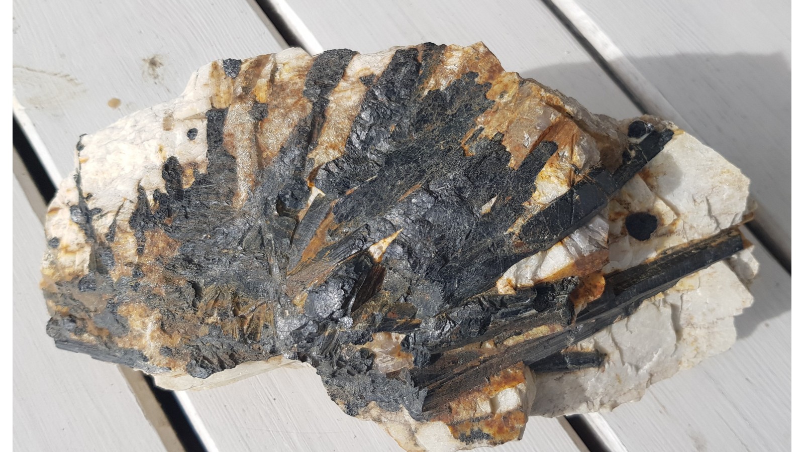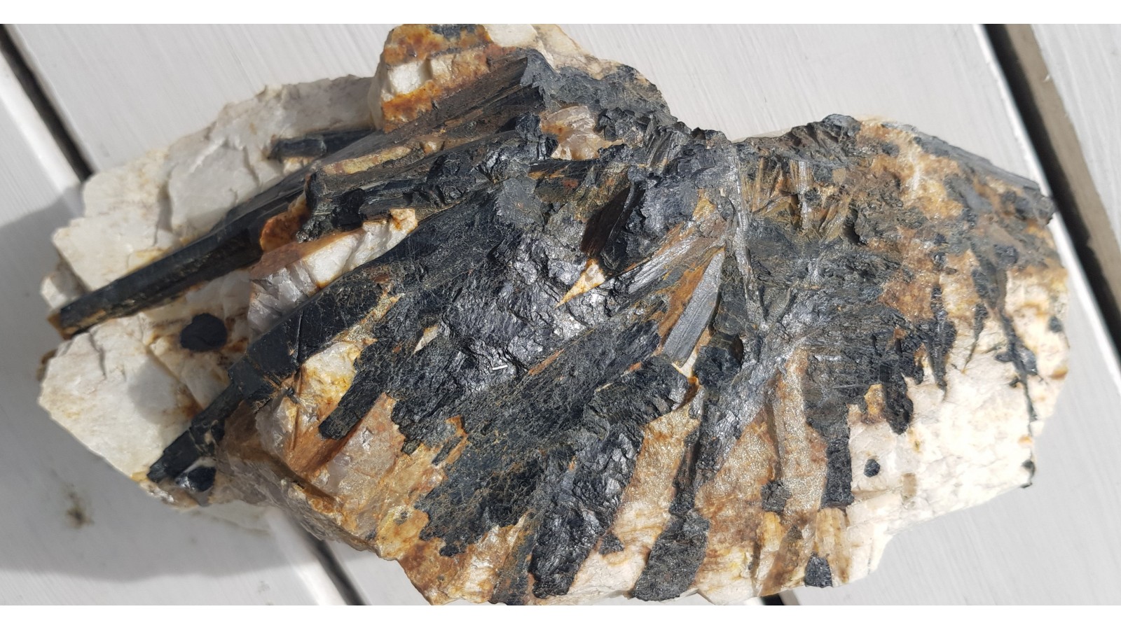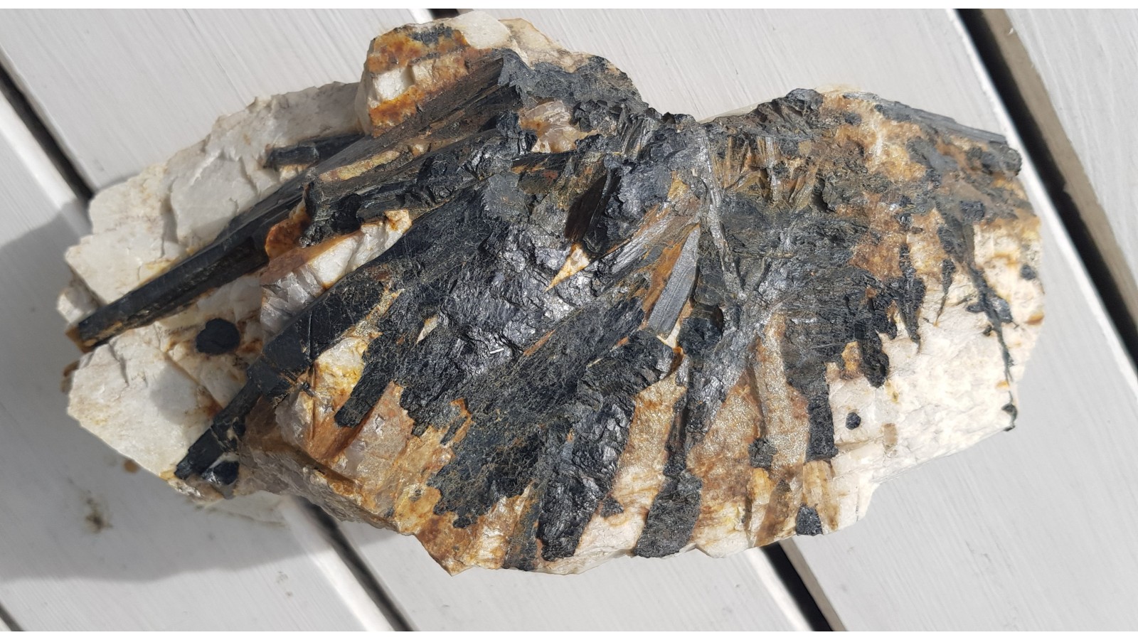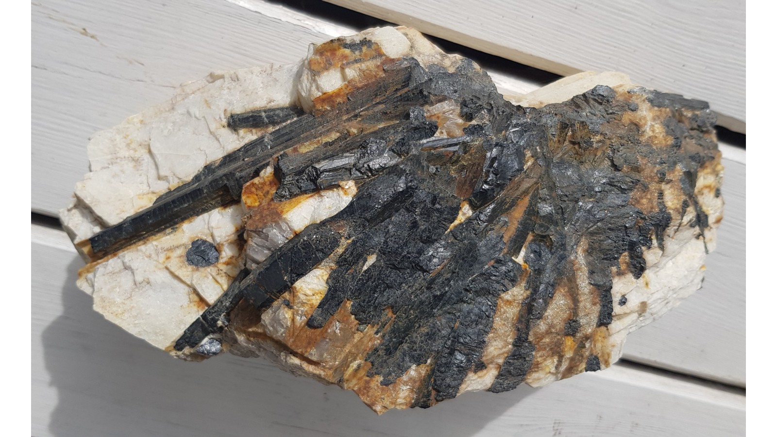 Grupa licznych kryształów turmalinu o charakterystycznym układzie tzw. słońca turmalinowego z Piławy Górnej w obrębie bloku sowiogórskiego. Kryształy świeże, z pięknym połyskiem. Duży okaz. Polecam.