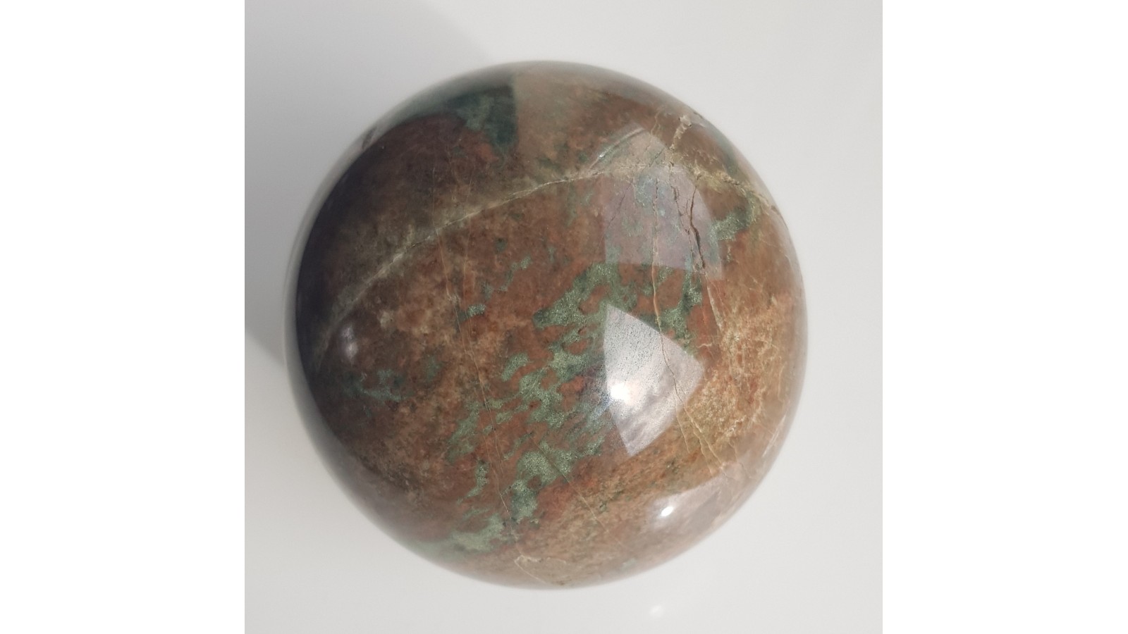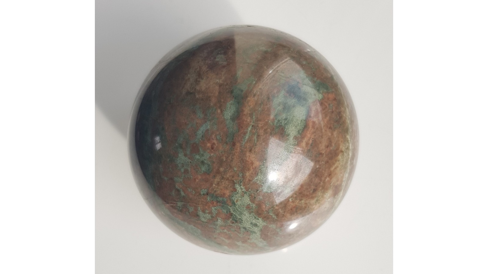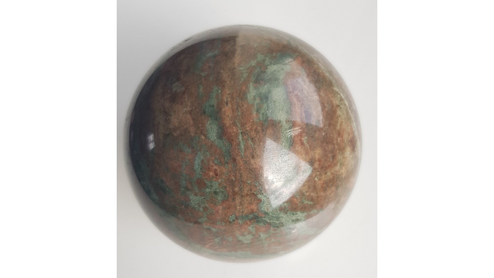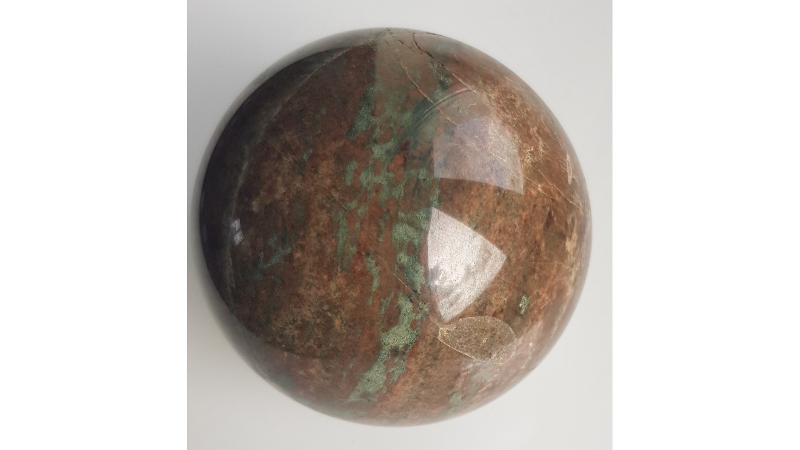 Piękna kula, bardzo mało spękań, z ozdobnego, granatowo-piroksenowego skarnu z mało znanego miejsca występowania w Siedlimowicach na Przedgórzu Sudeckim. Skała bardzo lita, masywna, barwy brązowawo-zielonej. Miejscami smugowana, piękna, kontrastowa skała. Idealny poler, bardzo estetyczna. Polecam.