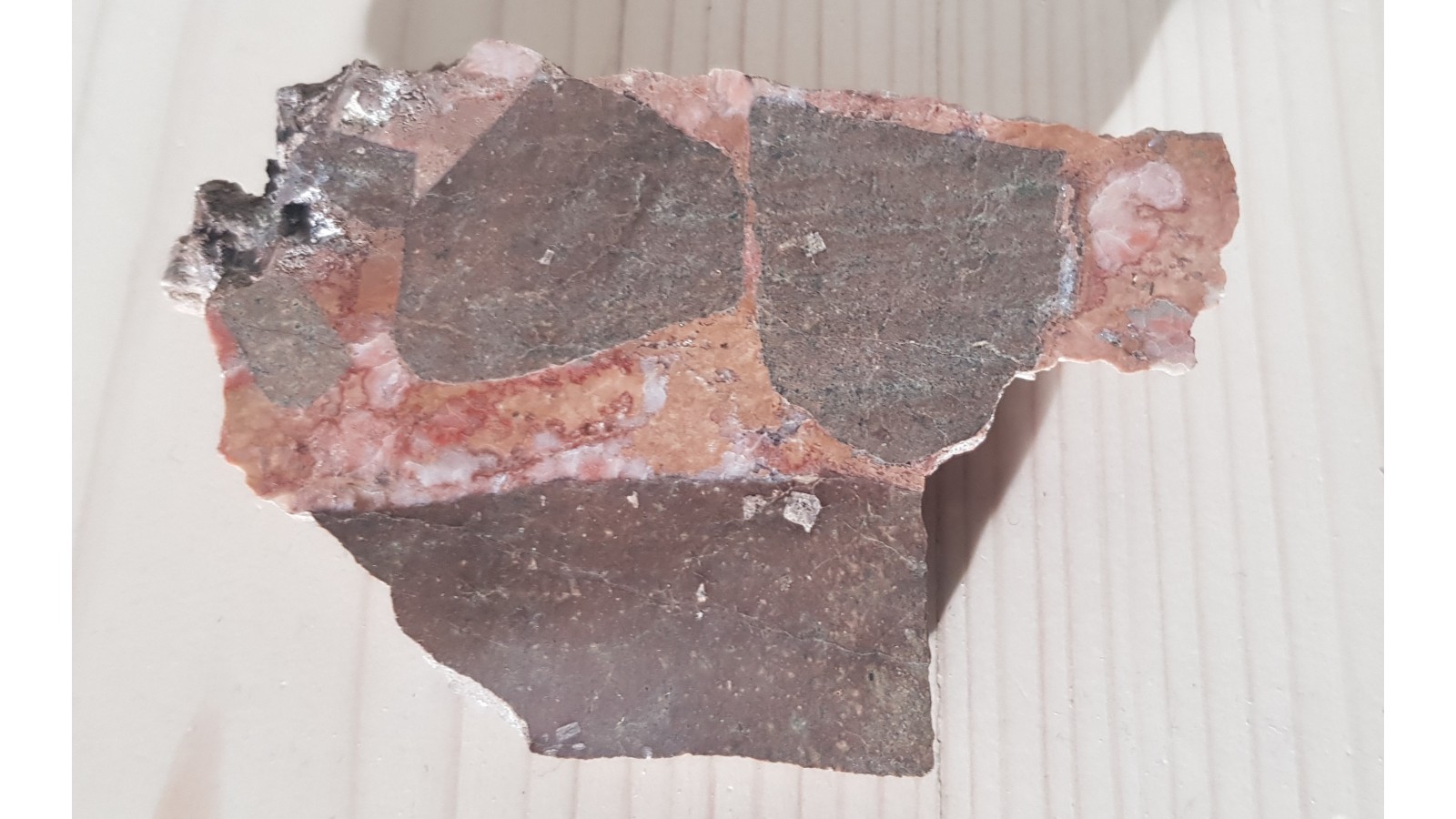 Polerowane żyłki kwarcowo-chalcedonowo-węglanowe pochodzące z ryolitów okolic Ogorzelca k. Kamiennej Góry. Żyłki pojawiają się w strefie ostrokrawędzistej brekcji skalnej. Generalnie chalcedon ma barwę pomarańczowoczerwoną zaś węglany są żółtaworóżowawe. Strona przeciwna naturalna, bez cięcia. Okazy ze słabo znanej lokalizacji, czasami impregnowane drobnym pirytem. Polecam.