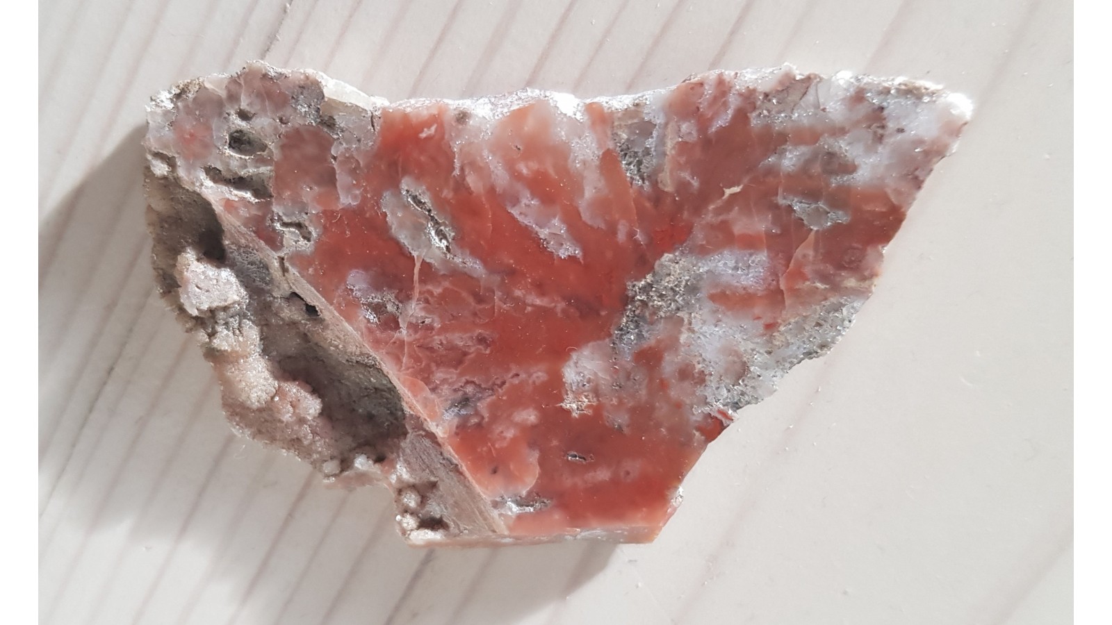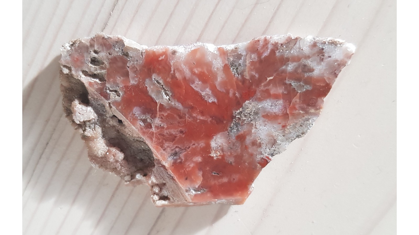 Polerowane żyłki kwarcowo-chalcedonowo-węglanowe pochodzące z ryolitów okolic Ogorzelca k. Kamiennej Góry. Żyłki pojawiają się w strefie ostrokrawędzistej brekcji skalnej. Generalnie chalcedon ma barwę pomarańczowoczerwoną zaś węglany są żółtaworóżowawe. Strona przeciwna naturalna, bez cięcia. Okazy ze słabo znanej lokalizacji, czasami impregnowane drobnym pirytem. Polecam.