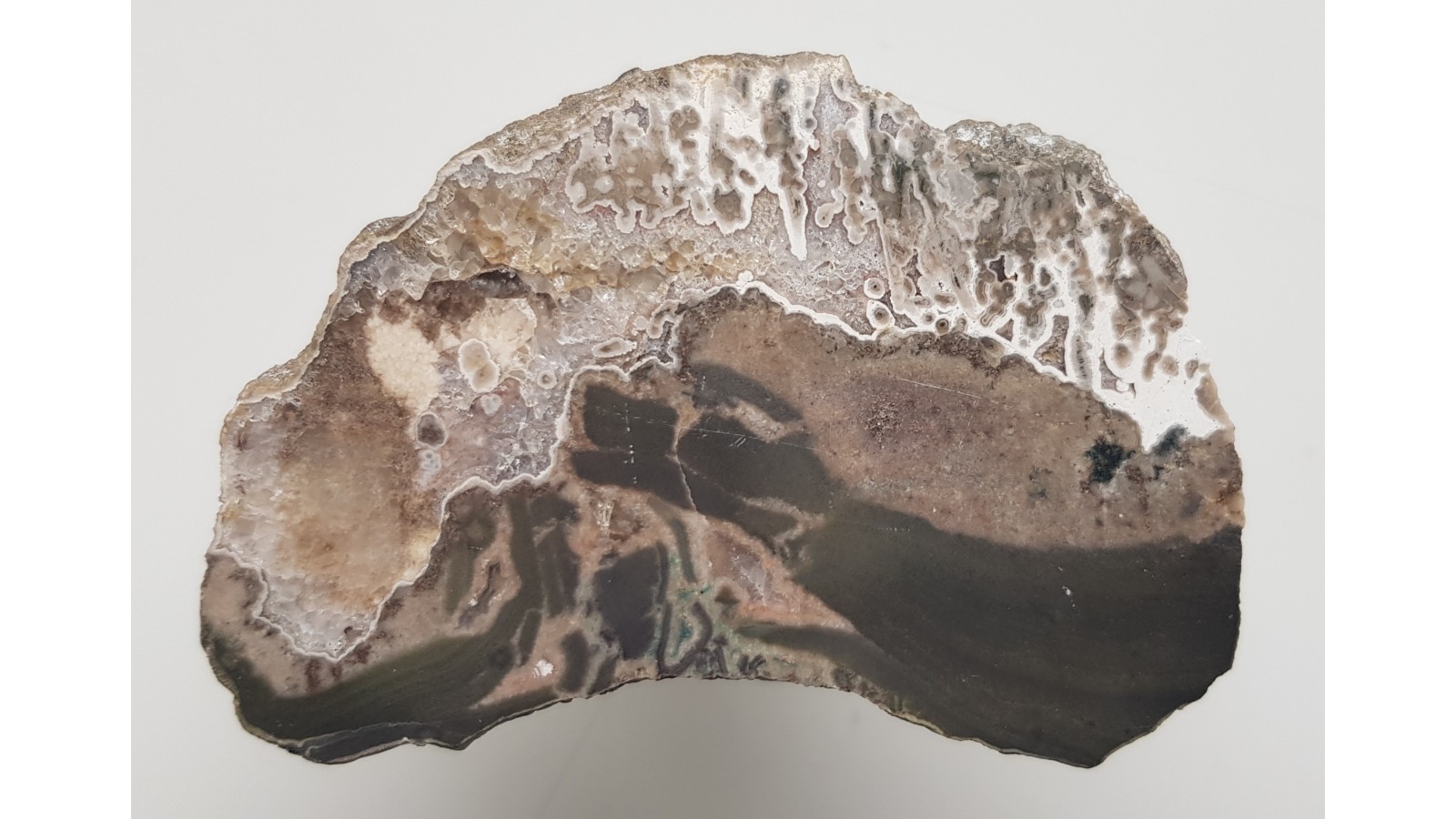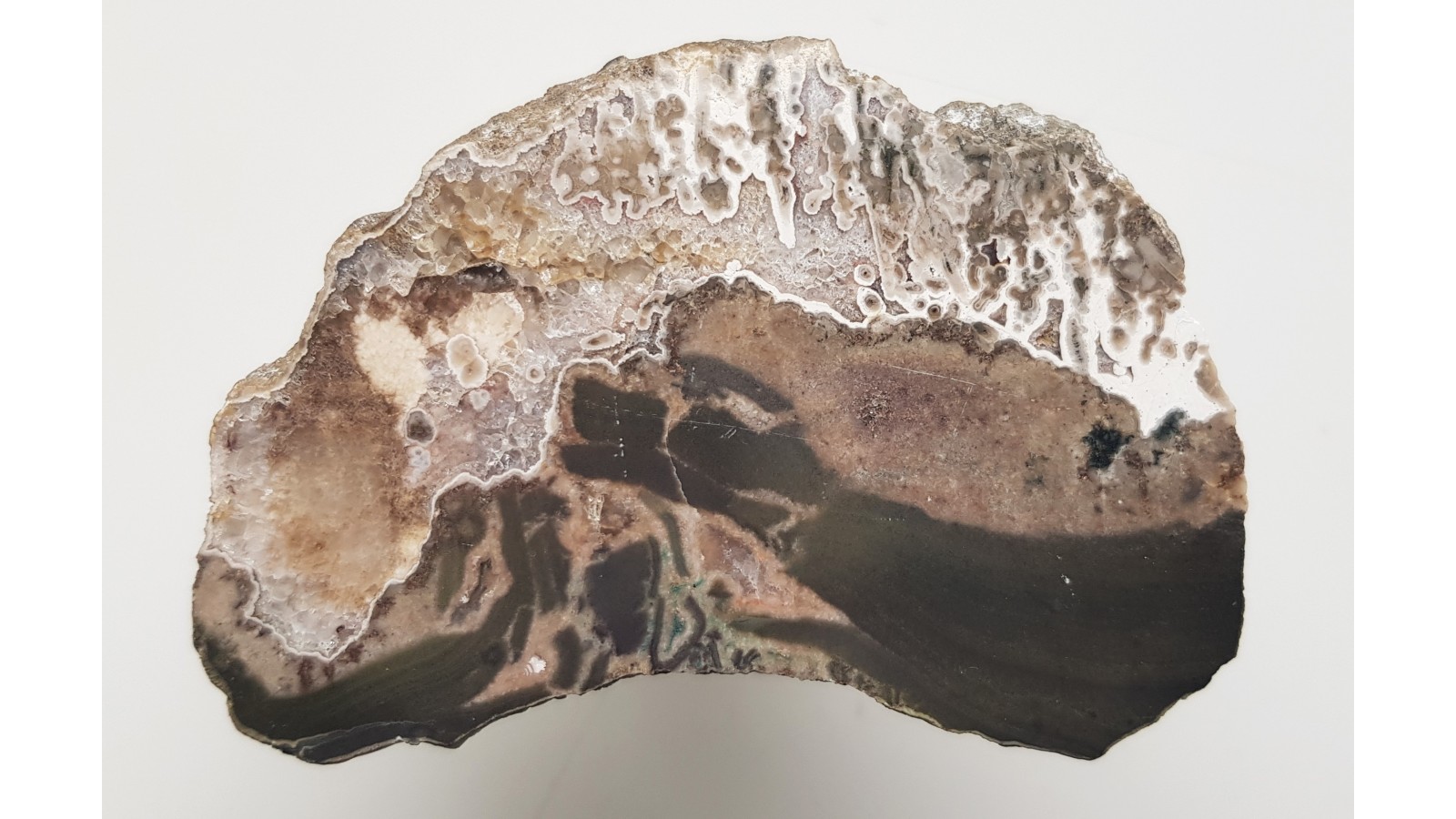 Agat z Lubiechowej o ciekawej strukturze. Okaz polerowany, strona przeciwna naturalna, powierzchnia wezykla. Bardzo estetyczny okaz bez istotnych wad i spękań. Polecam.