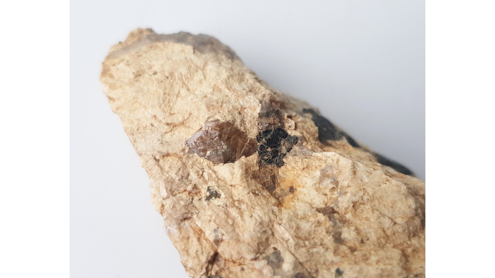 Wyjątkowy okaz tytanitu o bardzo silnym połysku, świeży, idealnie cały, w matriks z Gór Sowich. Matriks przypomina pegmatyt. Jest wyjątkowo grubokrystaliczną strefą w granulitach bądź eklogitach. W próbce także liczne, czarne kryształy hornblendy. Największy kryształ tytanitu ok. 1 cm, pozostałe na odwrocie próbki. Okaz z obszaru bloku sowiogórskiego z okolic Bielawy.