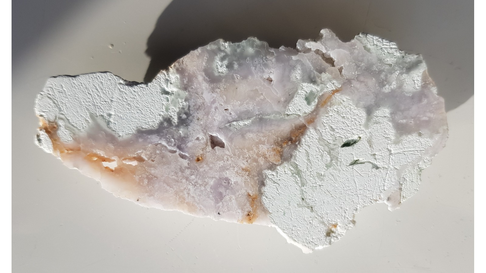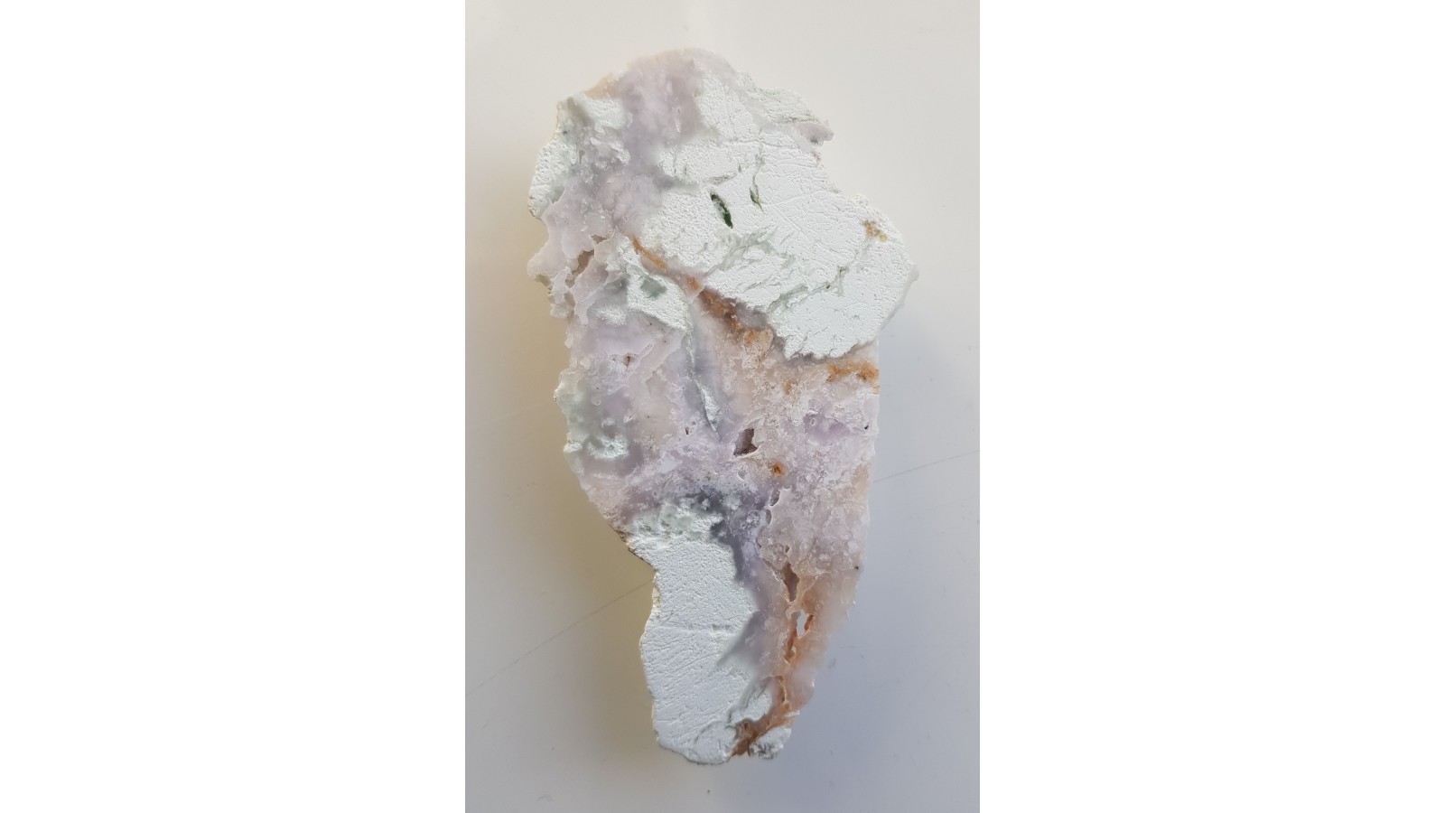 Nowe wystąpienie fioletowo zabarwionego chalcedonu z Wir k. Sobótki. Unikatowe zabarwienie jest spowodowane niewielką domieszką chromu (badanie wykonano przenośnym spektrometrem xrf). Absolutnie rzadki, wyjątkowy materiał. Barwa jest wyraźna, choć nie jest bardzo intensywna. Okaz polerowany jednostronnie, strona przeciwna naturalna. Polecam.