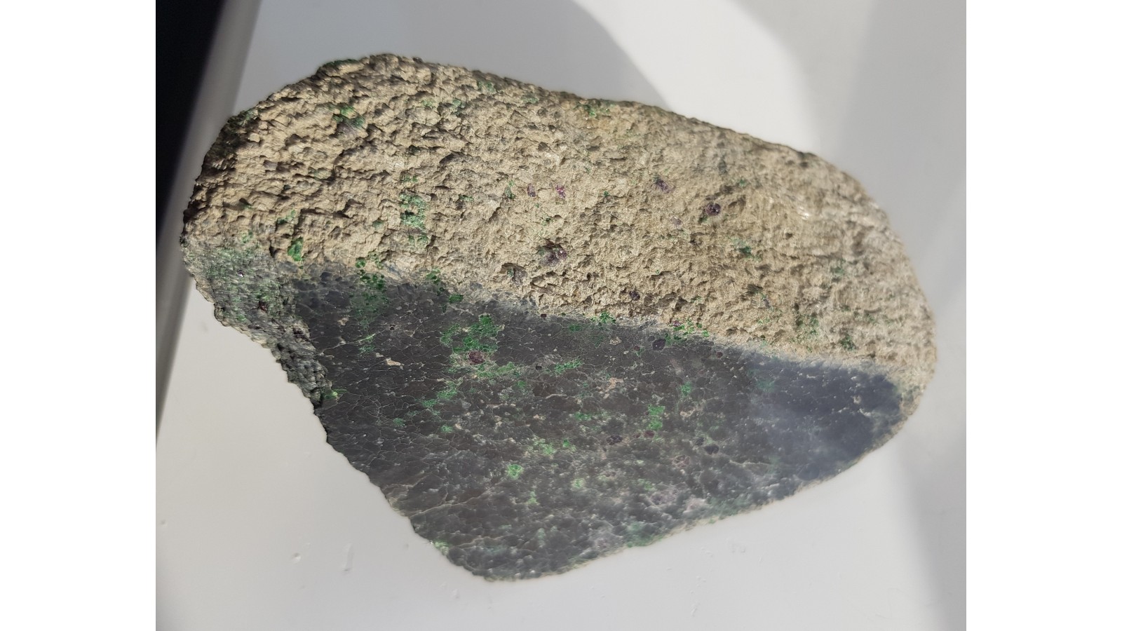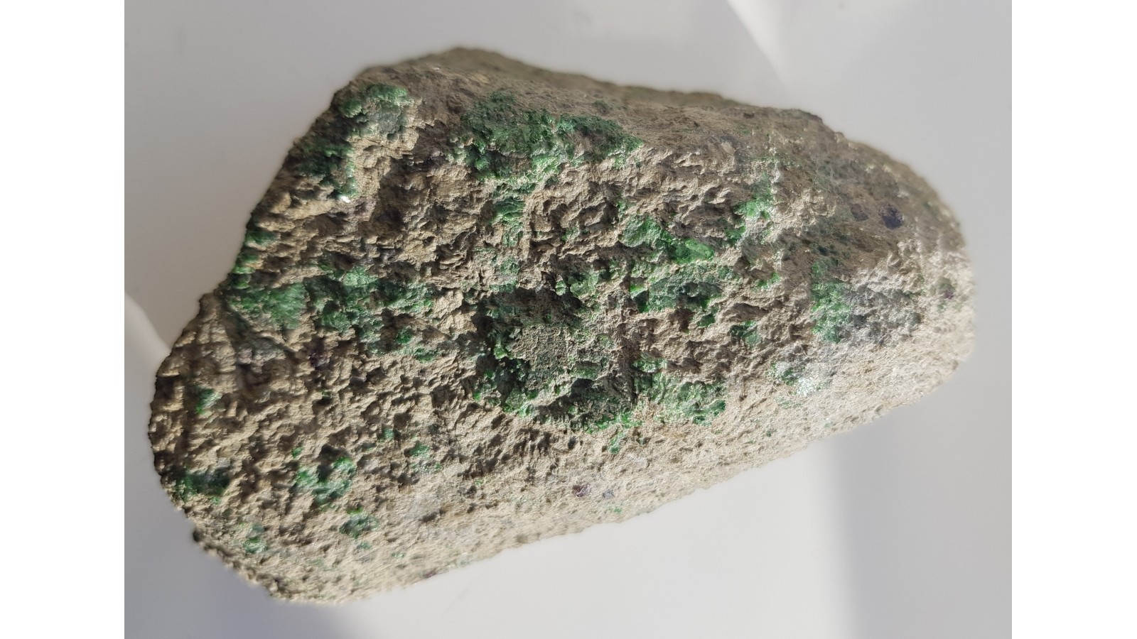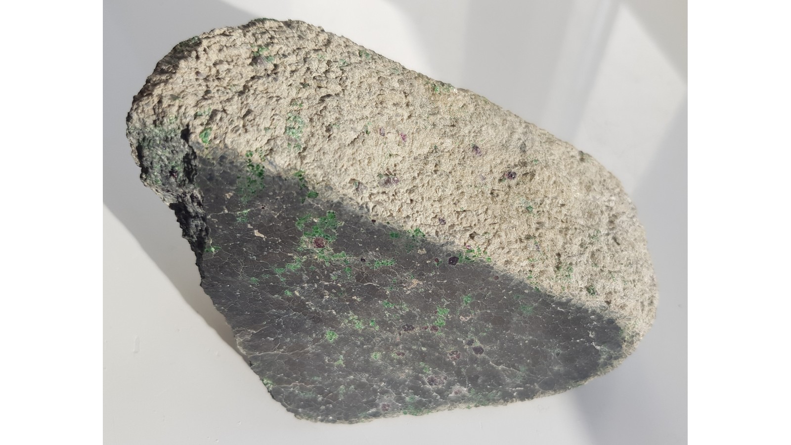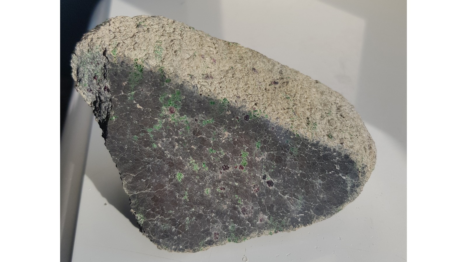 Wysokiej jakości okaz kimberlitu z jednego z nielicznych wystąpień kimberlitów w Europie w Kaavi w Finlandii. Widoczne minerały typowe dla kimberlitów - duża ilość diopsydu chromowego oraz piropy. Okaz całkowicie masywny, ciężki, świeży, absolutnie bez żadnych oznak nadwietrzenia, co w tej lokalizacji jest rzadkością. Enklawa ze zwietrzałego kimberlitu. Okaz z jednej strony polerowany, idealny poler. Polecam.