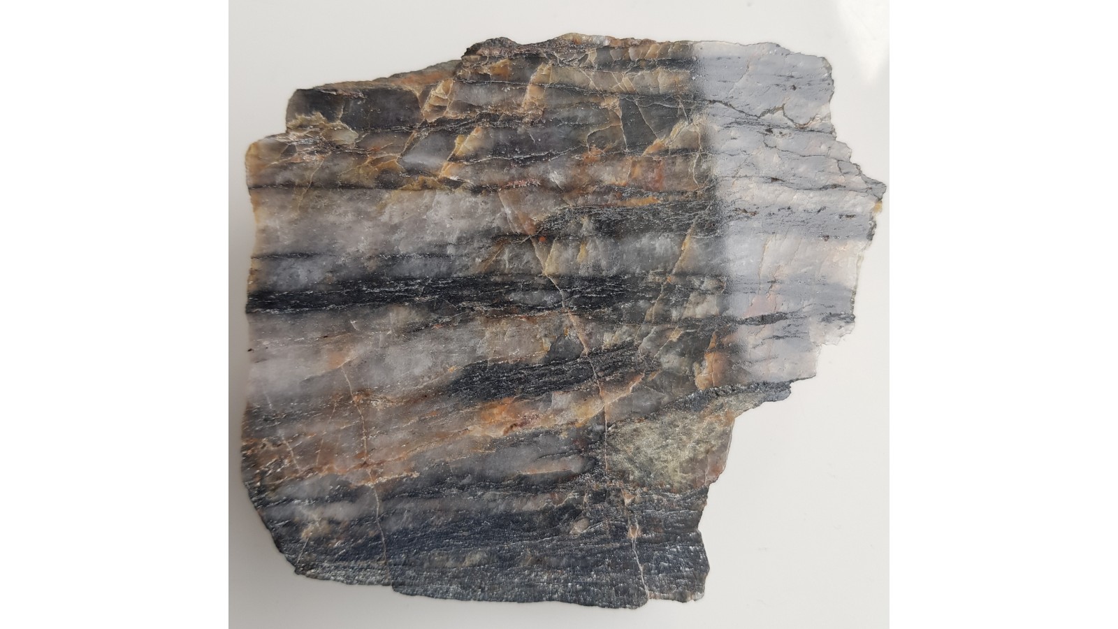 Polerowany okaz skały z otoczenia granitoidów masywu Strzegom-Sobótka z okolic Siedlimowic. Hornfels kwarcowy z wyraźnymi strukturami planarnymi. Okaz polerowany jednostronnie. Strona przeciwna naturalna, bez cięcia. Polecam.