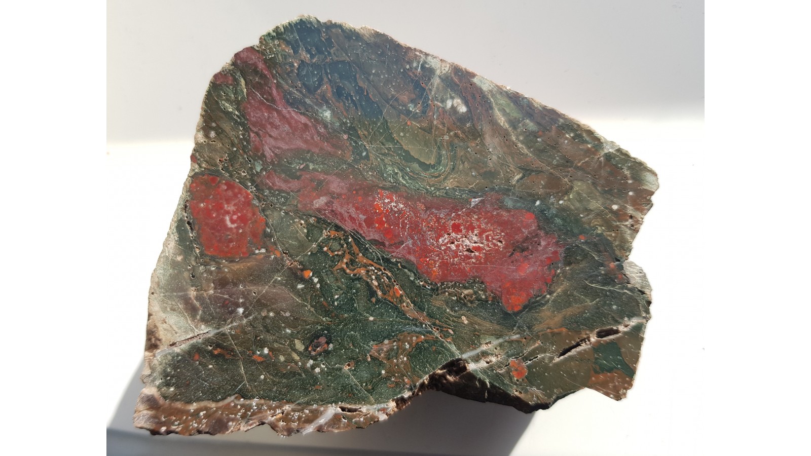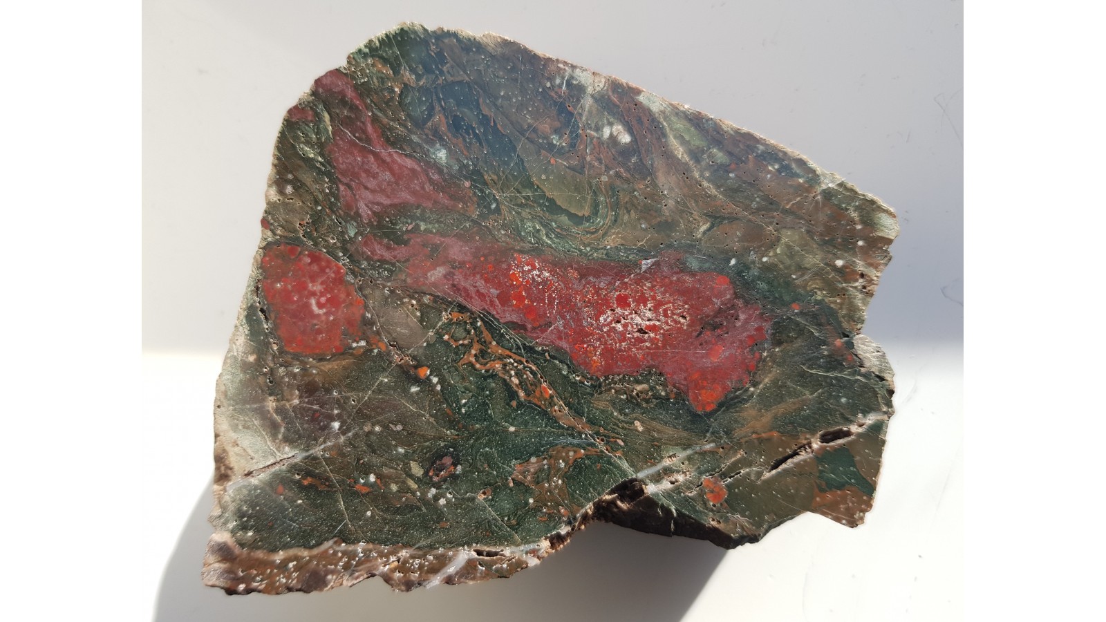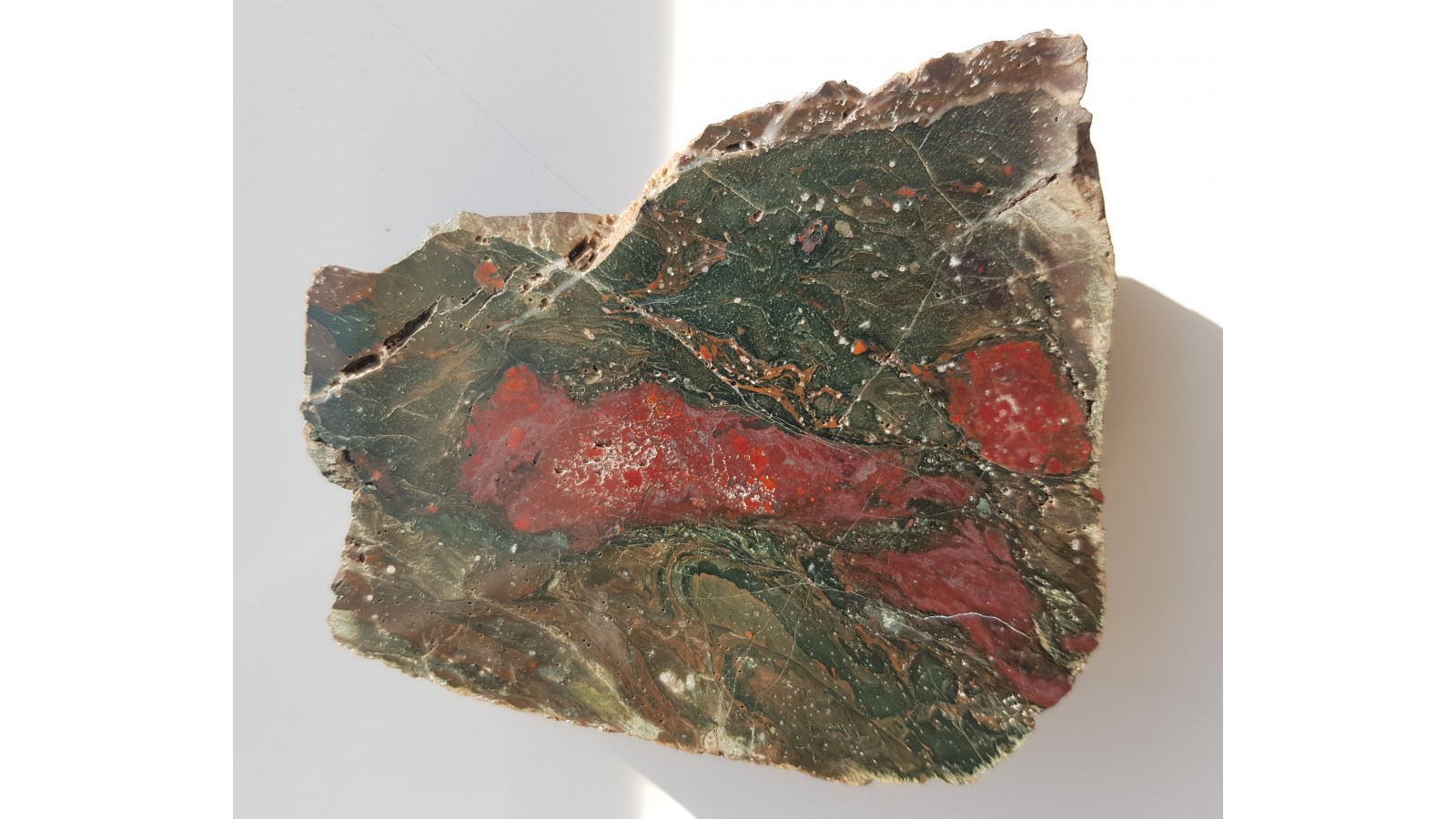 Rzadkość - zielony chalcedon/jaspis z czerwonymi plamami i plamkami ze Starych Bogaczowic (zlepieńce kulmu). Okaz polerowany jednostronnie, strona przeciwna naturalna, bez cięcia. Tego typu okazy są w tej lokalizacji absolutnie wyjątkowe. Polecam.