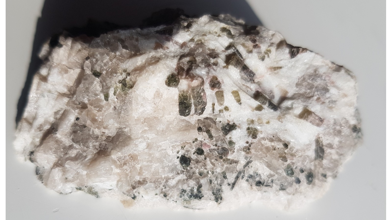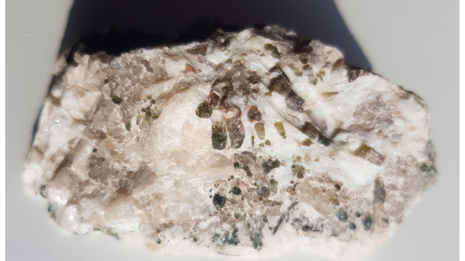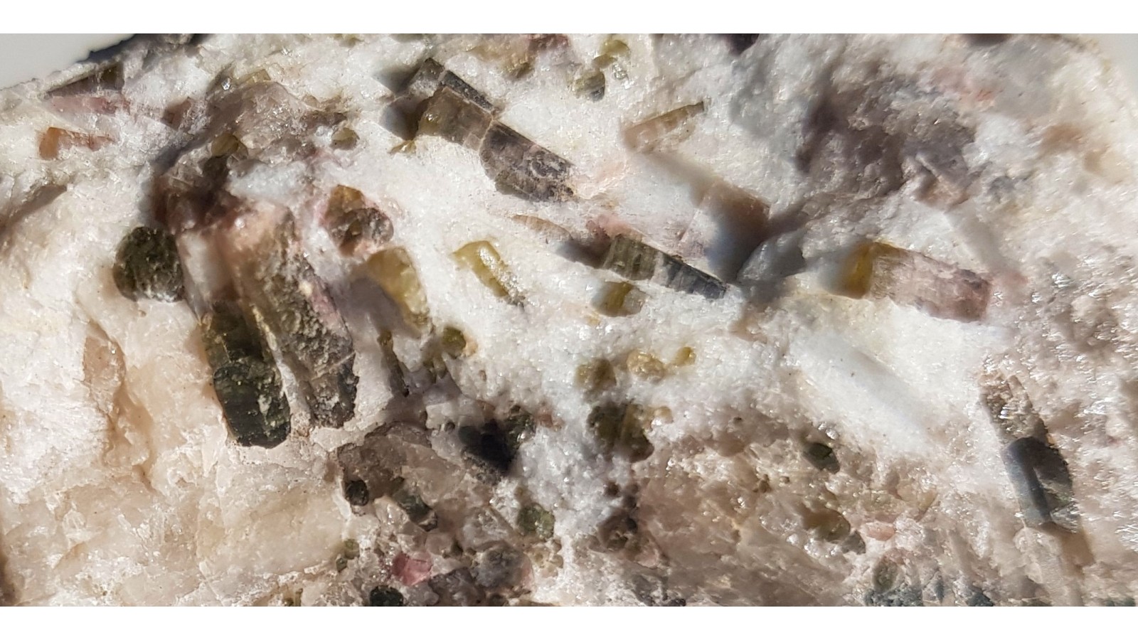 Bardzo estetyczny okaz barwnego elbaitu (turmalin litowy) z Piławy Górnej w Górach Sowich. Niewielkie, lecz całe i liczne kryształy wrośnięte w pegmatyt. Barwa zielona i różowa. Rzadkość mineralogiczna z dotychczas jedynego znanego w polskich Sudetach stanowiska turmalinów litowych. Polecam.