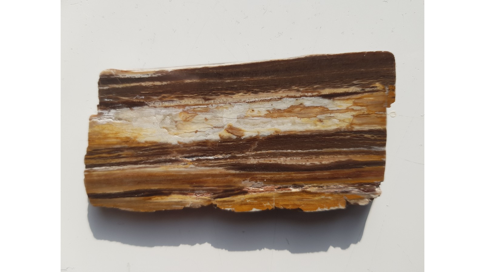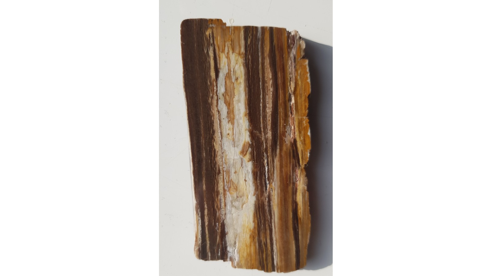 Polerowany okaz drewna skrzemieniałego o kontrastowym deseniu. Polecam.
