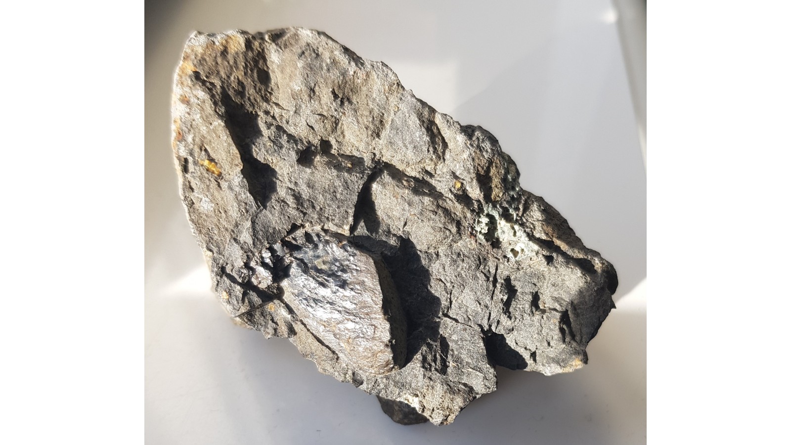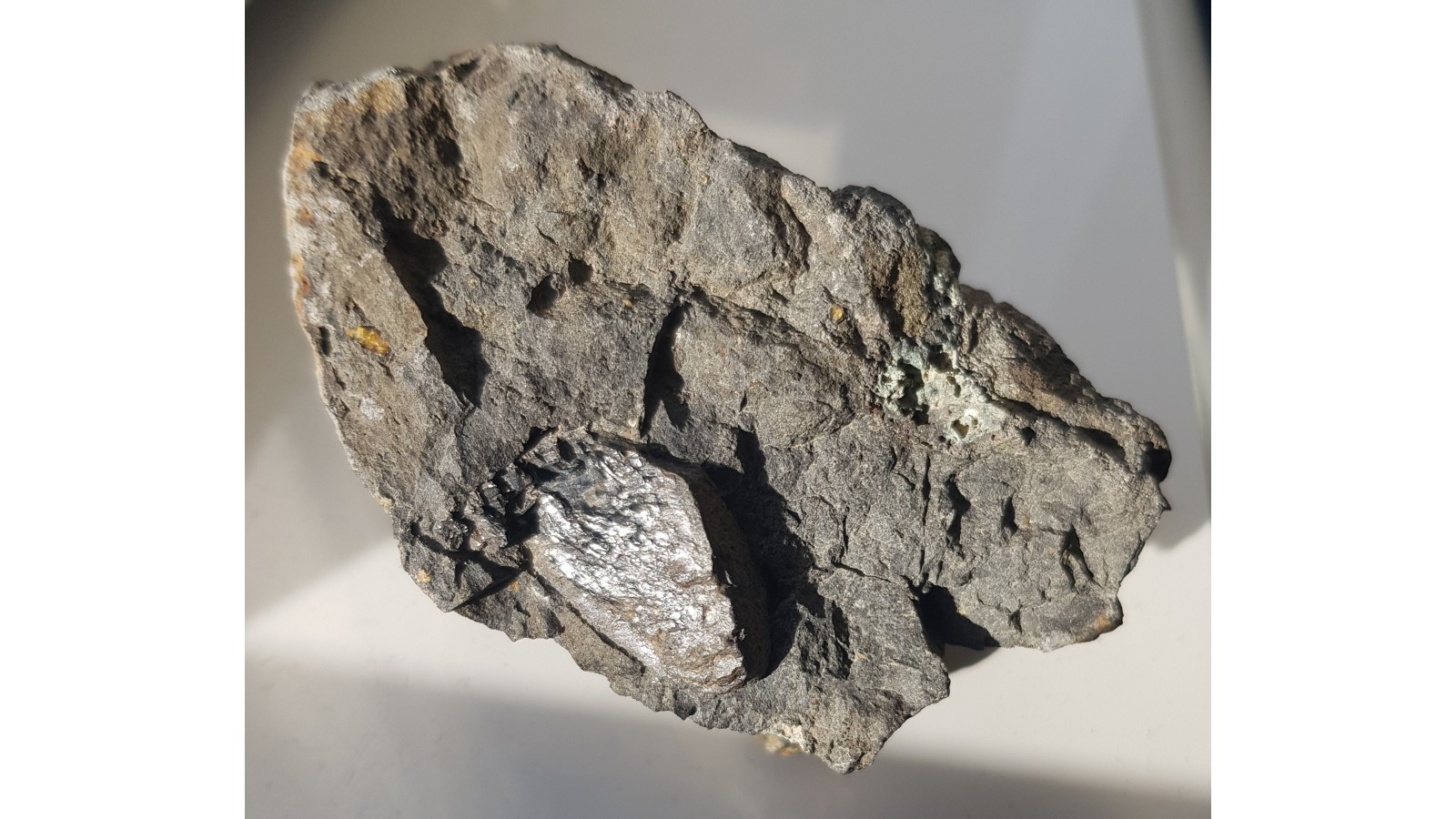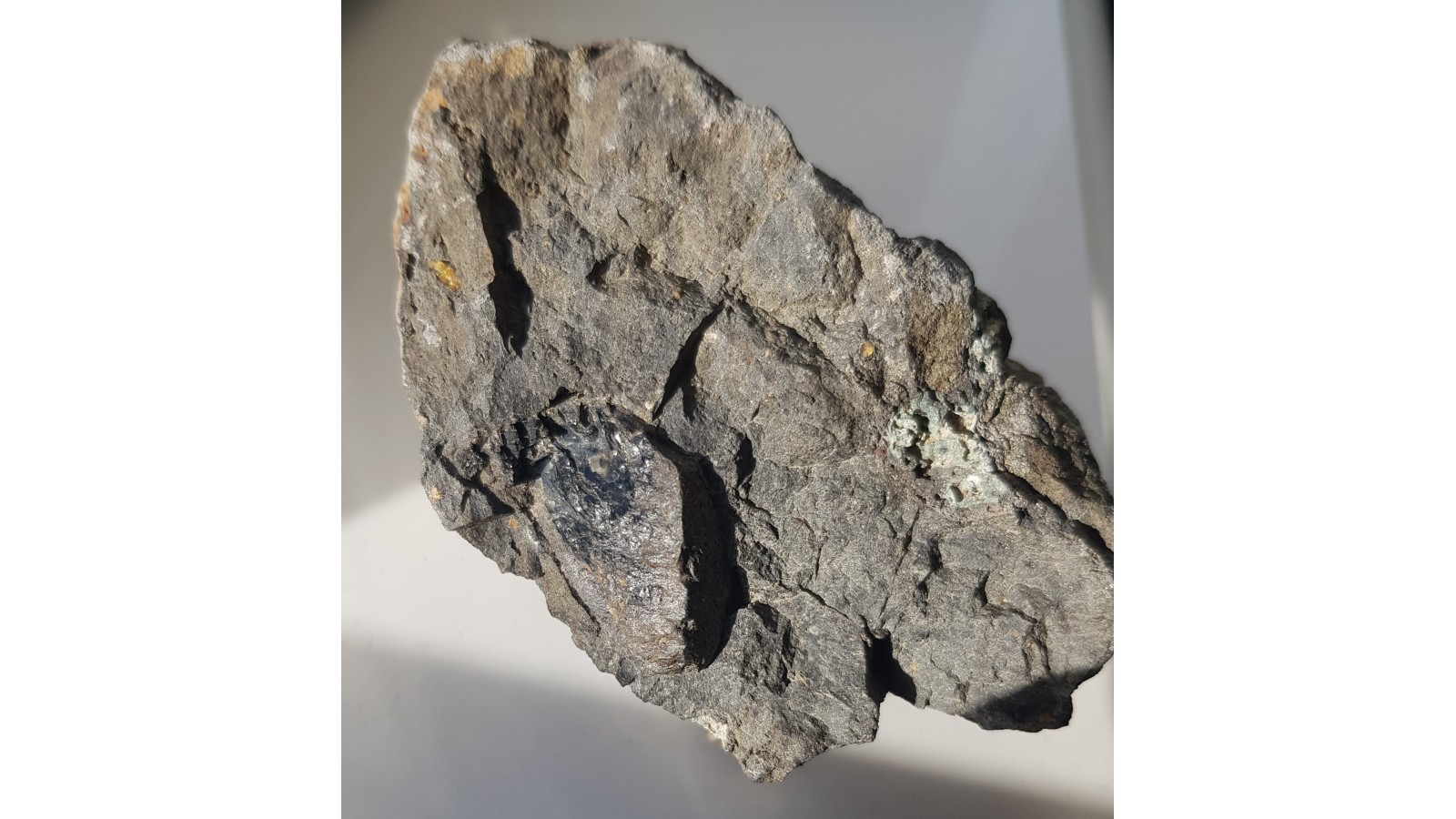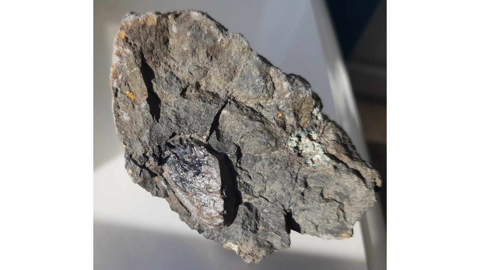 Okaz bazaltu z dużym kryształem piroksenu z Lutyni k. Lądka Zdr. Owalny kształt piroksenu sugeruje obce w stosunku do magmy bazaltowej pochodzenie i późniejszą resorpcję, korozję magmową. Wewnątrz kryształ świeży, z połyskiem. Sam ksenokryształ ma 3 cm długości. Ciekawostka mineralogiczna z Kotliny Kłodzkiej. Polecam.