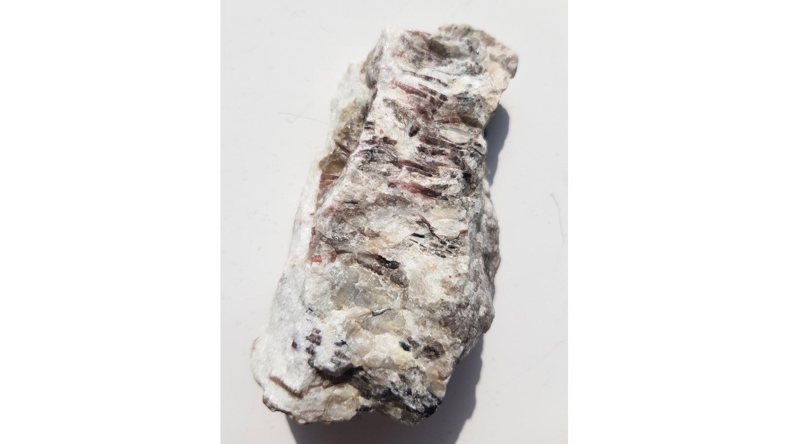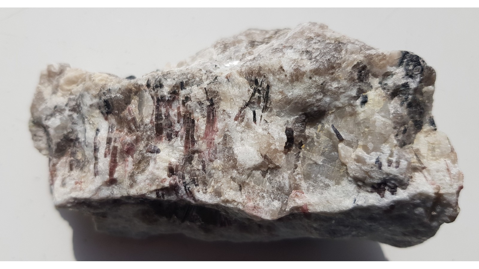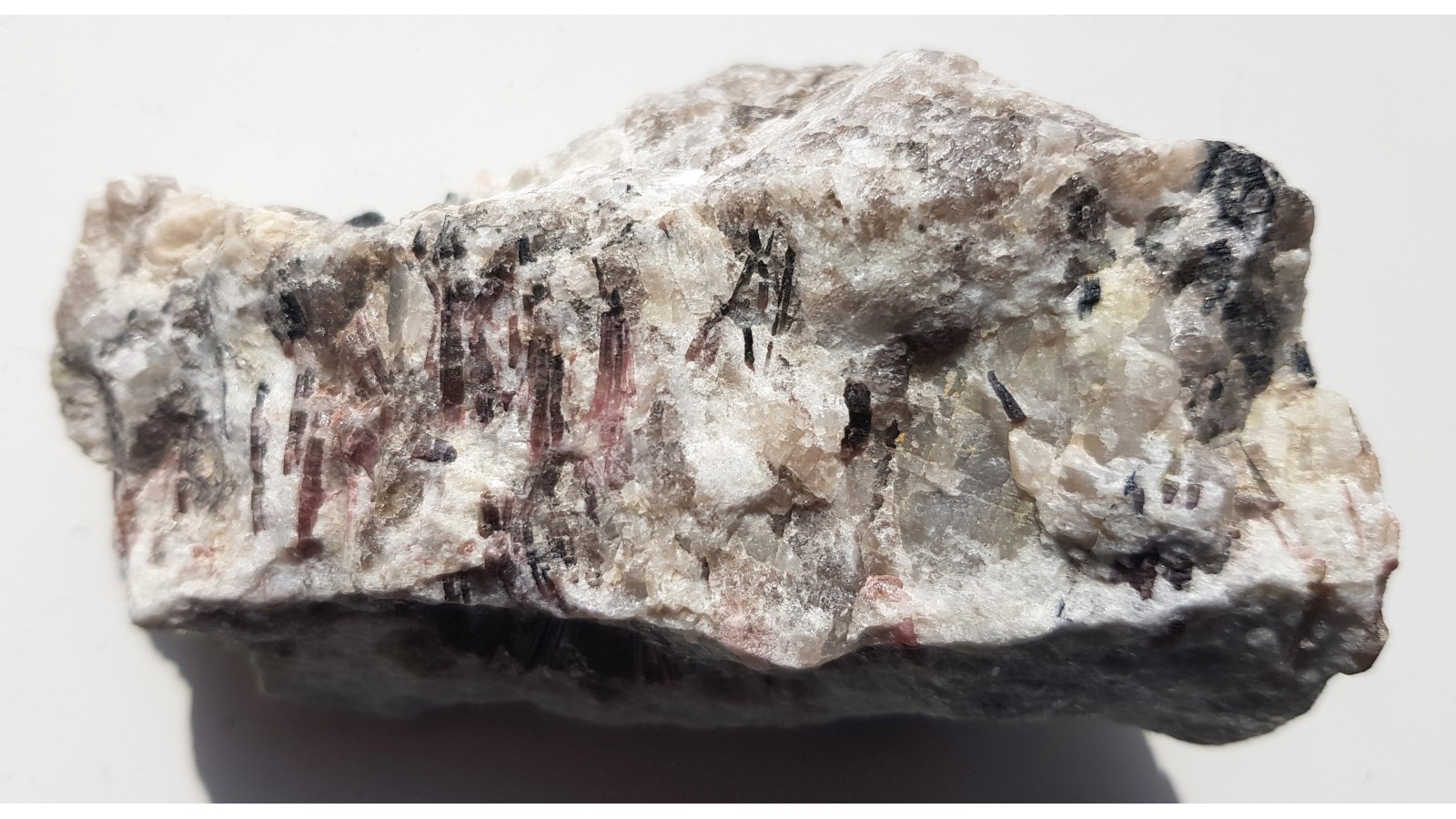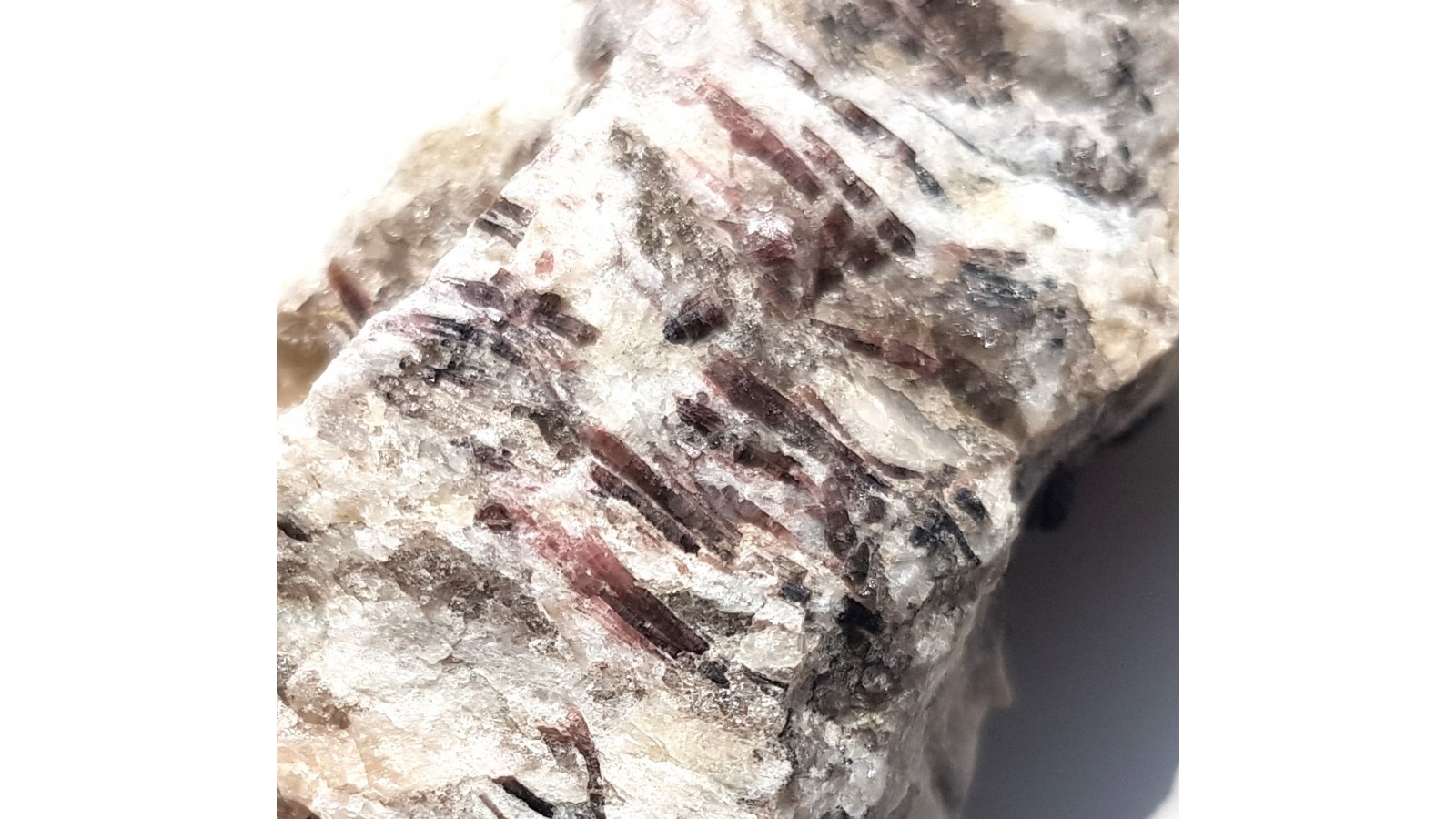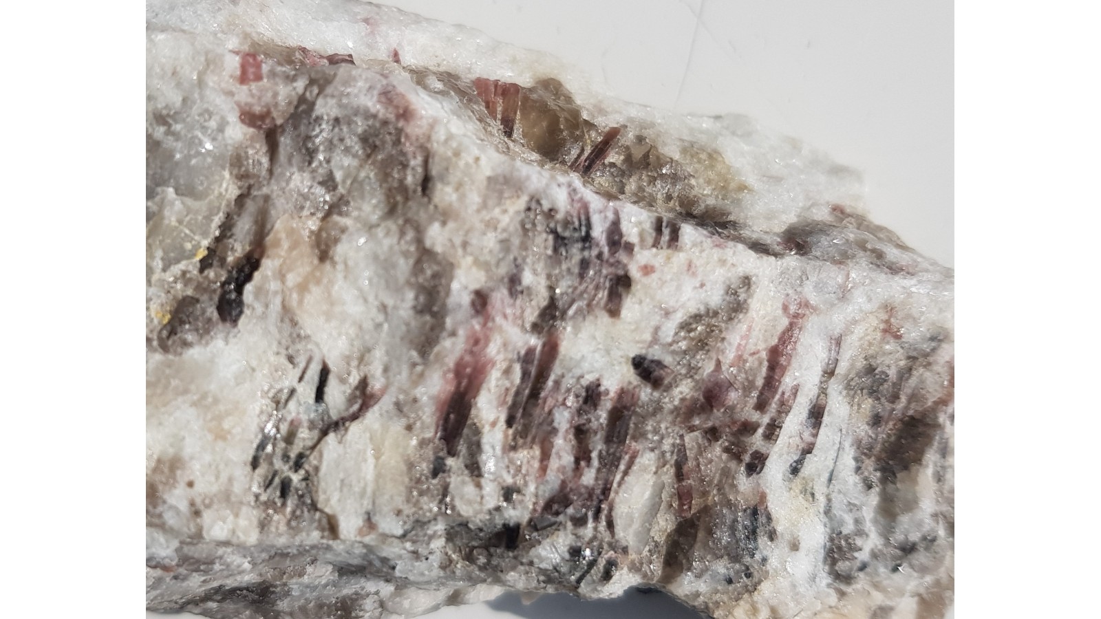 Okaz barwnych elbaitów (turmalin litowy) z Piławy Górnej w Górach Sowich. Liczne kryształy o długości ok. 1 cm o zabarwieniu różowym i zielonym w pegmatycie. Bardzo dobrze wykształcone, całe. Rzadkość mineralogiczna z dotychczas jedynego znanego w polskich Sudetach stanowiska turmalinów litowych. Okaz bardzo estetyczny. Polecam.