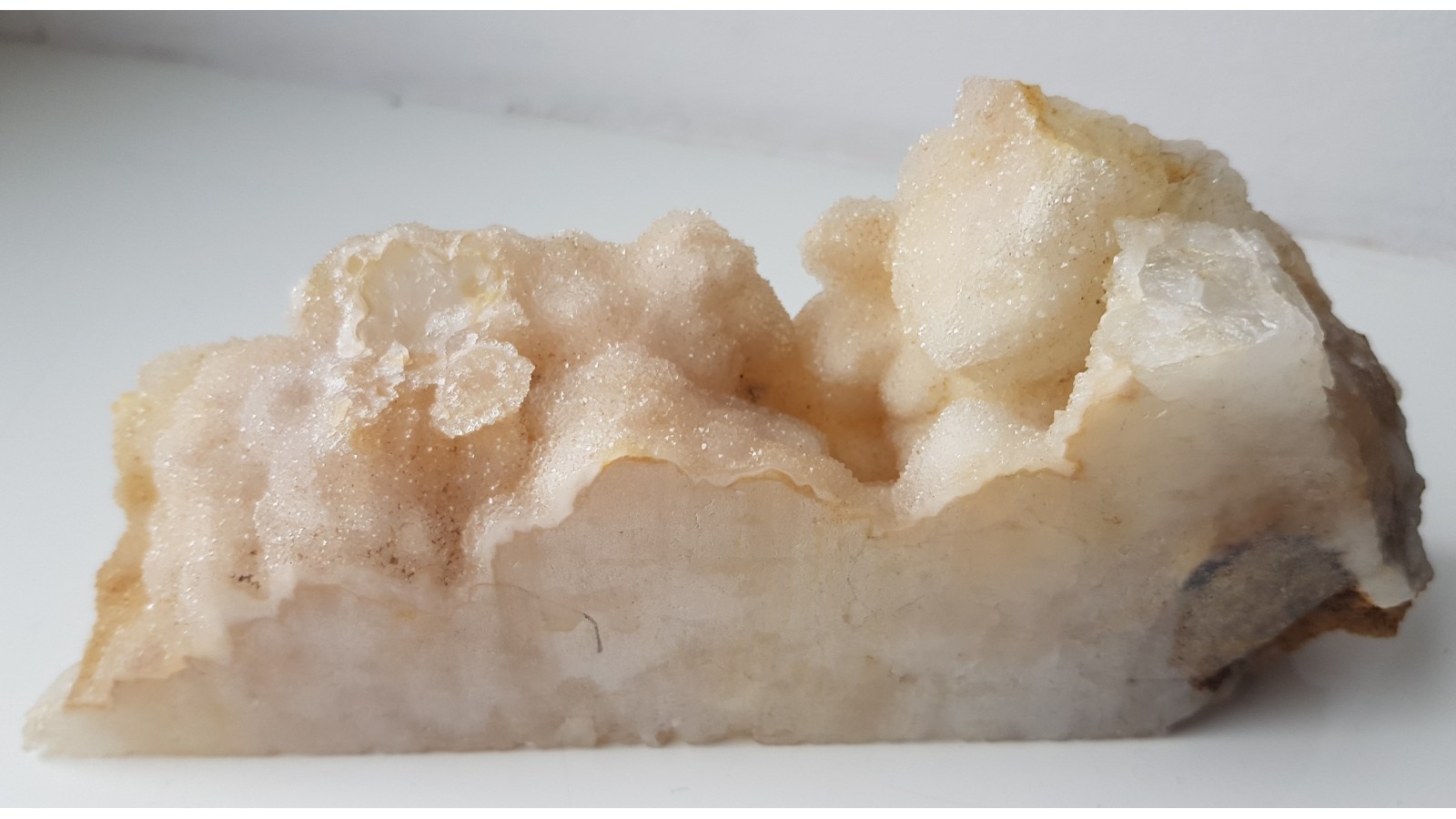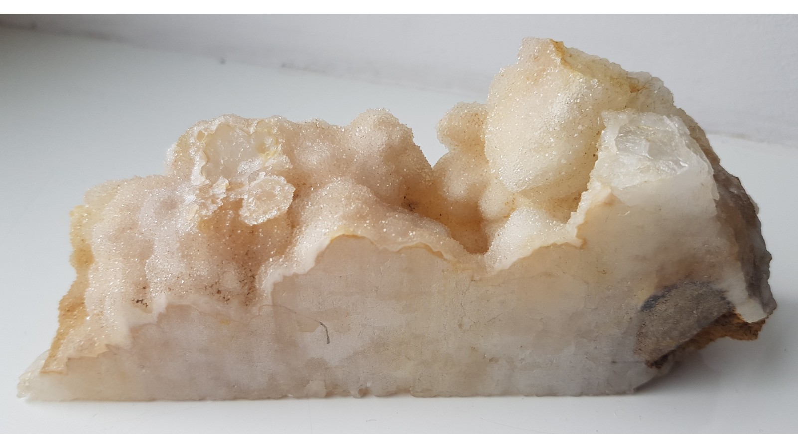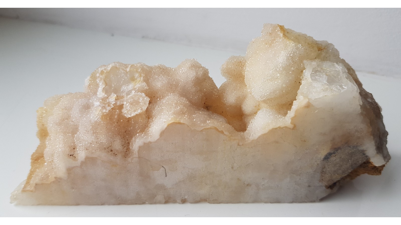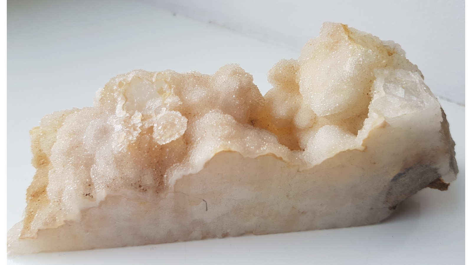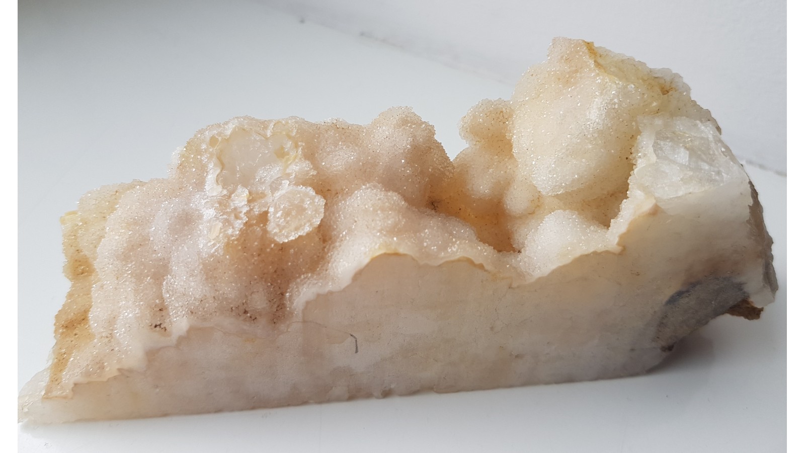 Niezwykłe kwarce ze Sławniowic (Sudety Wschodnie). Okaz ze złoża marmurów i dolomitów Południowej Opolszczyzny. Niezwykłość okazu polega na tym, że szczotki kwarcowe będące tutaj bazą zostały pokryte przez drobnokrystaliczny kwarc. Znalezisko sprzed około 10-ciu lat. Polecam.