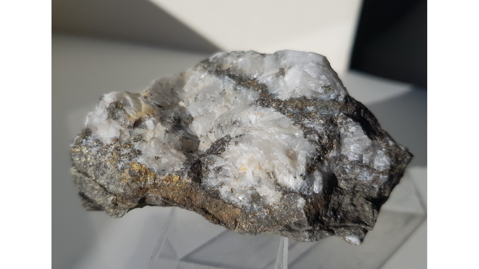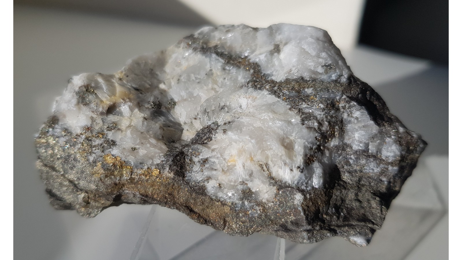 Obfite wydzielenia pirytu w masywnym barycie. Piryt całkowicie niezwietrzały, z różnobarwnymi nalotami. Okaz z Piskrzyna, z kopalni dolomitu w Górach Świętokrzyskich, która dotychczas nie była źródłem materiału mineralogicznego. Ciekawostka regionalna. Polecam.