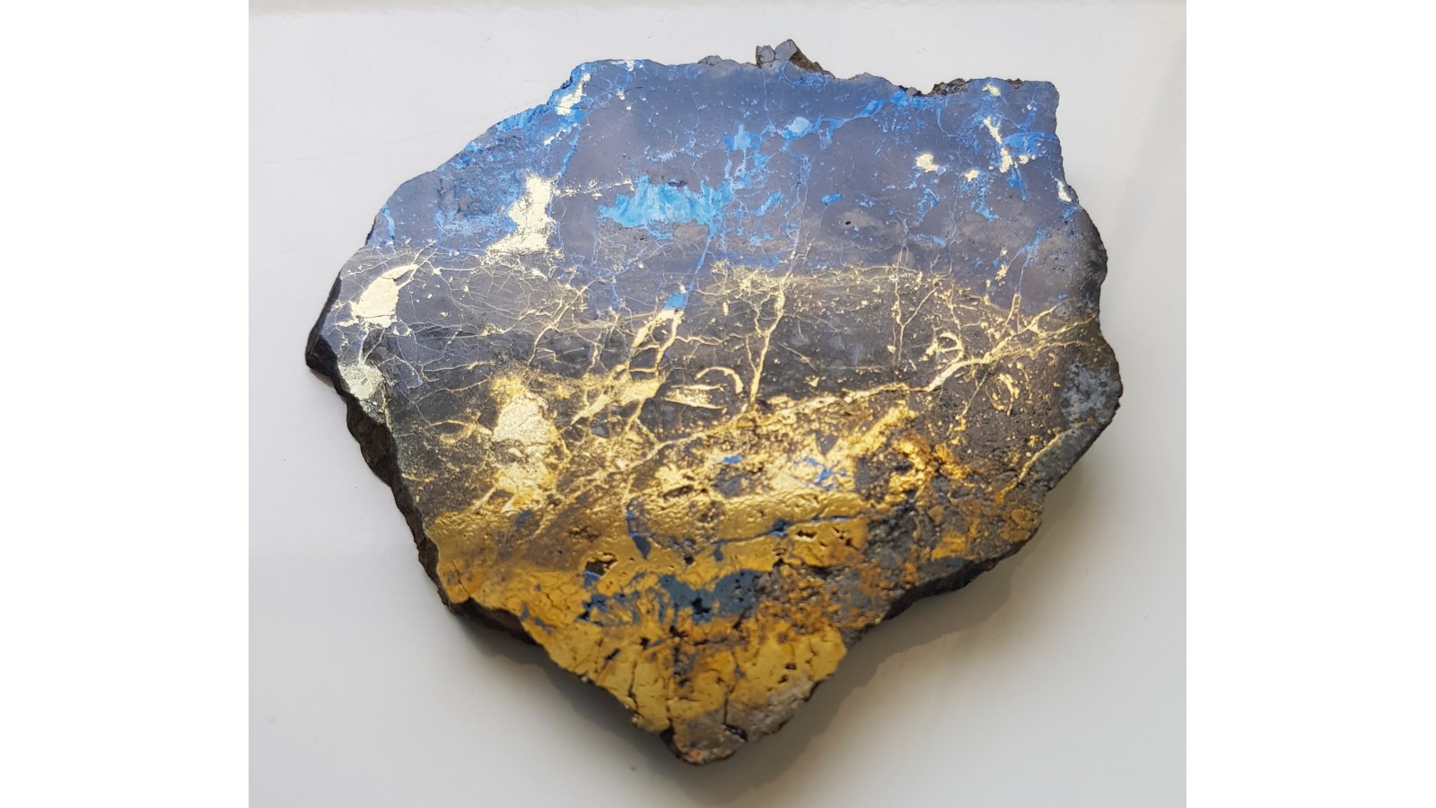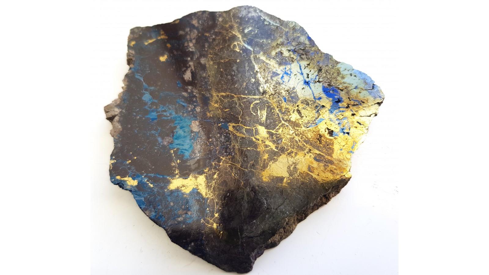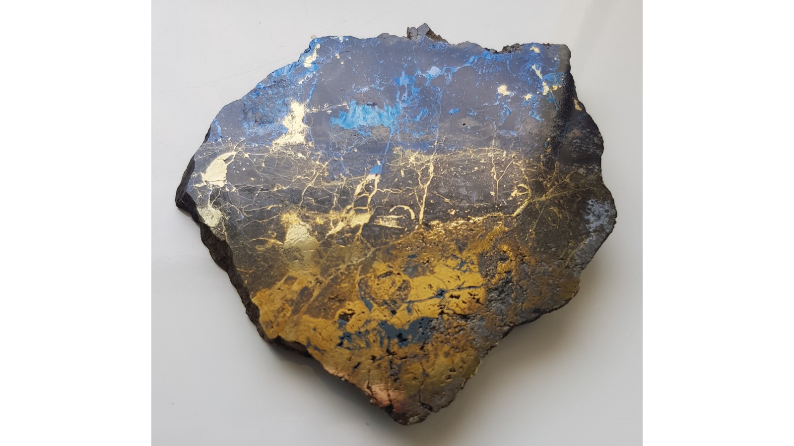 Piękny okaz polerowanego kowelinu z chalkopirytem z Lubina. Idealny poler. Strona przeciwna po cięciu. Bardzo estetyczny okaz. Polecam.