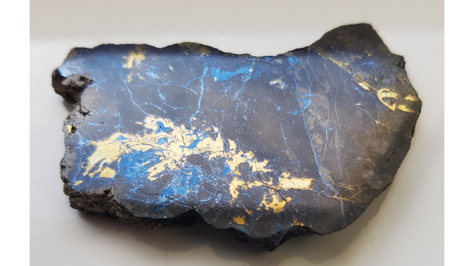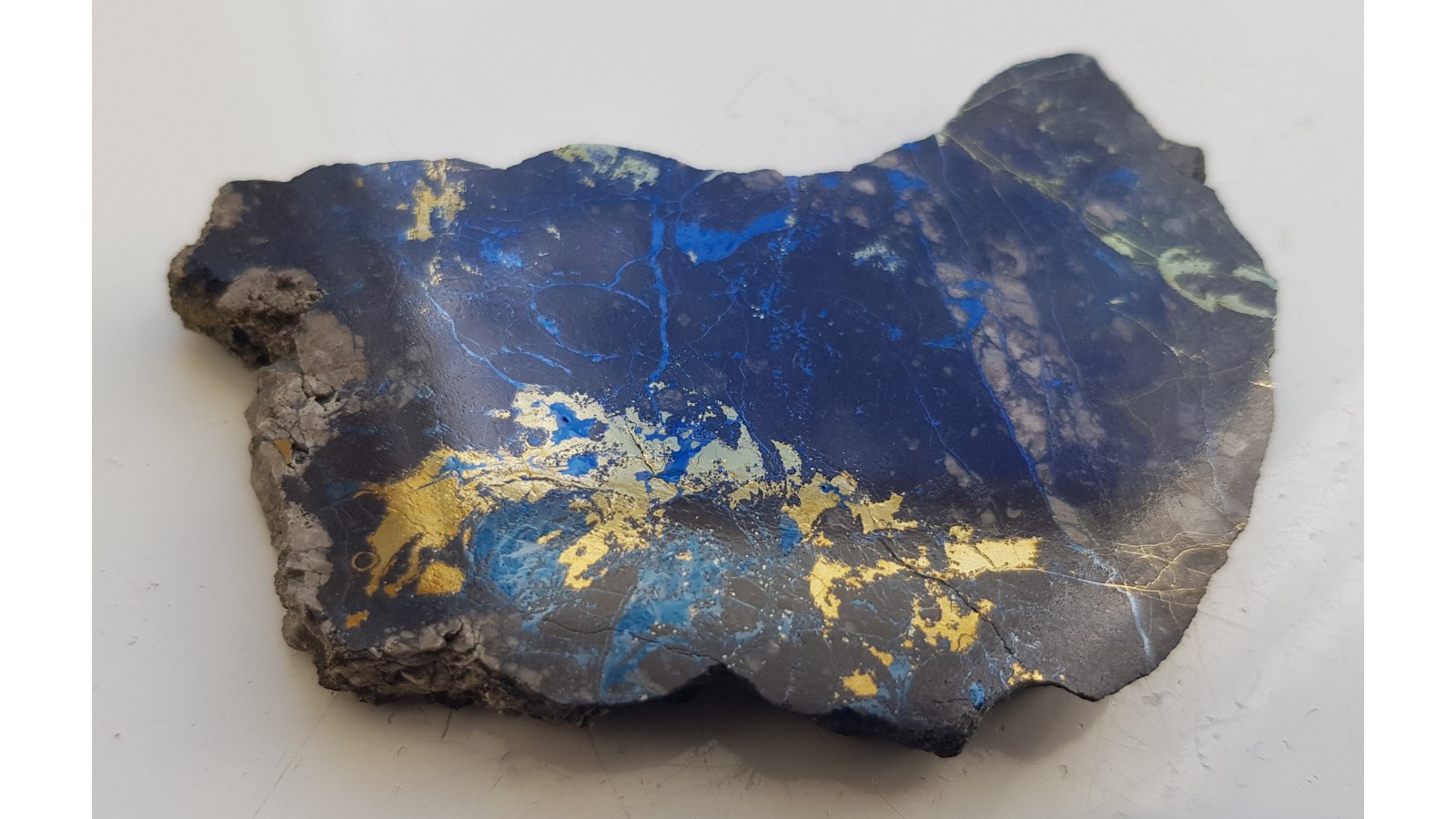 Piękny okaz polerowanego kowelinu z chalkopirytem z Lubina. Idealny poler. Strona przeciwna po cięciu. Bardzo estetyczny okaz. Polecam.