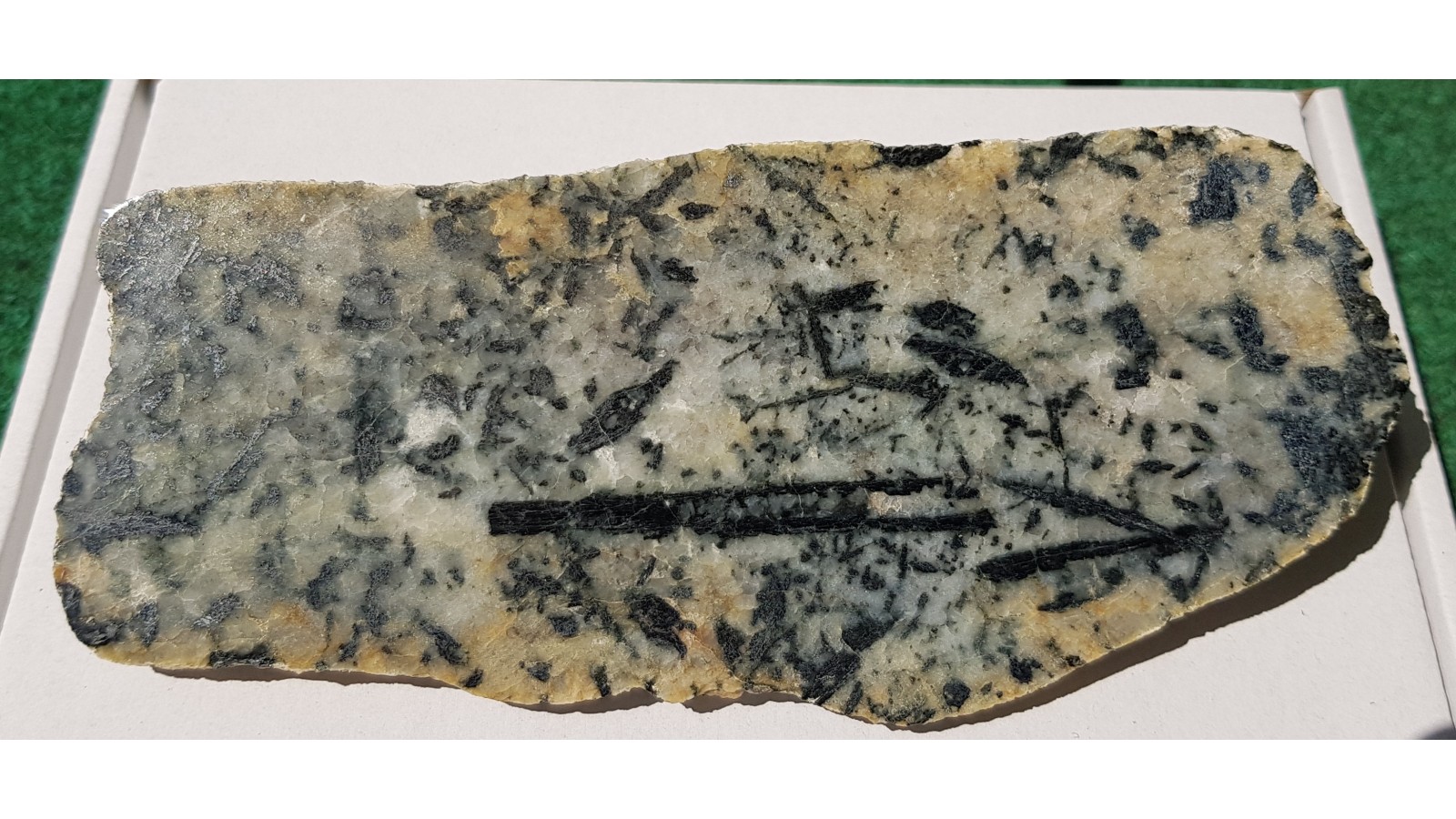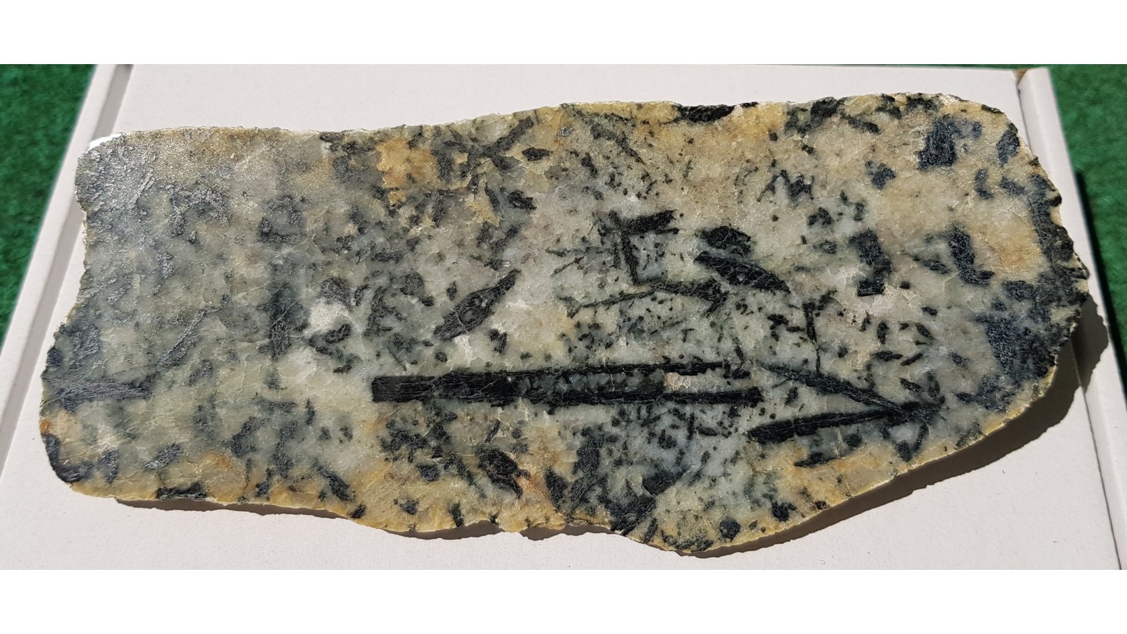 Niezwykła skała plagioklazowo-amfibolowa znaleziona w okolicach Cedyni (zachodniopomorskie). Najdłuższy, listwowaty amfibol wykazuje iryzację. Wyjątkowa skała. Poler jednostronny, strona przeciwna naturalna, z widocznymi listewkami amfiboli na jasnym tle. Polecam.