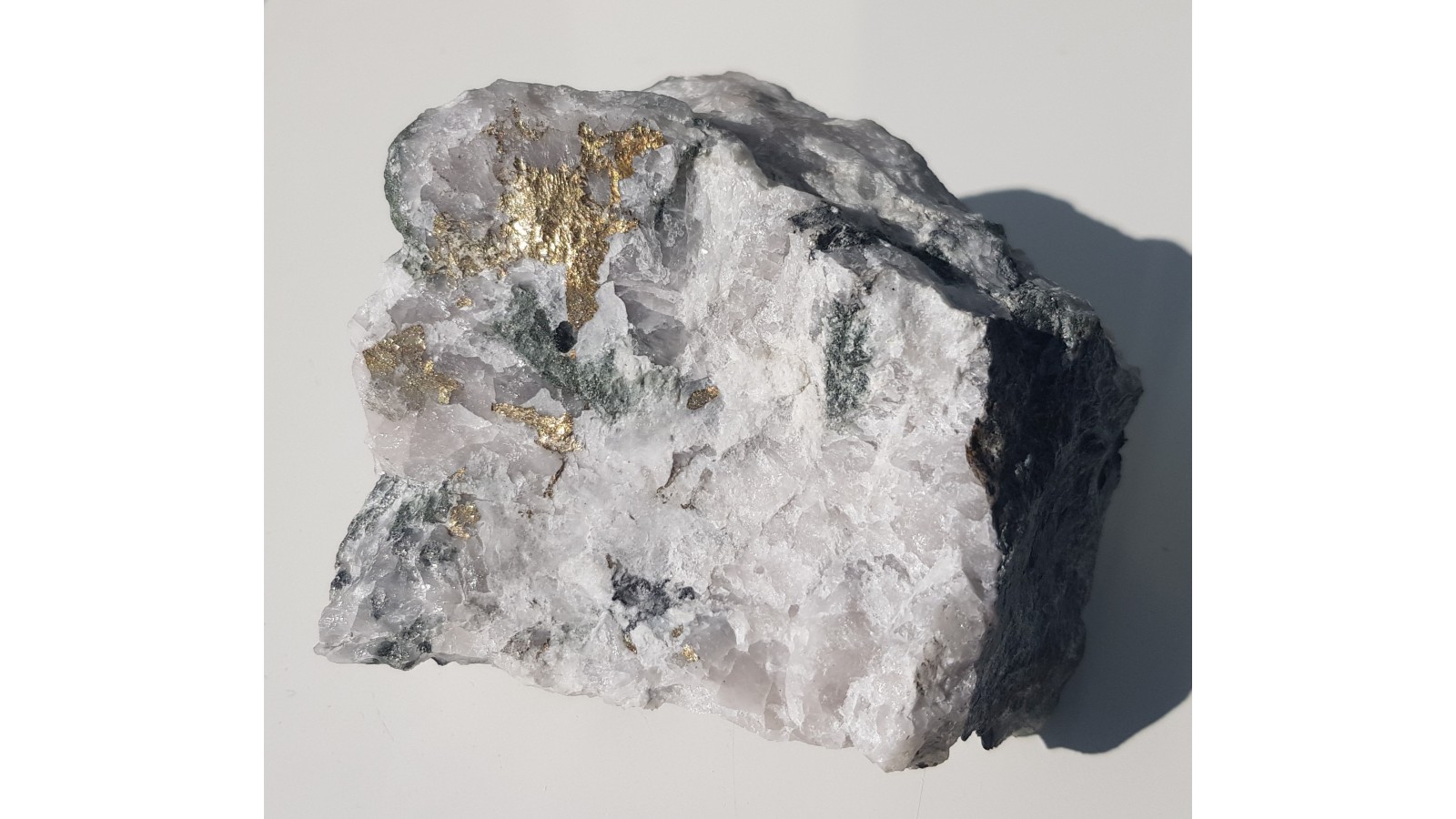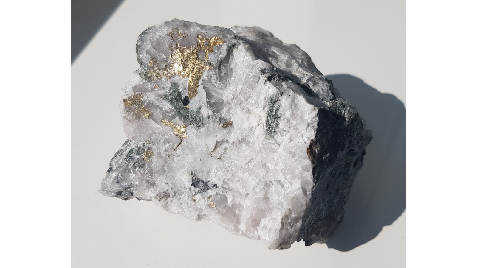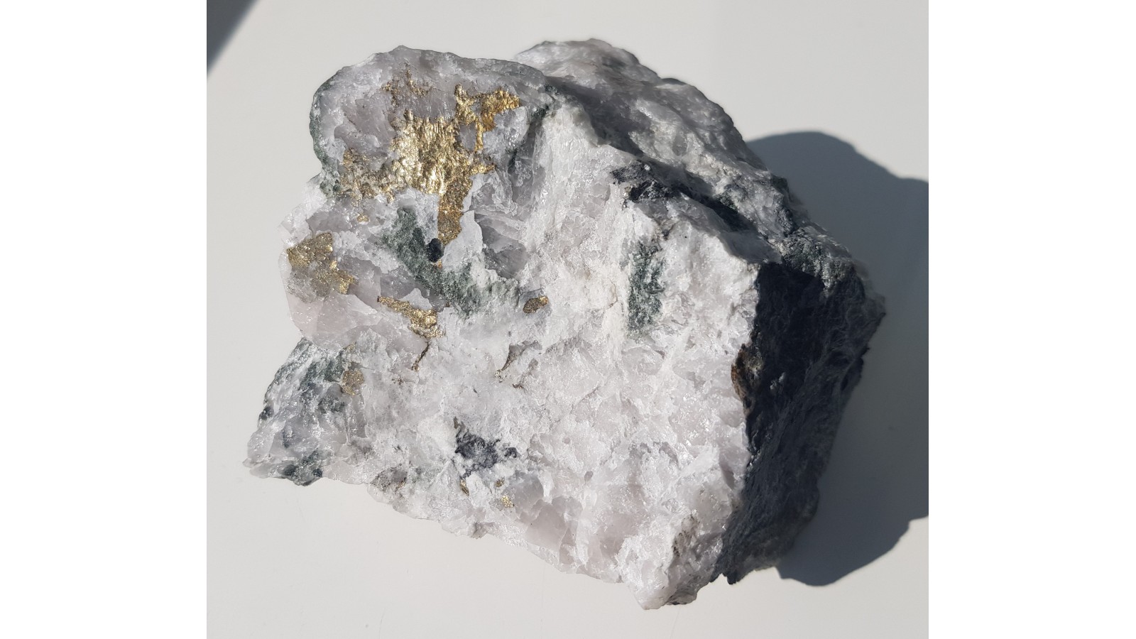 Okaz świeżego, nie zwietrzałego pirytu jako powłoki na czystym kwarcu z kamieniołomu łupków fyllitowych w Jarnołtówku. Estetyczny, dobra wielkość. Polecam.