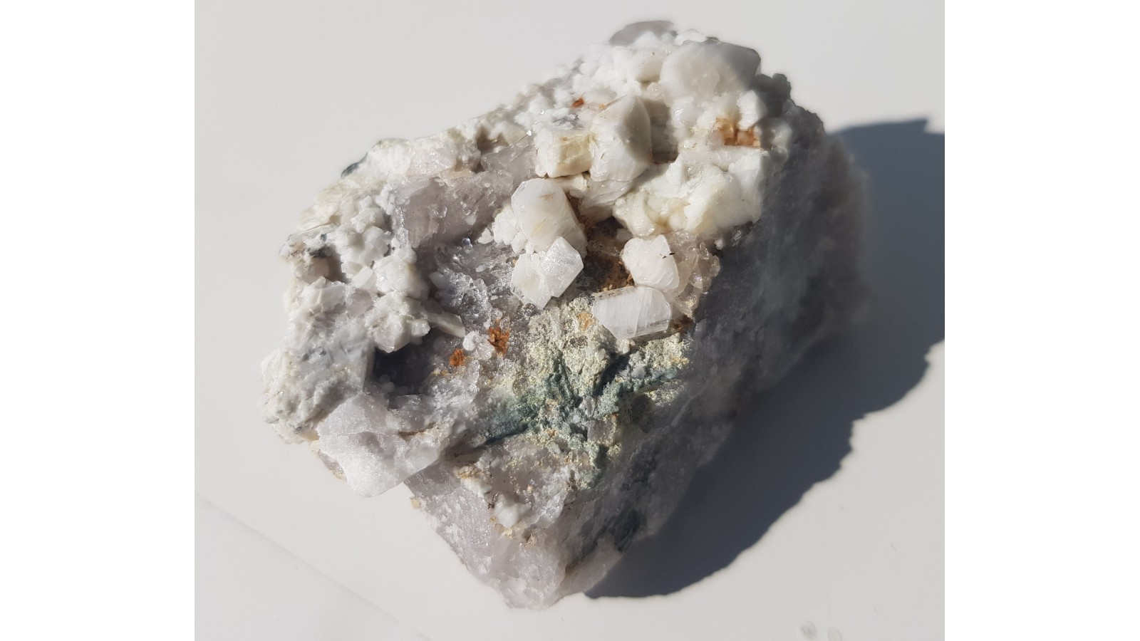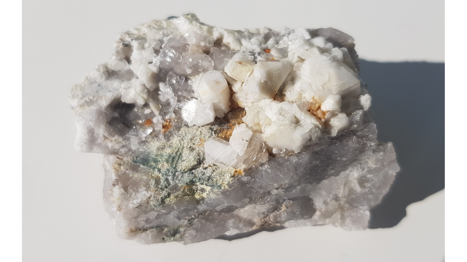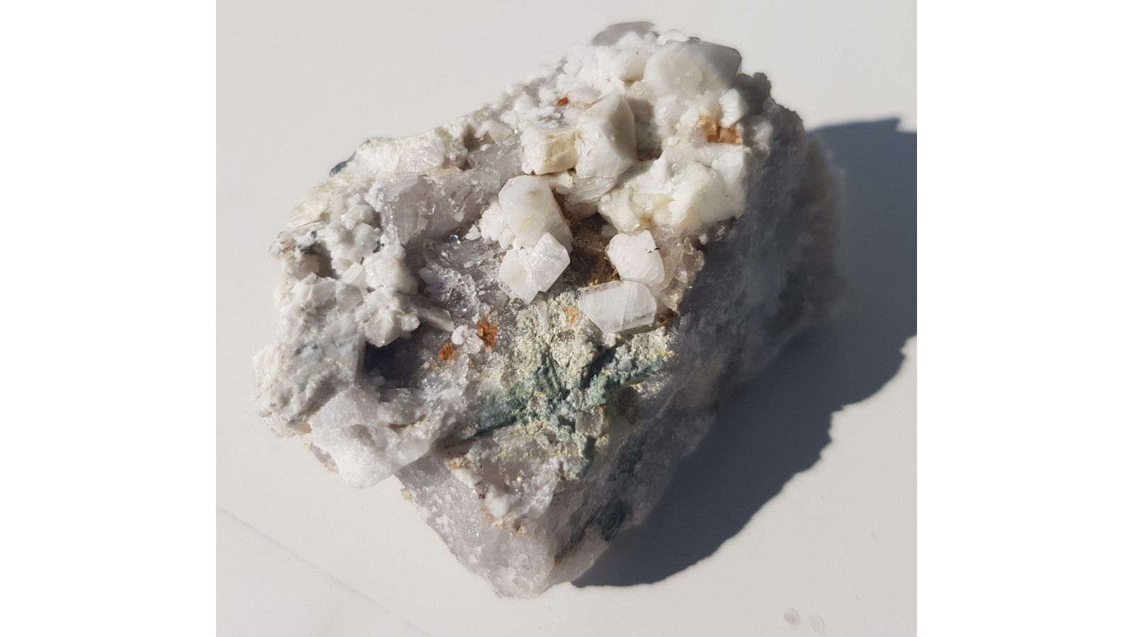 Niewielka szczotka pięknie wykształconych skaleni, śnieżnobiałych, również lekko przezroczystych, na skale macierzystej z kamieniołomu łupków fyllitowych w Jarnołtówku. Estetyczny okaz, kryształy całe, nieuszkodzone. Polecam.