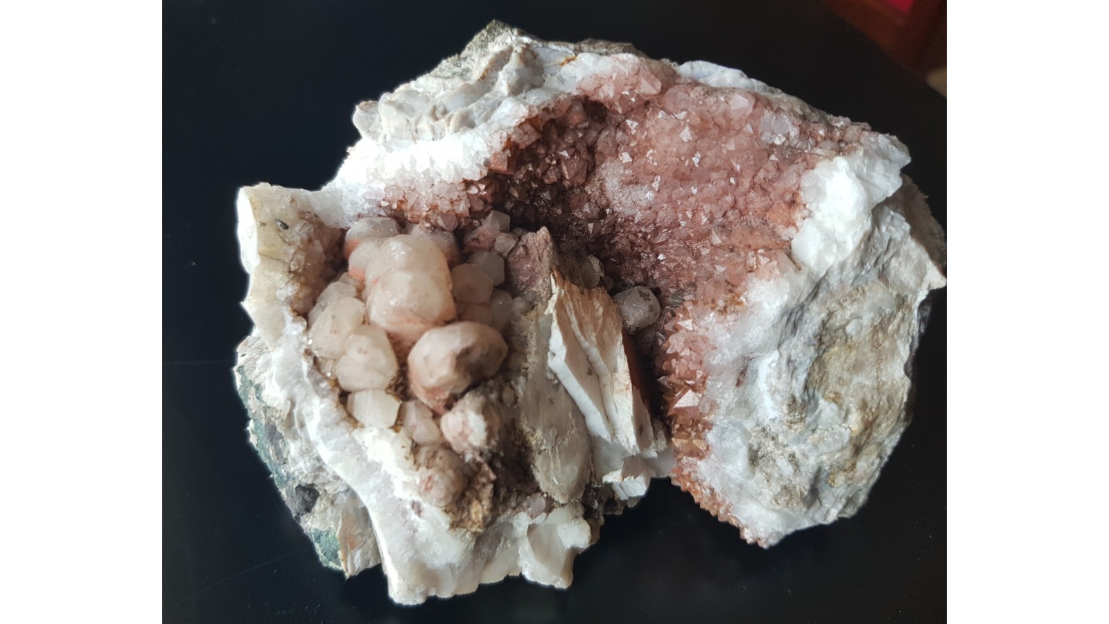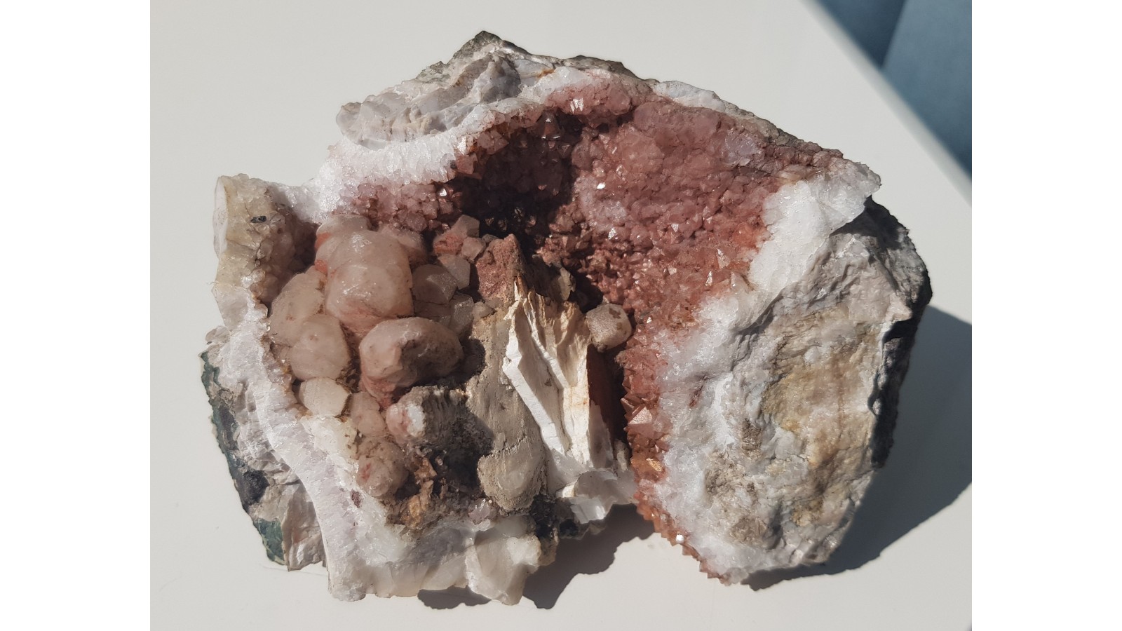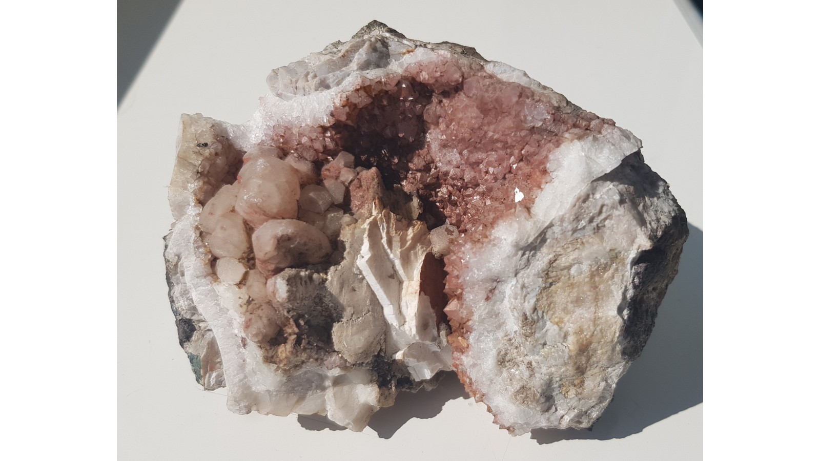 Dosyć duża geoda z kwarcem pokrytym hematytem, barytem i kryształami kalcytu z Lubiechowej. Duży, spektakularny okaz. Polecam.