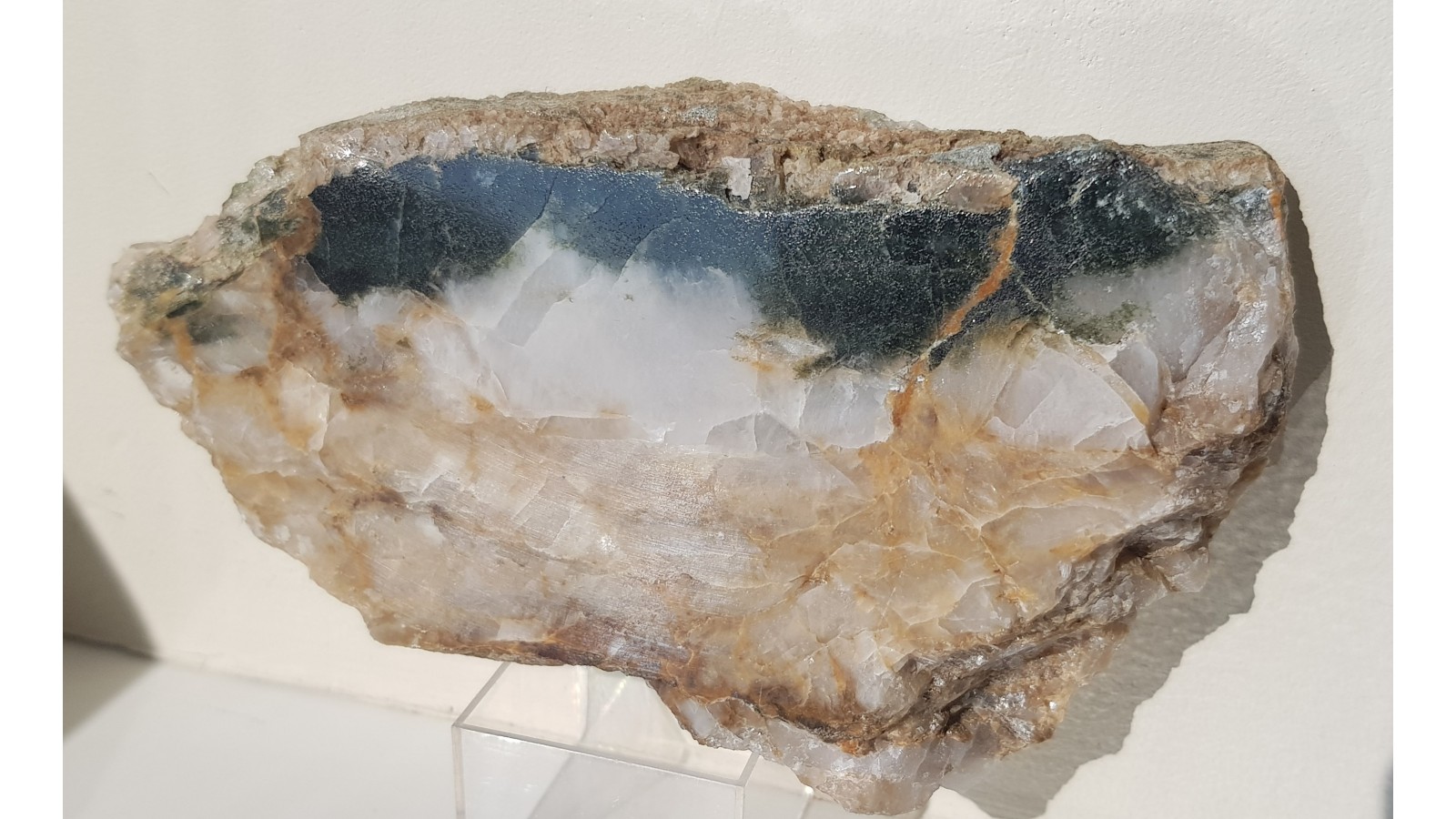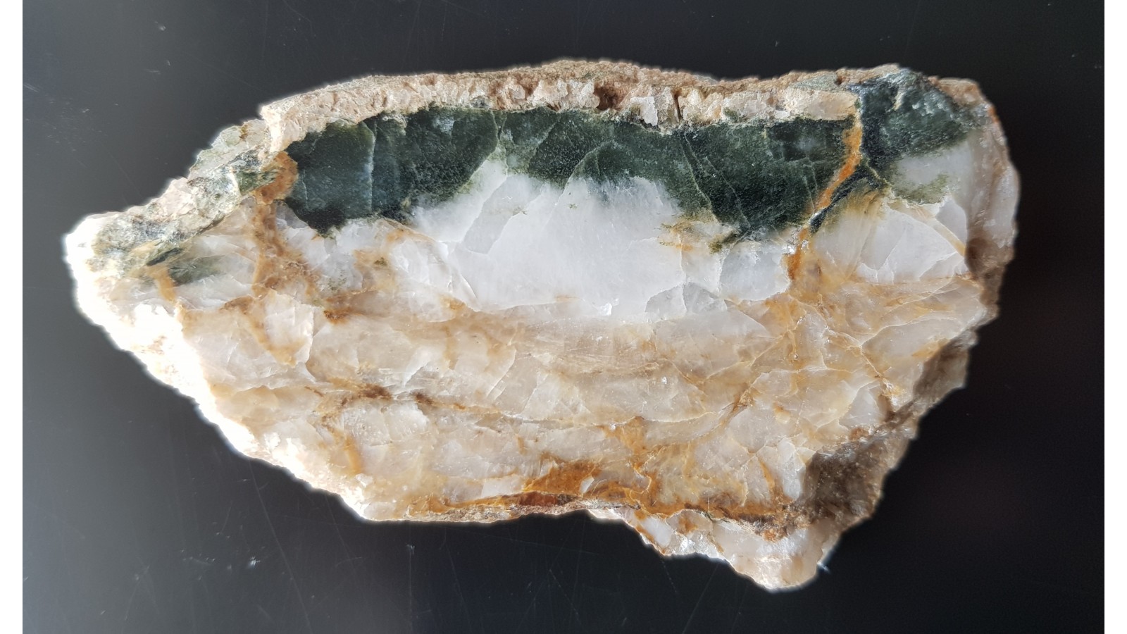 Kwarc prazowy w żyle kwarcowo-węglanowej z Pokrzywnej w Górach Opawskich (Sudety Wschodnie, Opolszczyzna). Kwarc intensywnie zabarwiony, ciemnozielony, wskutek obecności inkluzji chlorytów. Żyły kwarcowe, na ogół jedynie masywnego kwarcu mlecznego, pojawiają się w tzw. warstwach andelohorskich, w skład których wchodzą głównie szarogłazy oraz fyllity a podrzędnie, lokalnie metabazyty. Okaz polerowany jednostronnie. Idealny poler. Strona przeciwna po cięciu. Ciekawostka. Polecam.