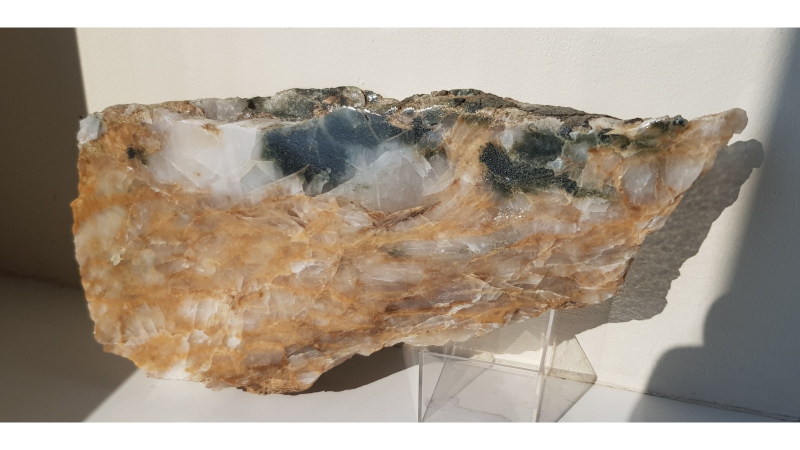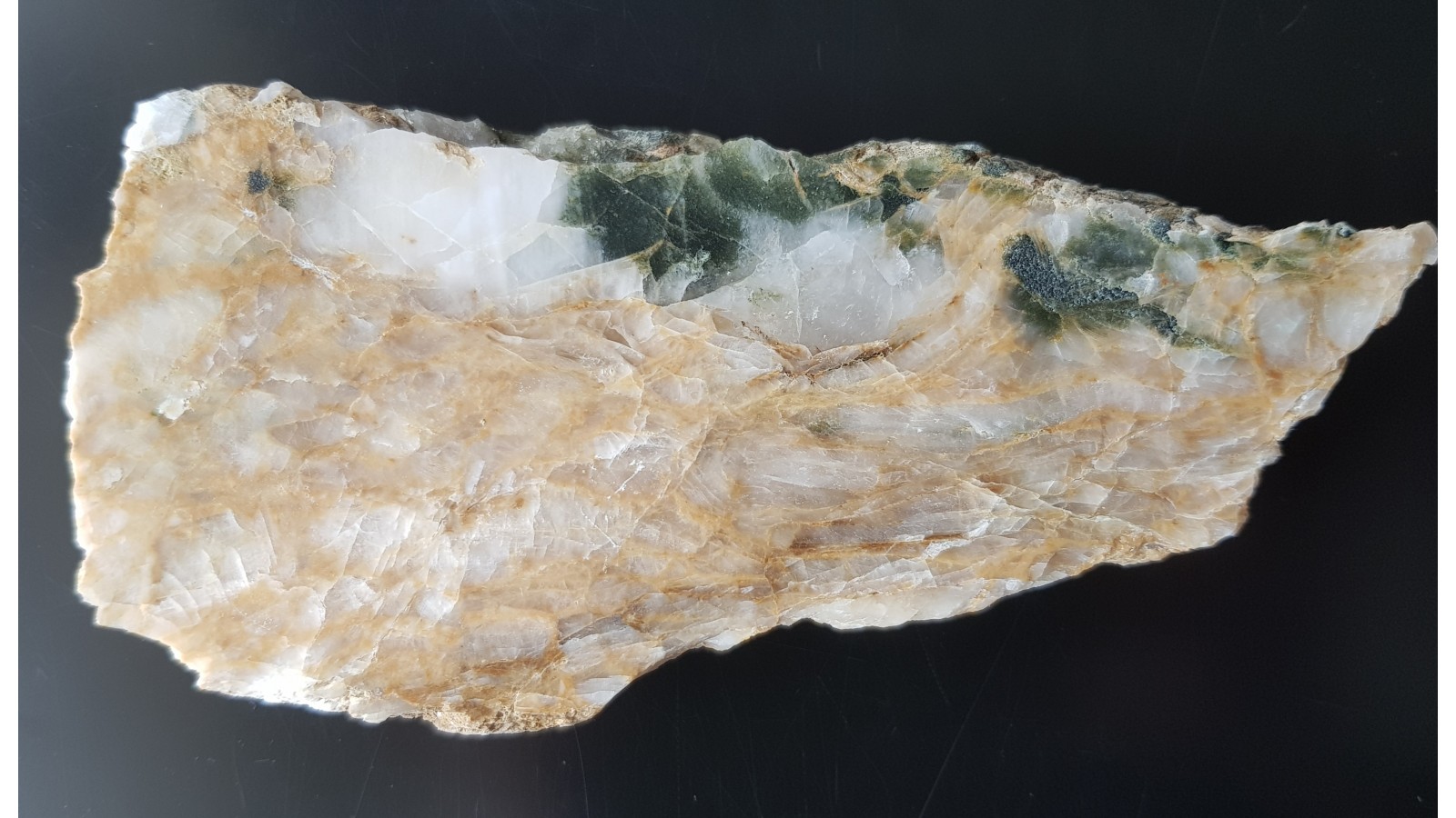 Kwarc prazowy w żyle kwarcowo-węglanowej z Pokrzywnej w Górach Opawskich (Sudety Wschodnie, Opolszczyzna). Kwarc intensywnie zabarwiony, ciemnozielony, wskutek obecności inkluzji chlorytów. Żyły kwarcowe, na ogół jedynie masywnego kwarcu mlecznego, pojawiają się w tzw. warstwach andelohorskich, w skład których wchodzą głównie szarogłazy oraz fyllity a podrzędnie, lokalnie metabazyty. Okaz polerowany jednostronnie. Idealny poler. Strona przeciwna po cięciu. Ciekawostka. Polecam.